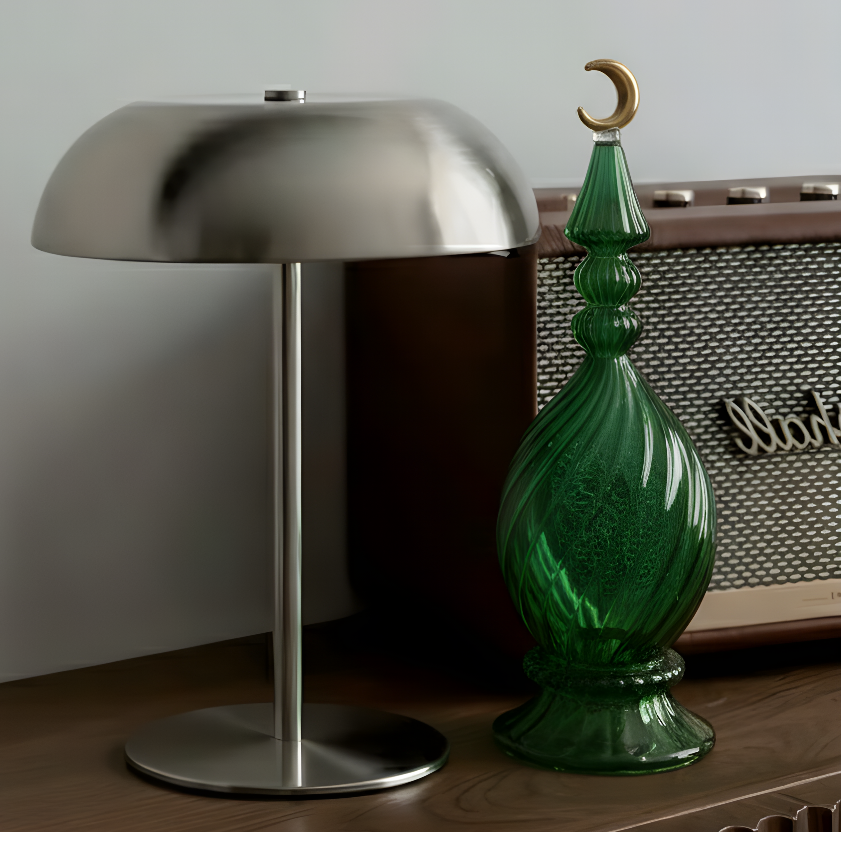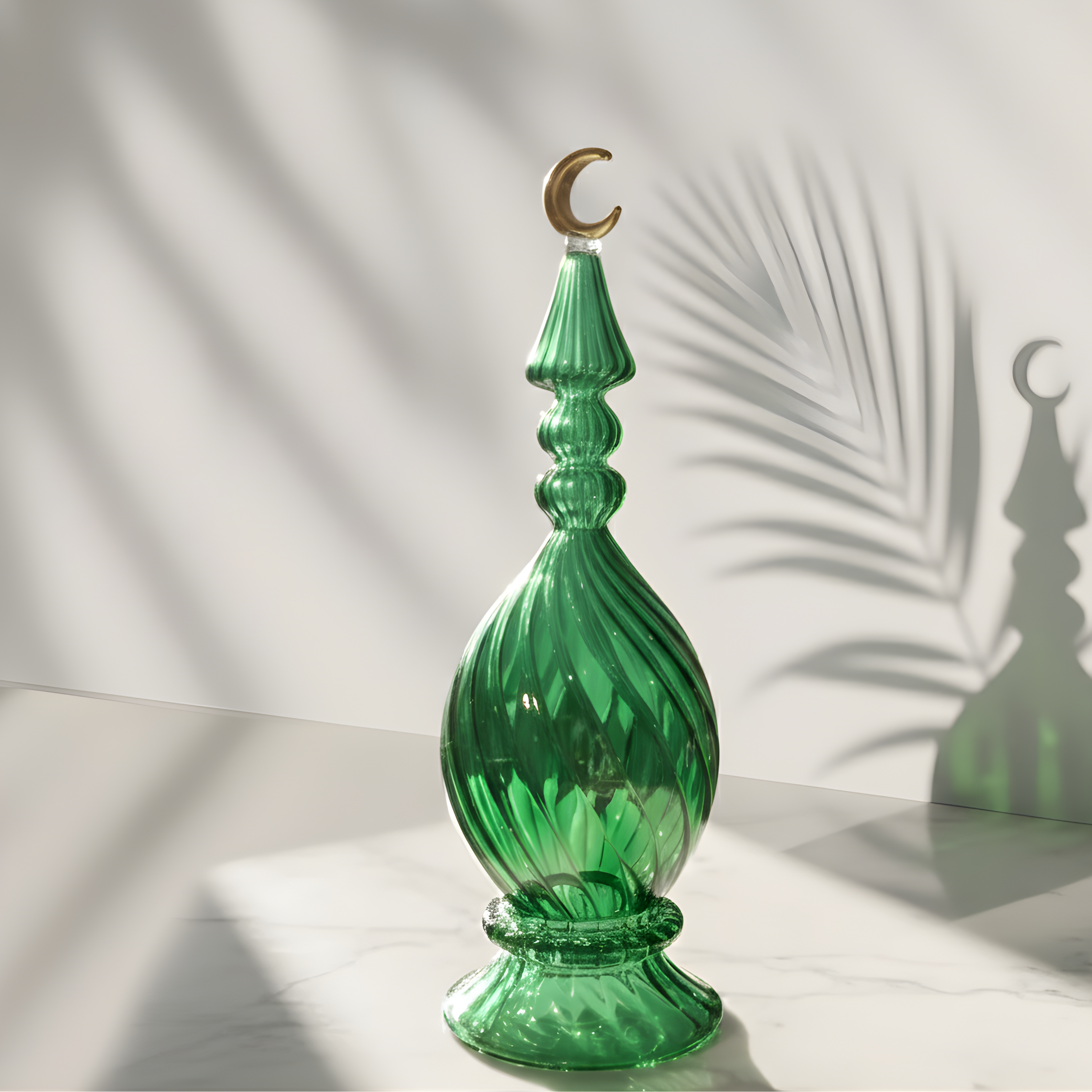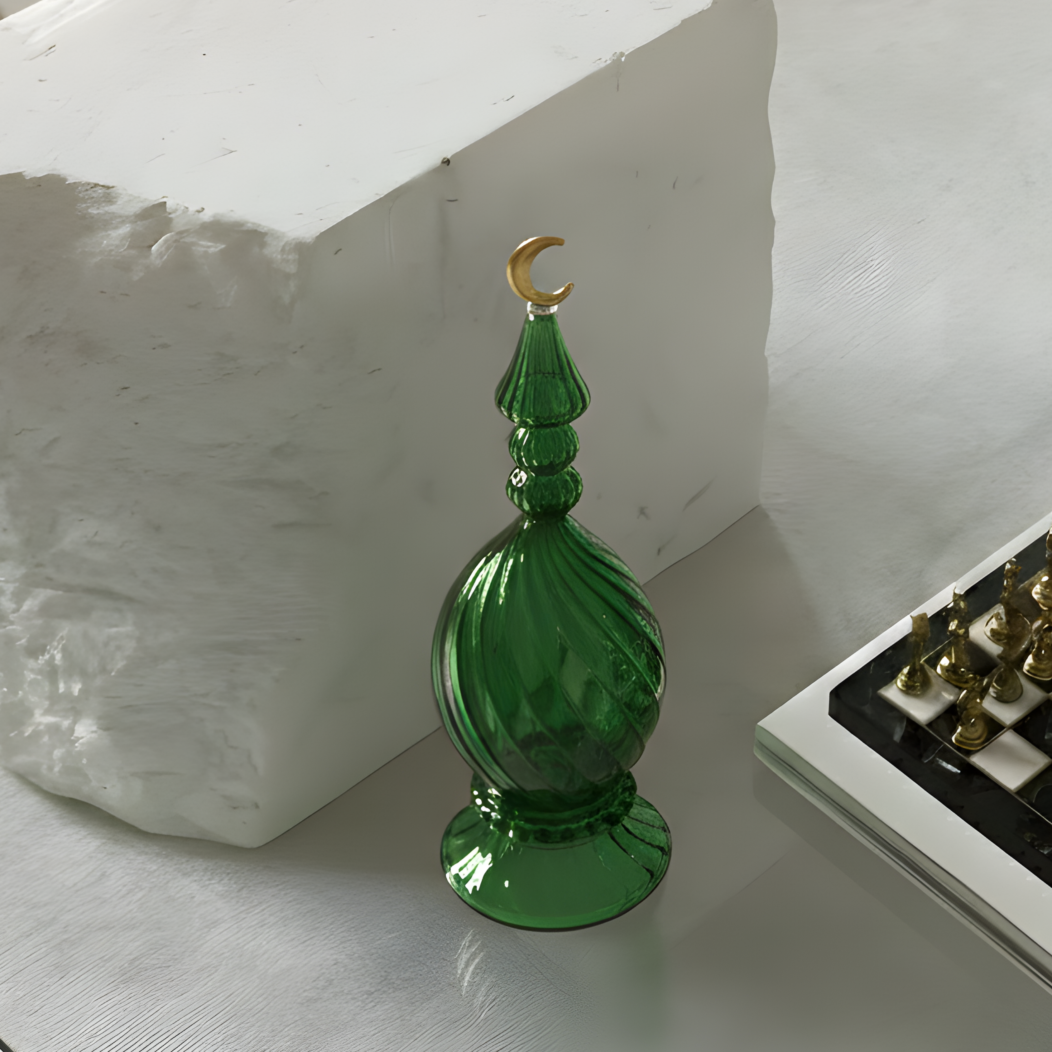 Crafted as a refined decorative sculpture, this crescent piece balances sculptural form with delicate detailing. The colored glass body introduces depth and light interaction, while the crescent accent adds a subtle symbolic presence. Its vertical silhouette creates a calm focal point, designed to exist quietly within the space rather than dominate it.