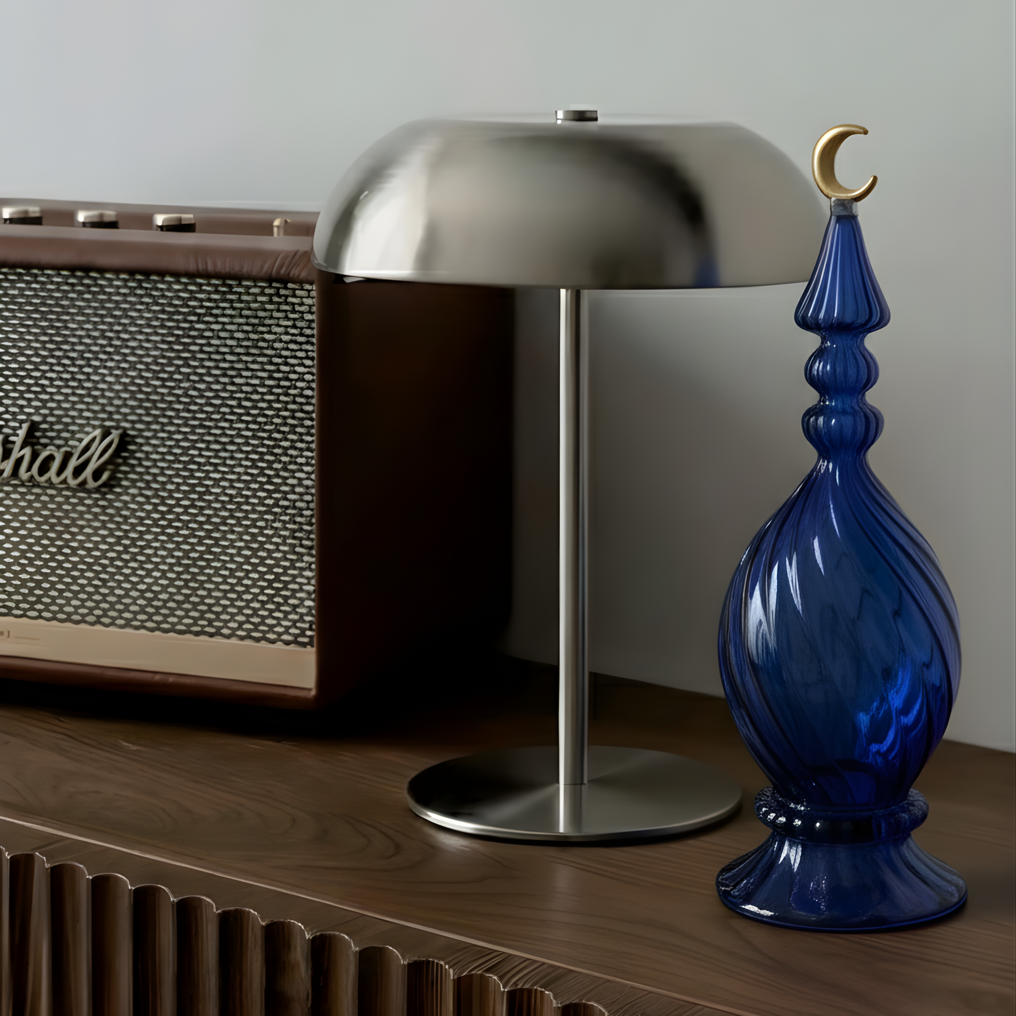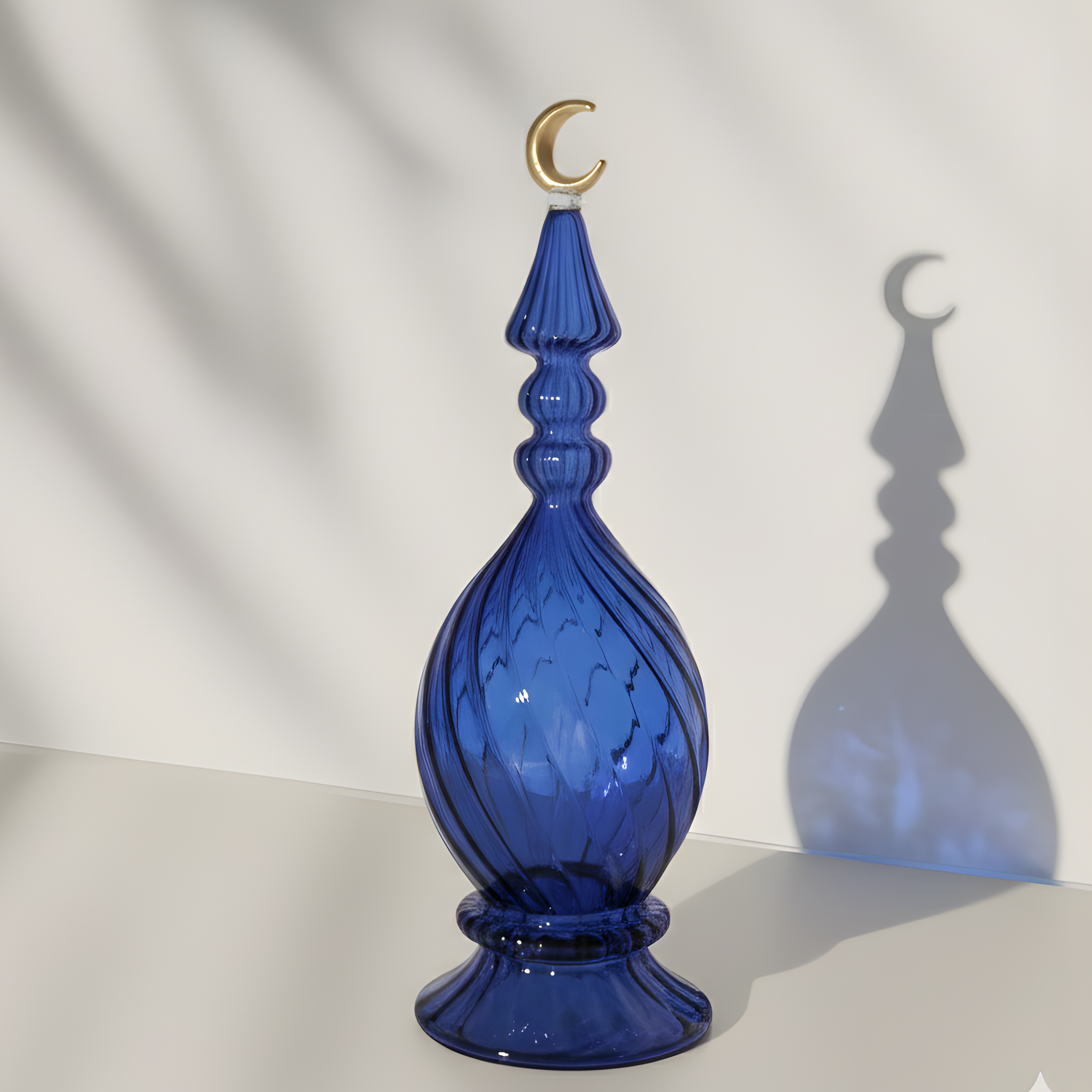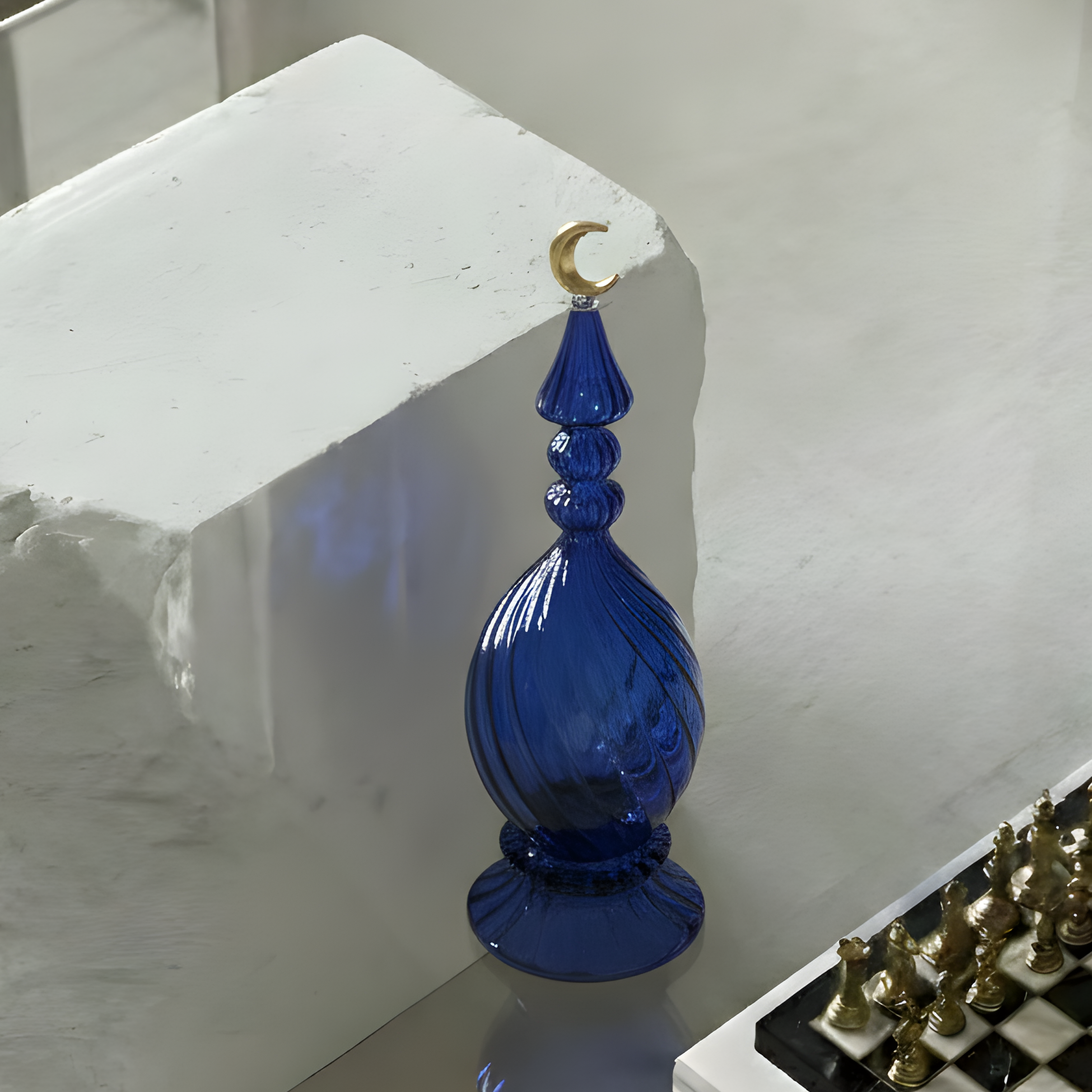 Crafted as a refined decorative sculpture, this crescent piece balances sculptural form with delicate detailing. The colored glass body introduces depth and light interaction, while the crescent accent adds a subtle symbolic presence. Its vertical silhouette creates a calm focal point, designed to exist quietly within the space rather than dominate it.