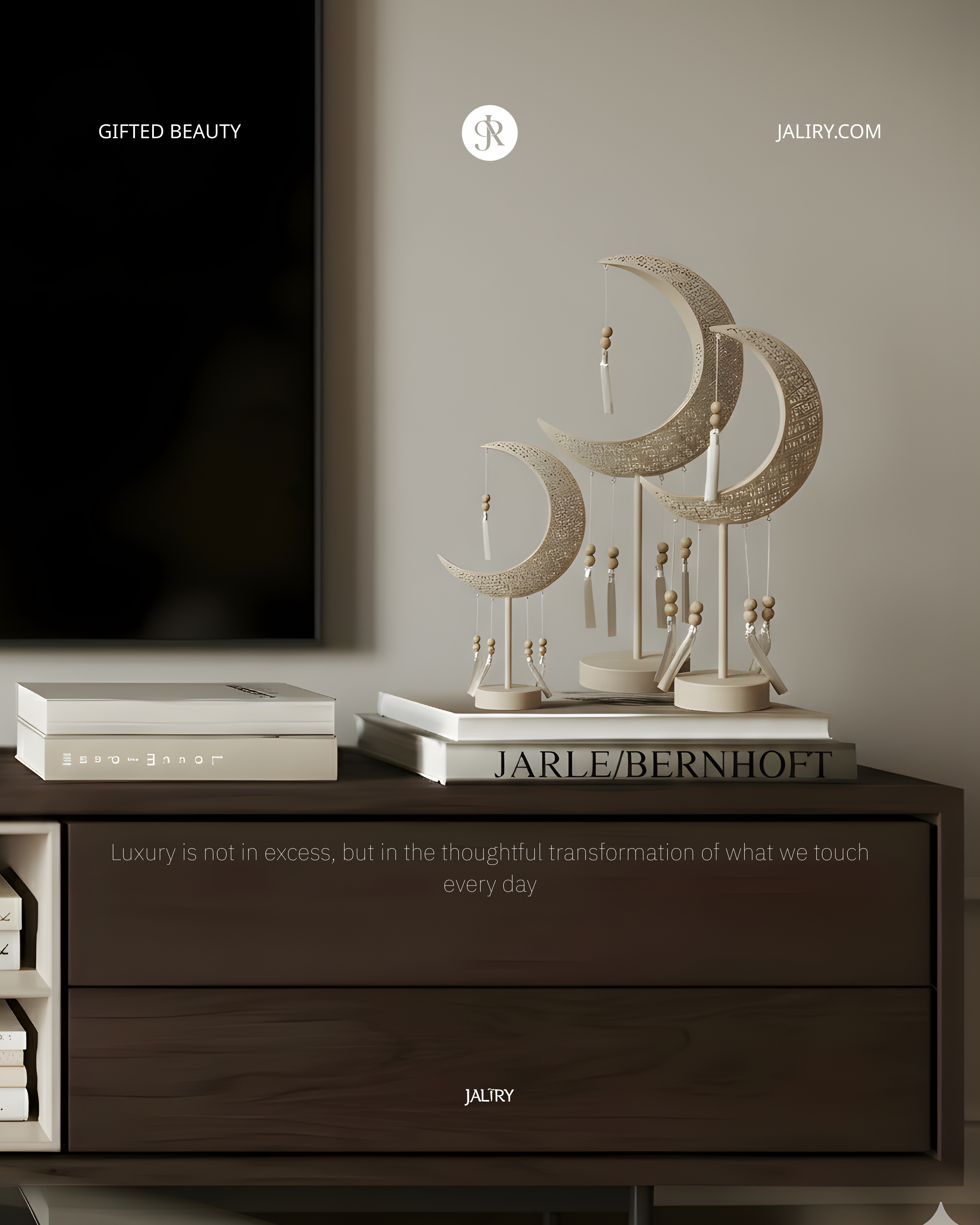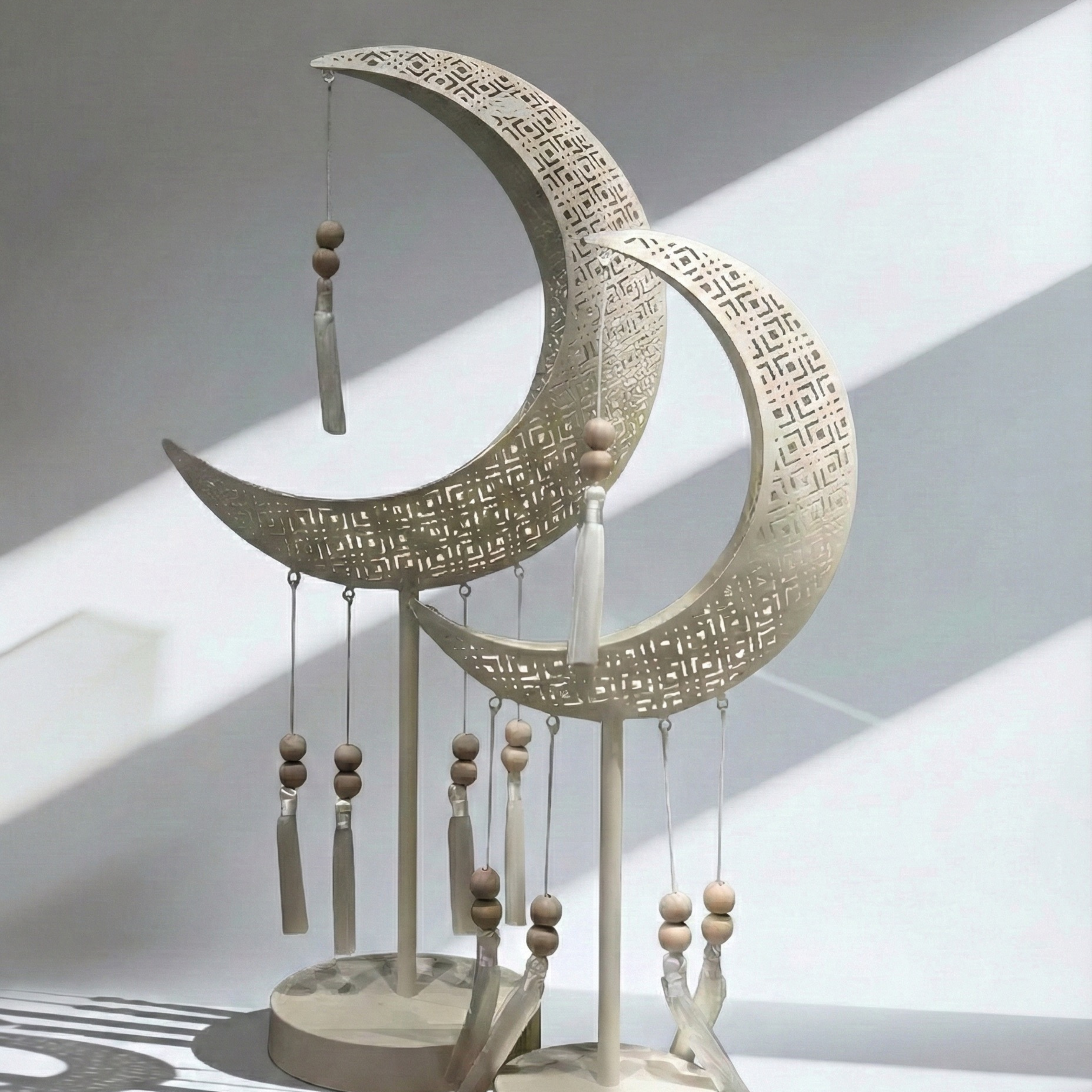 Designed to integrate naturally into calm interiors, this crescent décor piece works best when placed where light and shadow can interact with its form. Whether styled on a console, side table, or open shelf, its vertical silhouette adds visual rhythm without competing with surrounding elements. The subtle movement of its suspended details brings life to the space while maintaining a quiet, balanced presence.