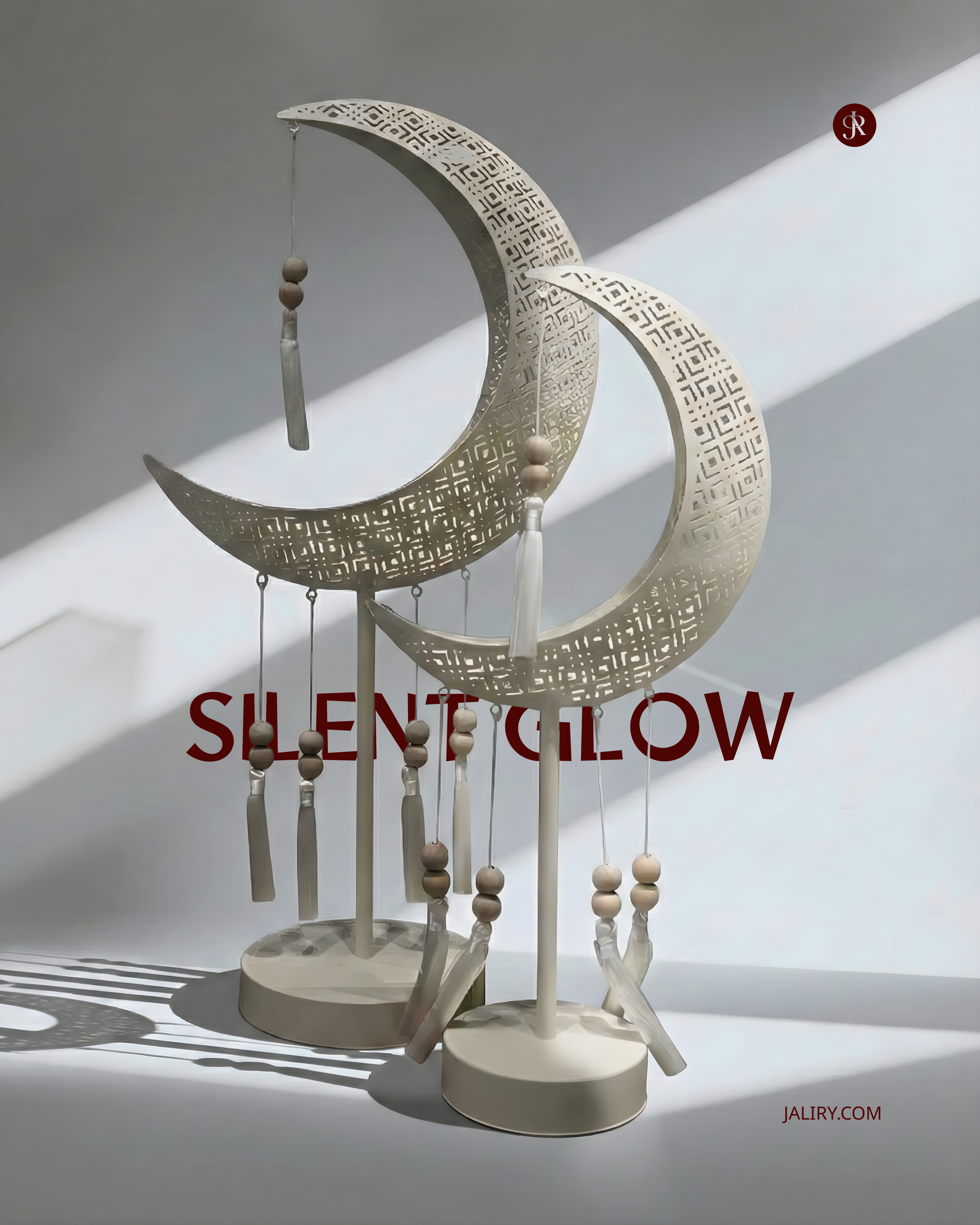 Crafted with a delicate balance between form and movement, this crescent décor piece is designed to bring quiet rhythm into the space. The perforated metal surface allows light to pass softly through its pattern, while the suspended elements introduce gentle motion without distraction. Finished in soft ivory tones and grounded on a minimal base, it functions as both decorative sculpture and subtle statement — present, yet never overpowering.