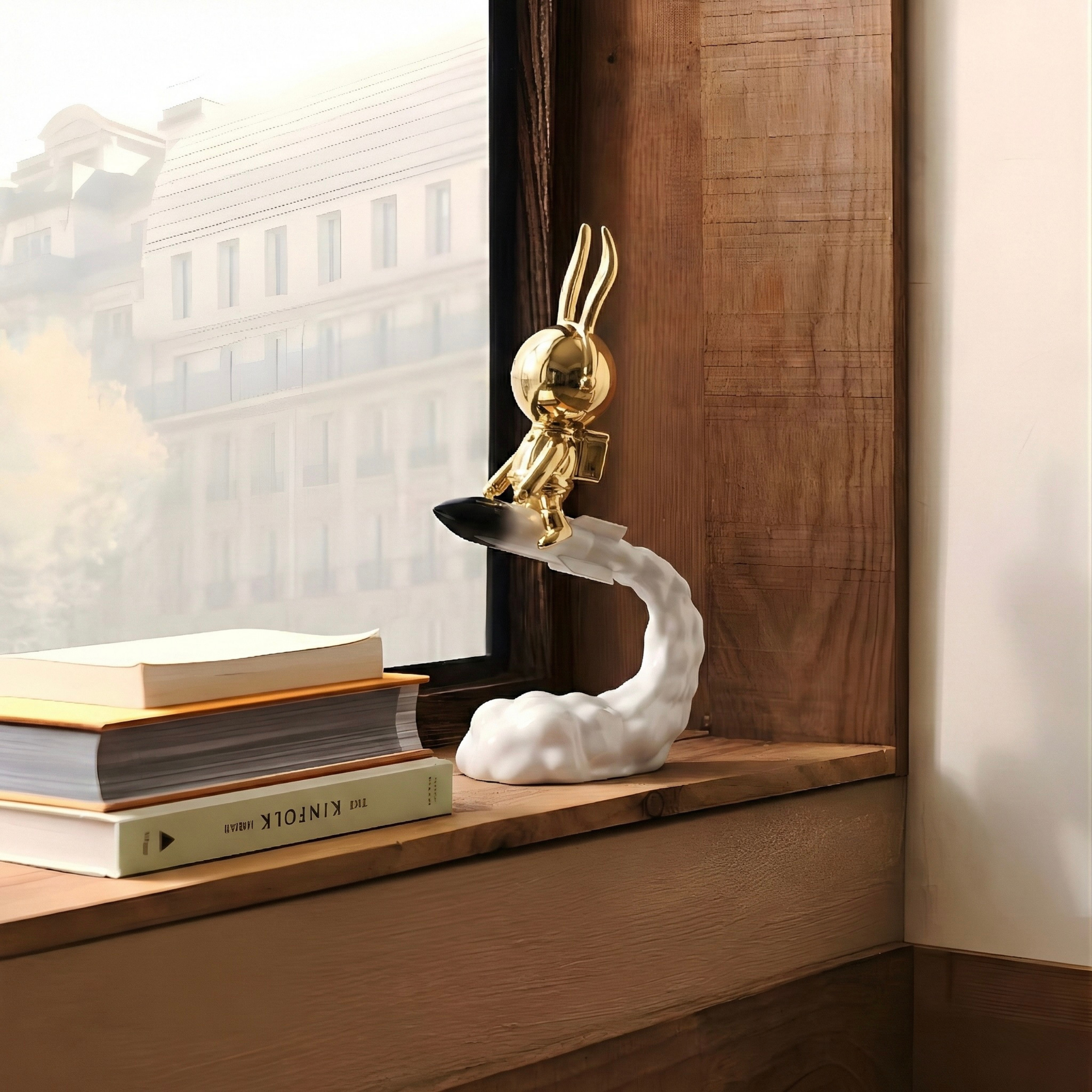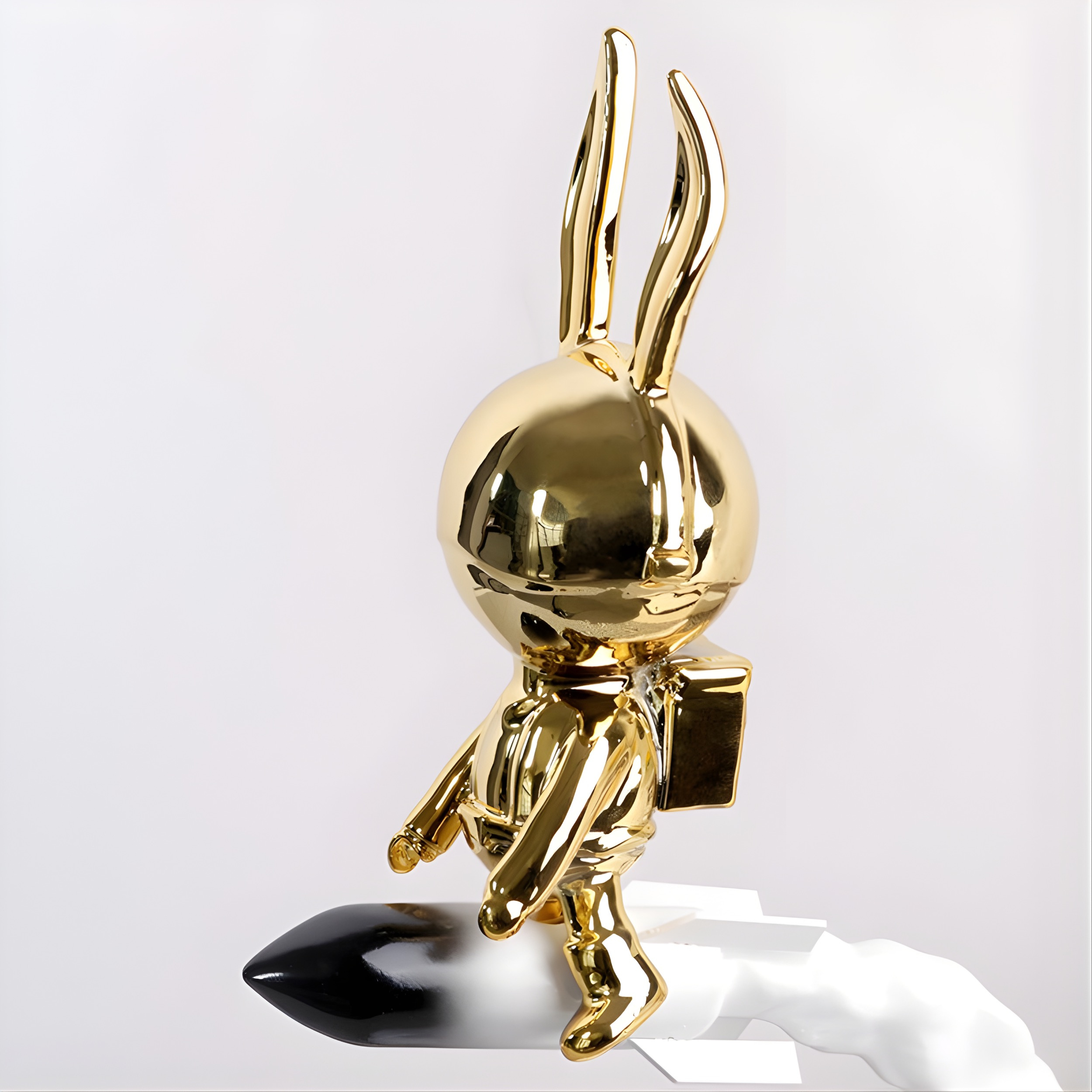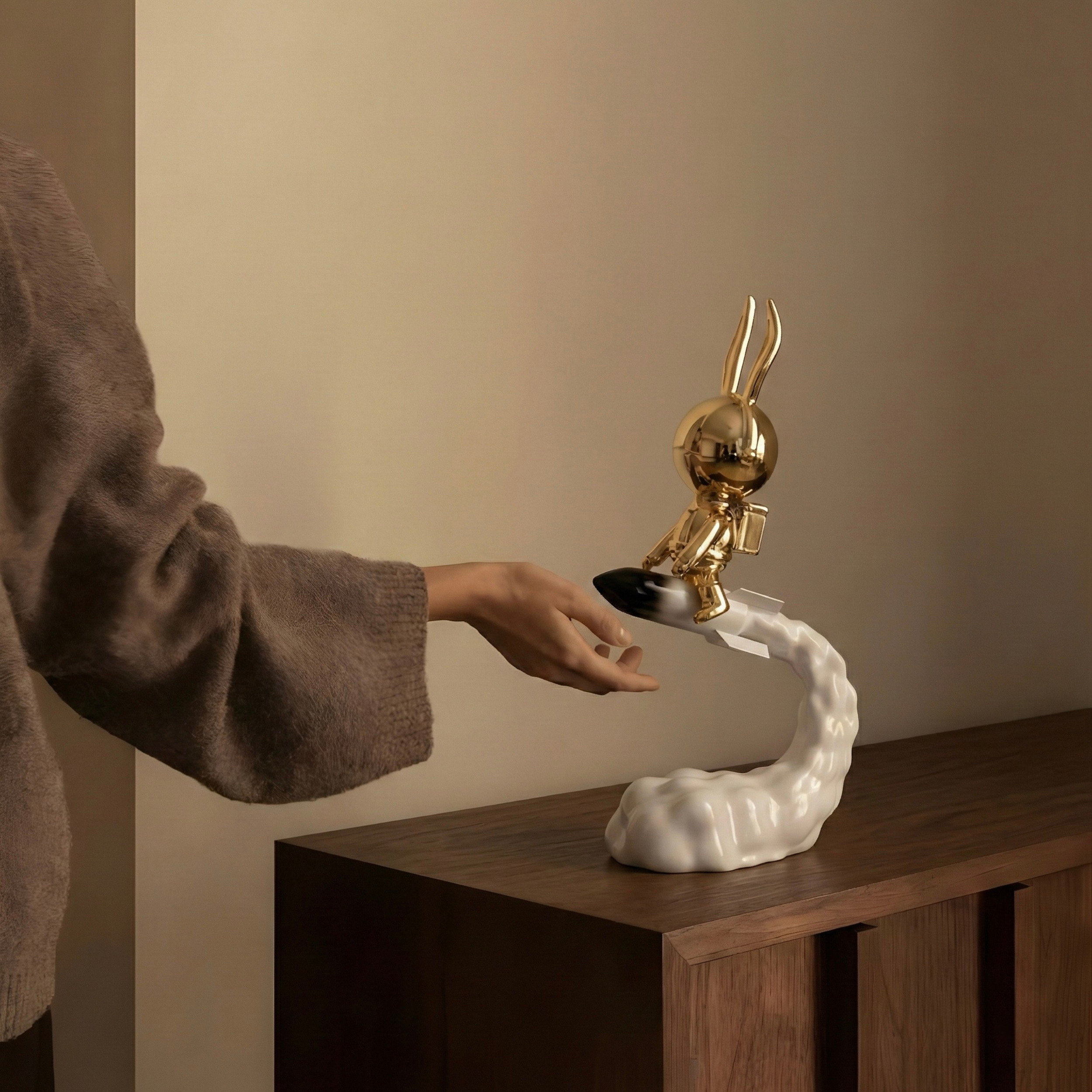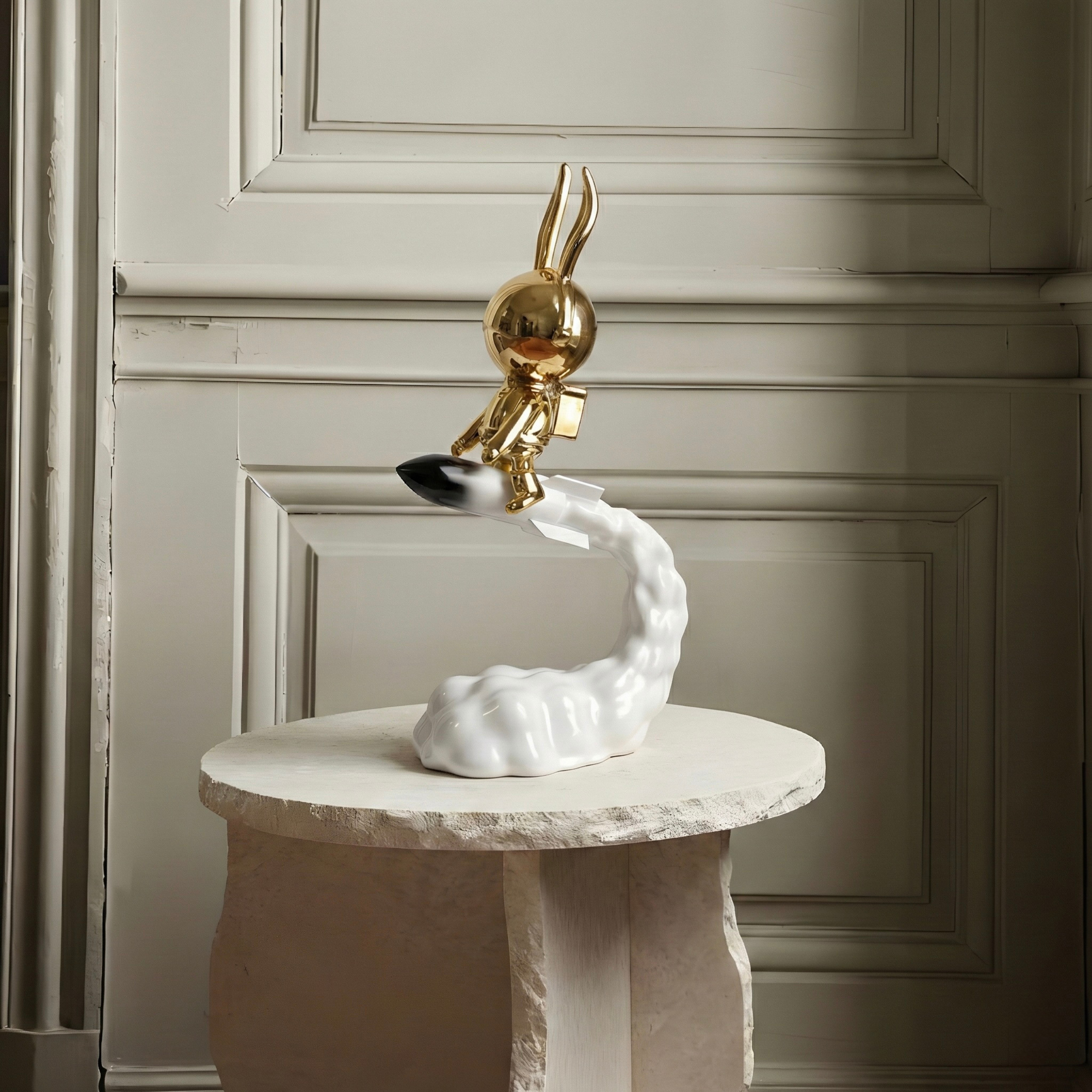 A playful yet luxurious sculptural piece featuring a polished gold rabbit riding a rocket through a flowing cloud base. The dynamic composition captures movement and imagination, blending futuristic charm with contemporary decorative art.