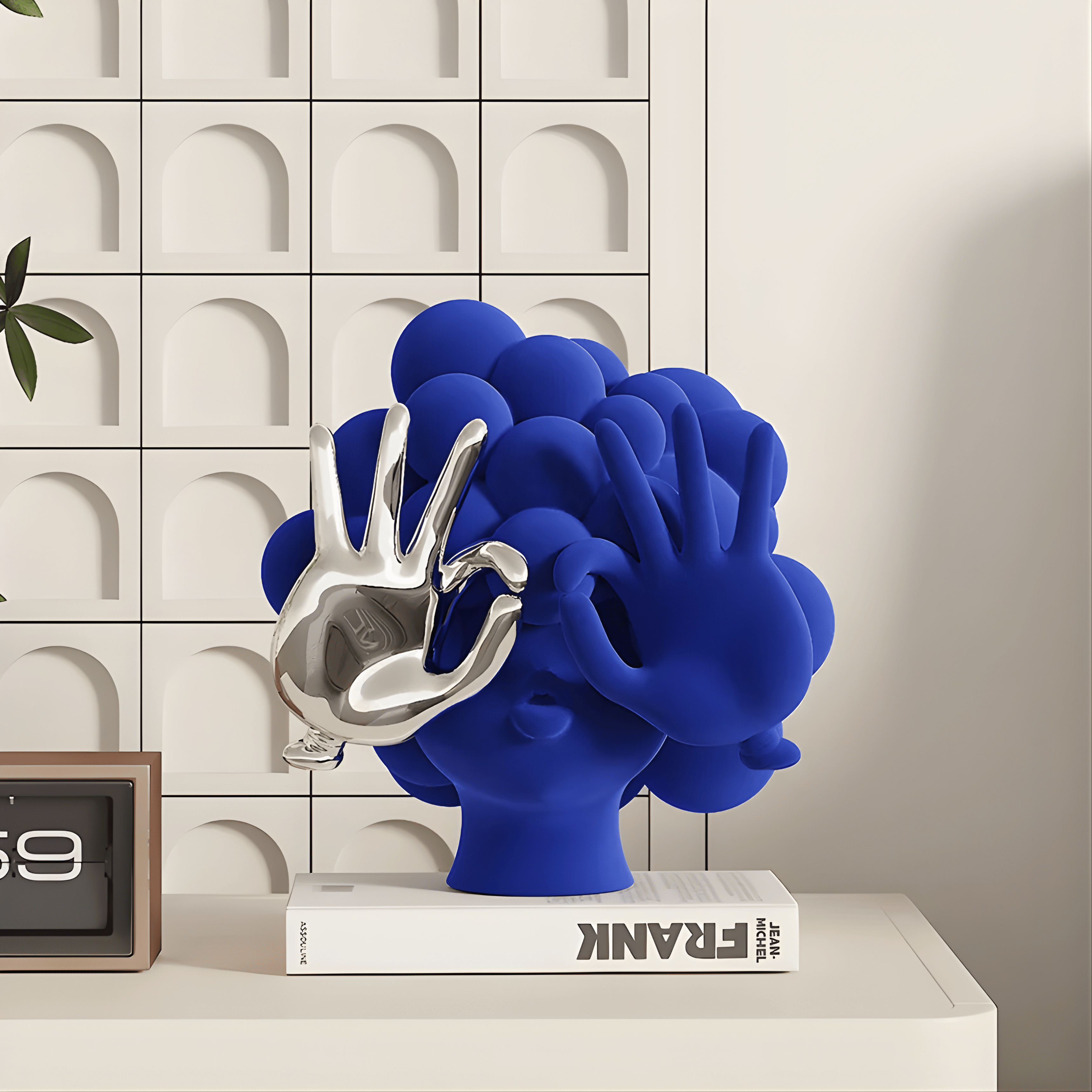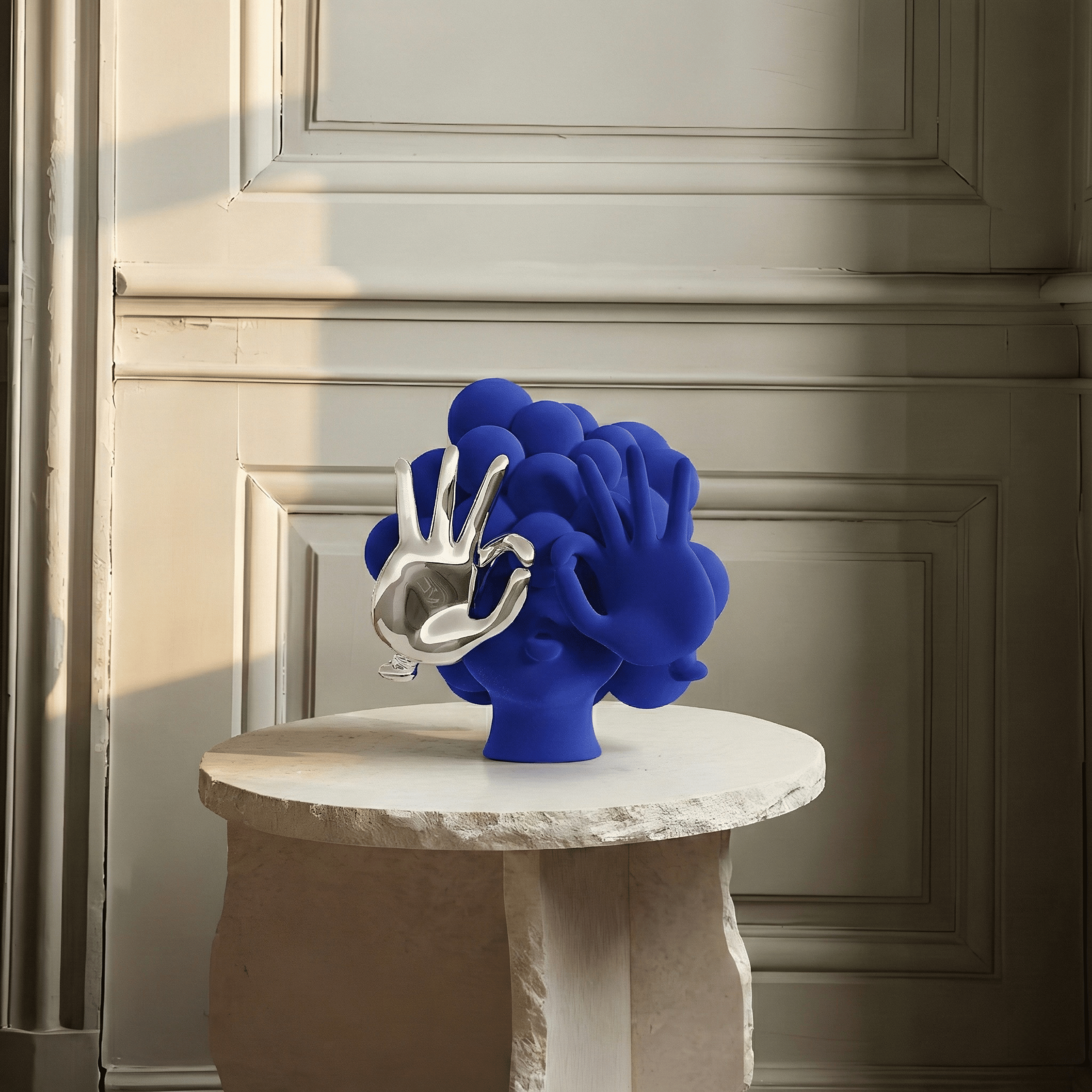 A bold artistic statement blending matte crimson sculpture with a mirrored chrome gesture. The expressive form β a stylized head crowned with sculpted volume β is elevated by the contrasting metallic hand, creating a striking balance between softness and reflection, emotion and modernity.