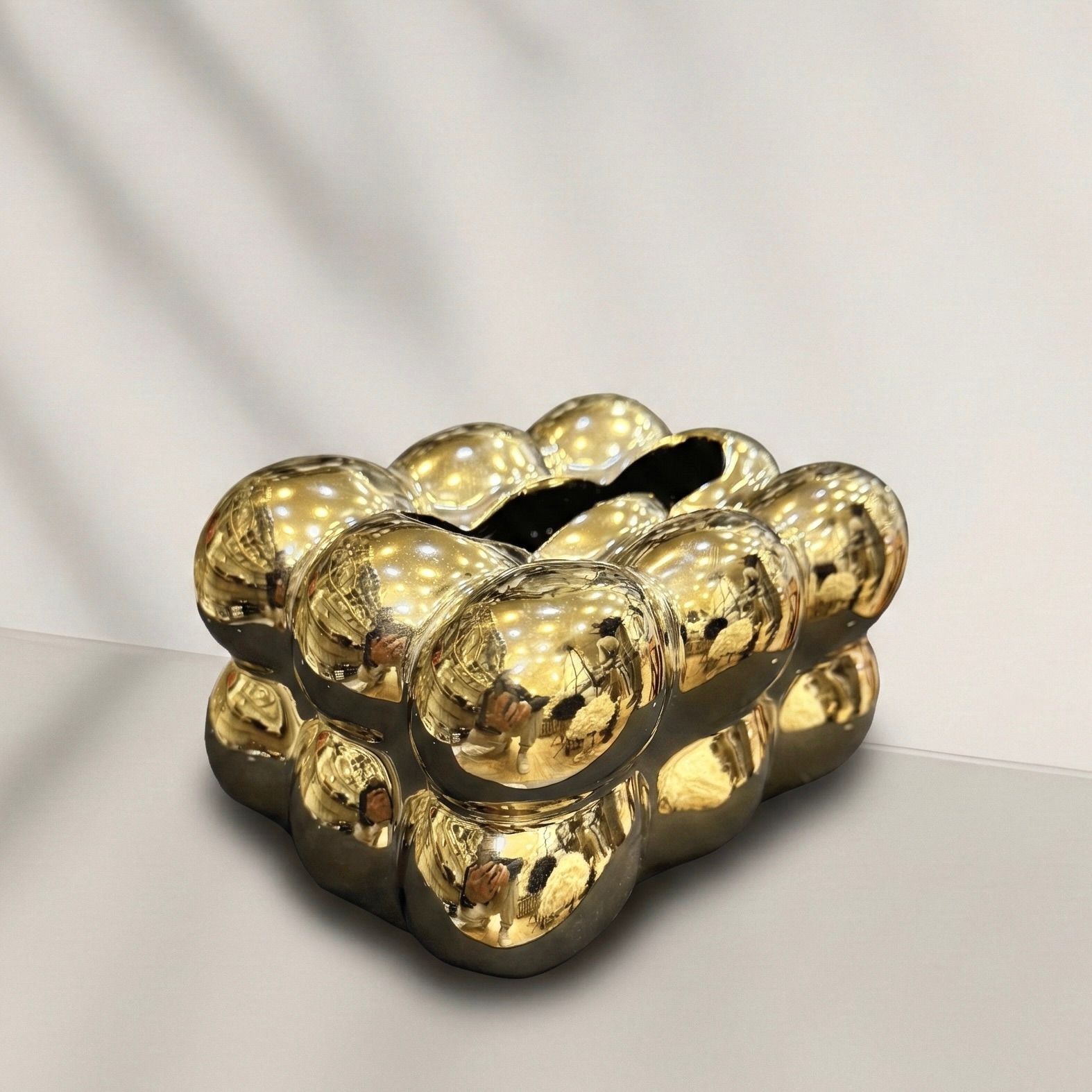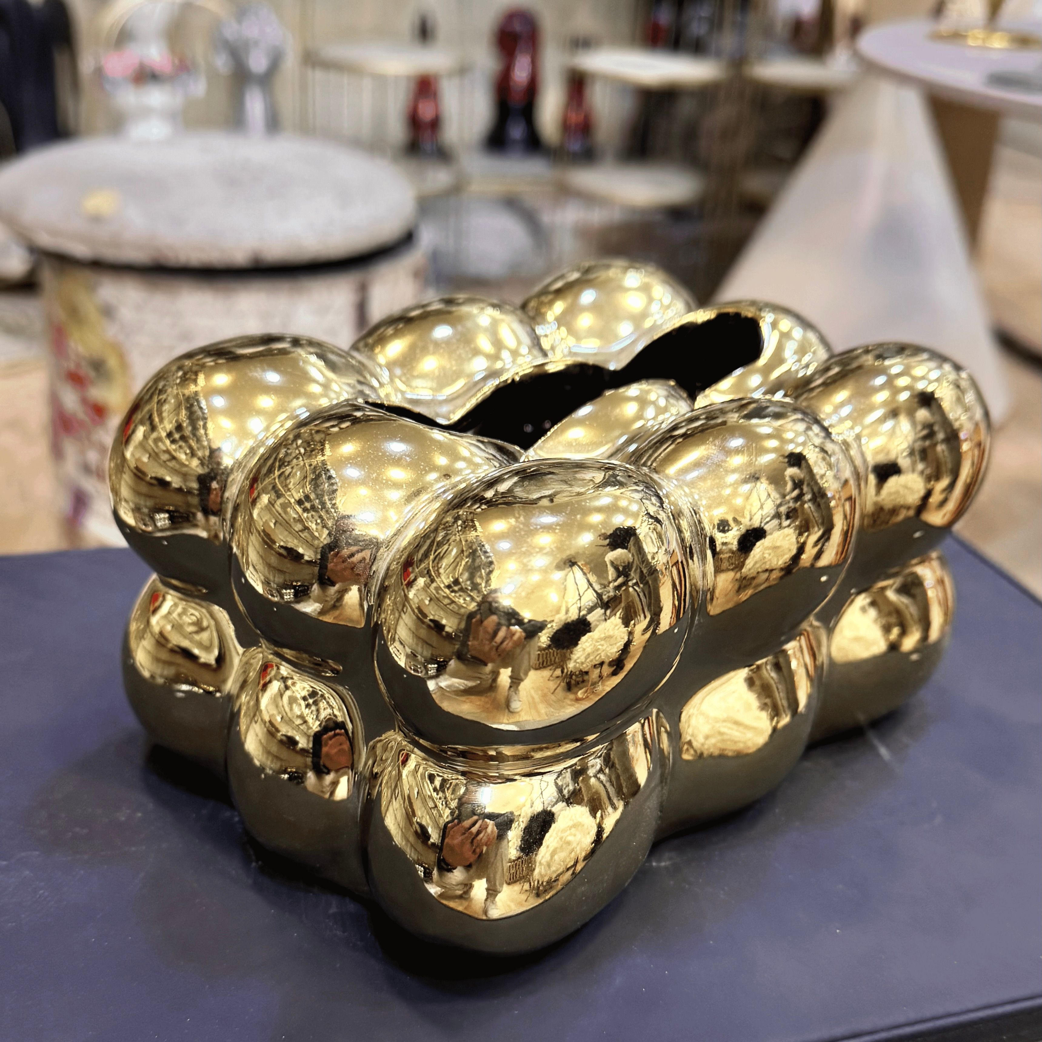 Crafted with a fluid, bubble-inspired structure, the Molten Crown Bowl embodies contemporary sculptural design. Its high-gloss metallic gold finish creates a mirror effect that enhances depth, dimension, and ambient light reflection. The organic geometry makes every angle visually dynamic, ensuring it stands out in modern, minimalist, or luxury interiors.