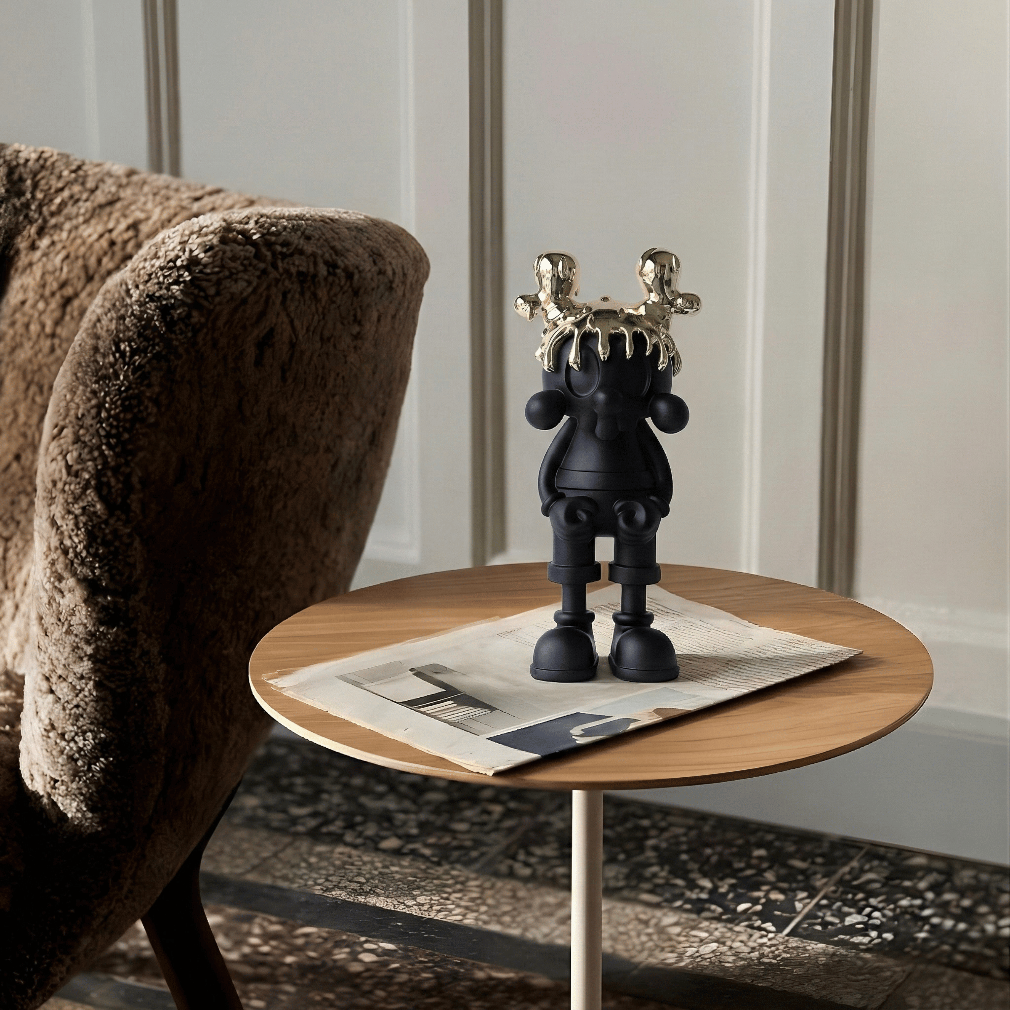 A playful silhouette elevated to royal status. The soft velvet-textured body in deep magenta contrasts dramatically with the high-gloss molten gold crown, creating a balance between innocence and power. Its rounded proportions and sculptural simplicity make it both whimsical and iconic.