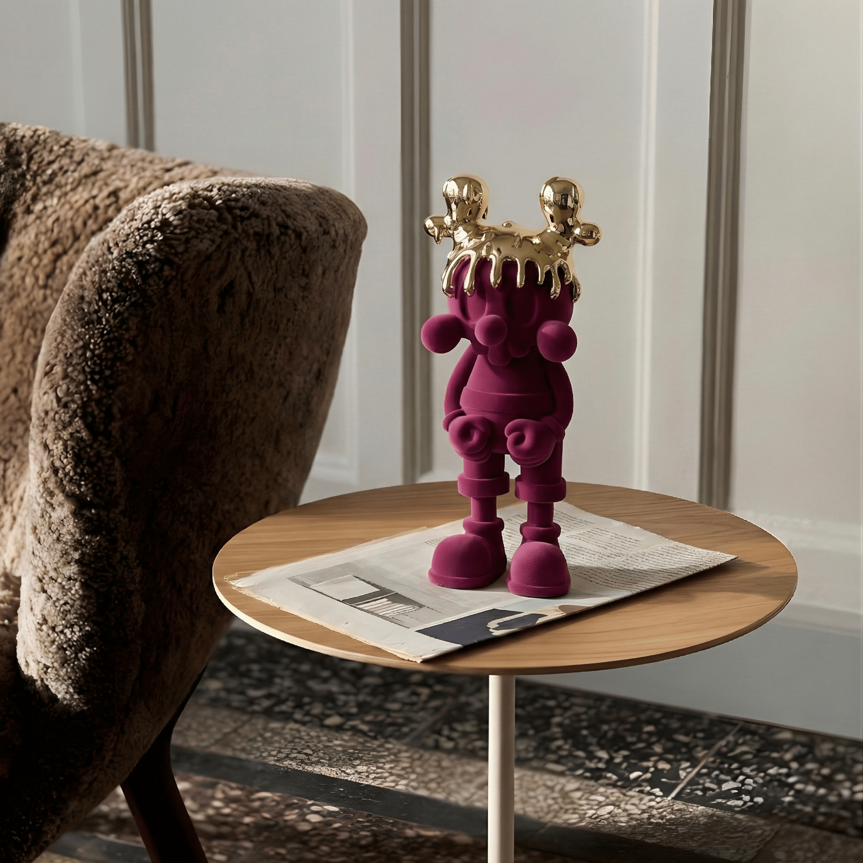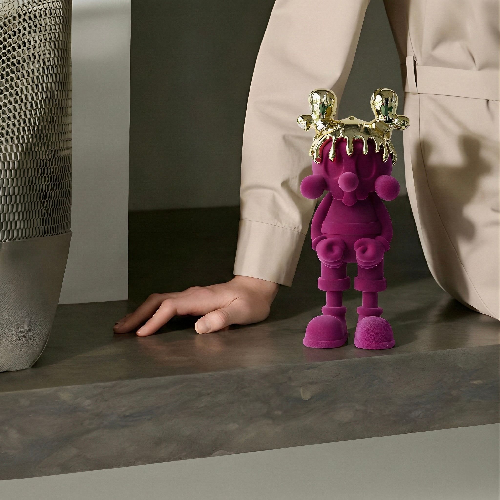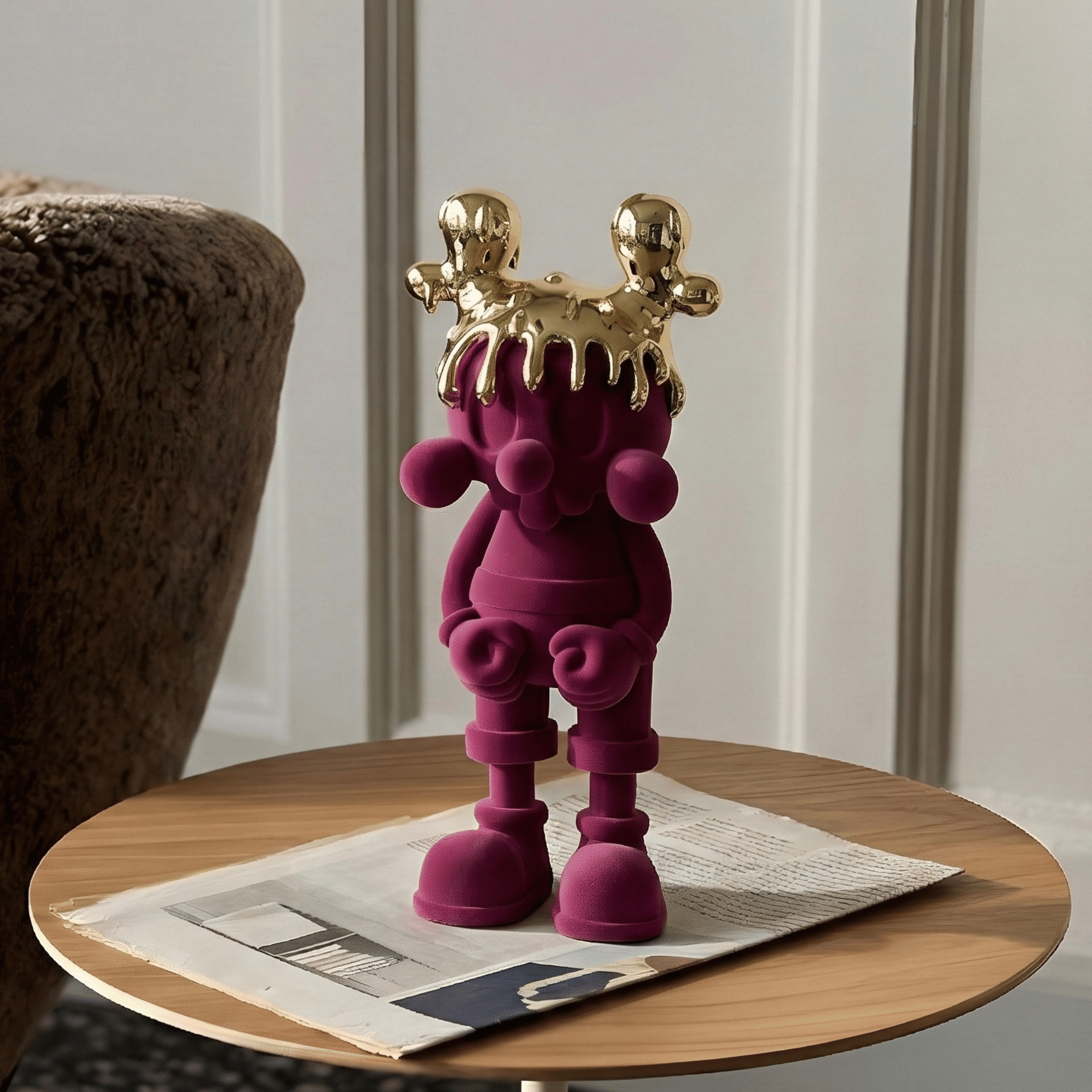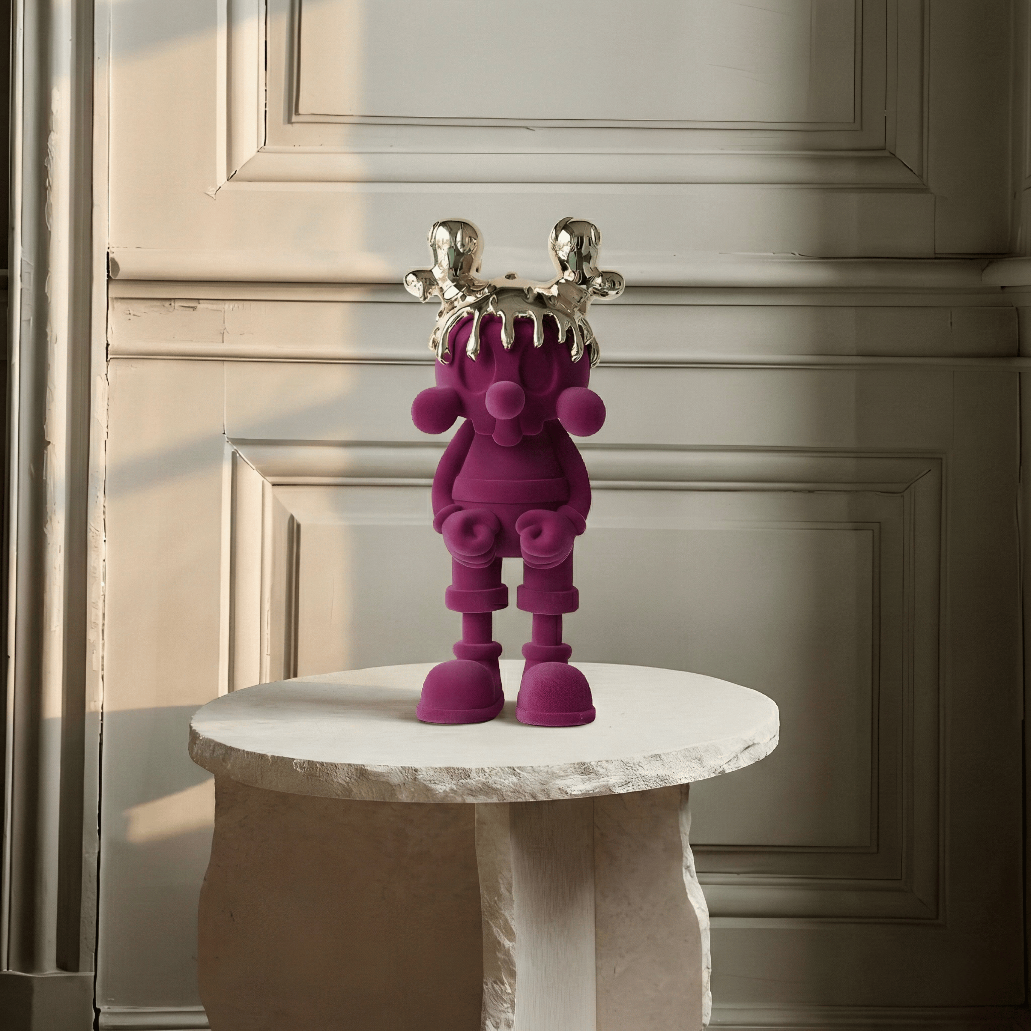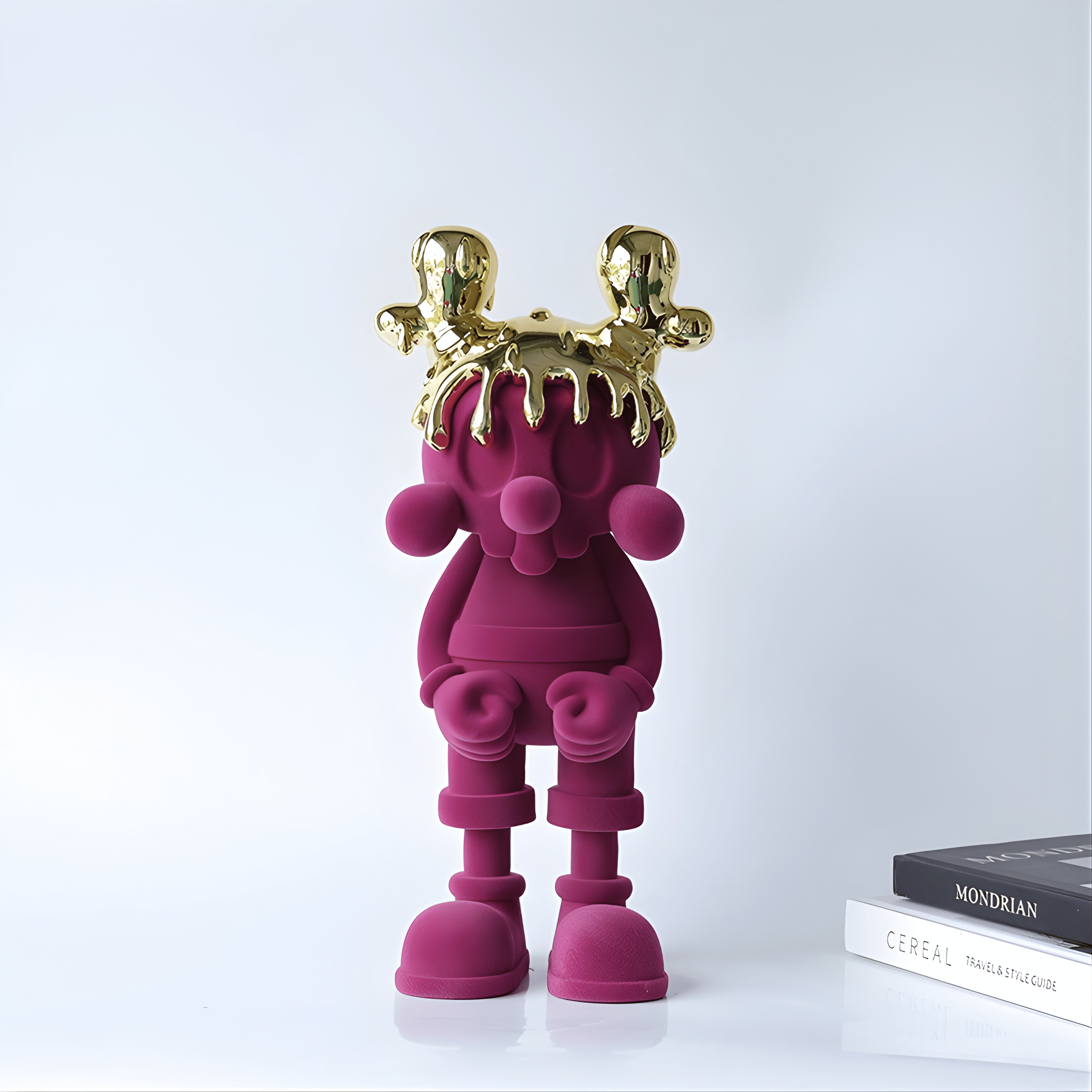A playful silhouette elevated to royal status. The soft velvet-textured body in deep magenta contrasts dramatically with the high-gloss molten gold crown, creating a balance between innocence and power. Its rounded proportions and sculptural simplicity make it both whimsical and iconic.