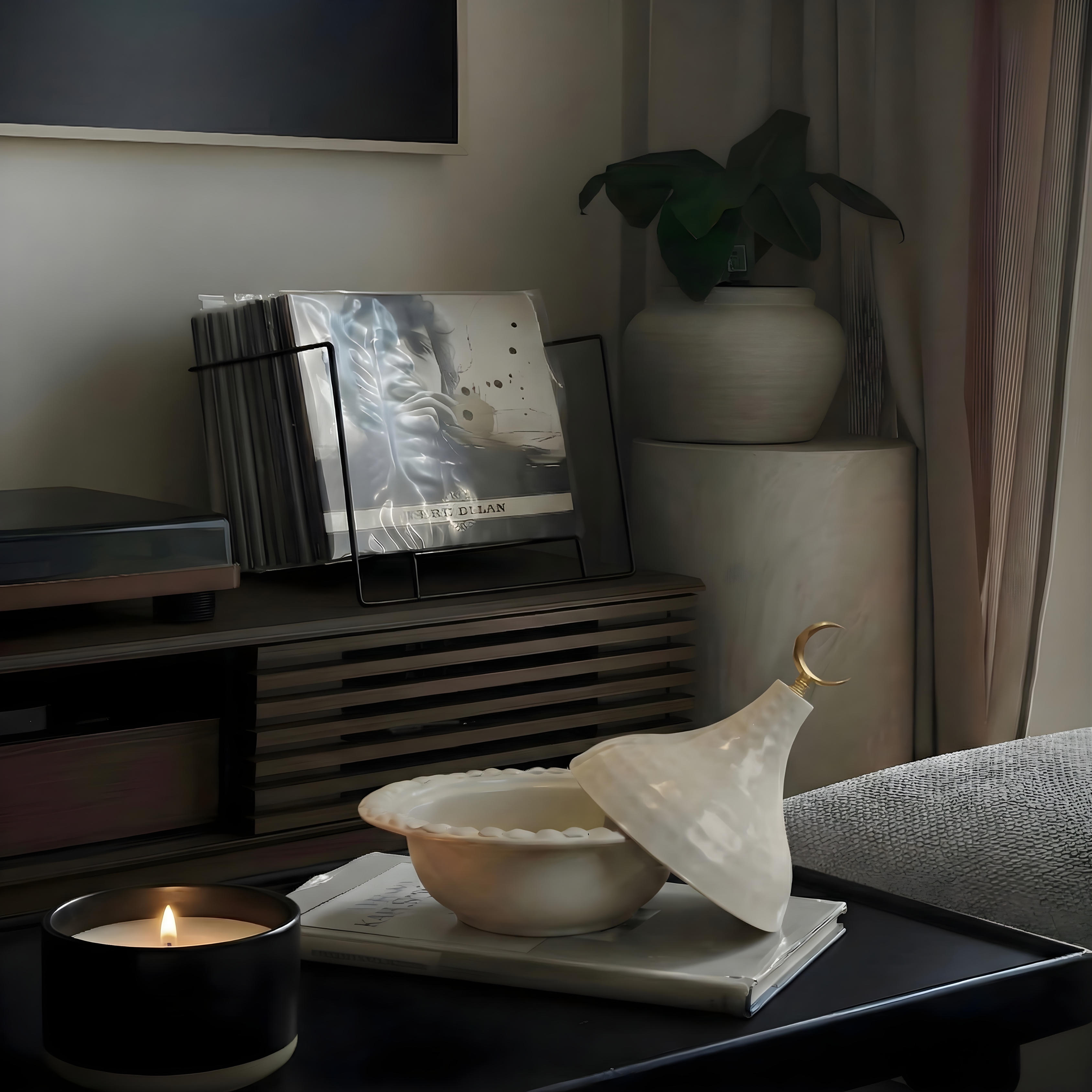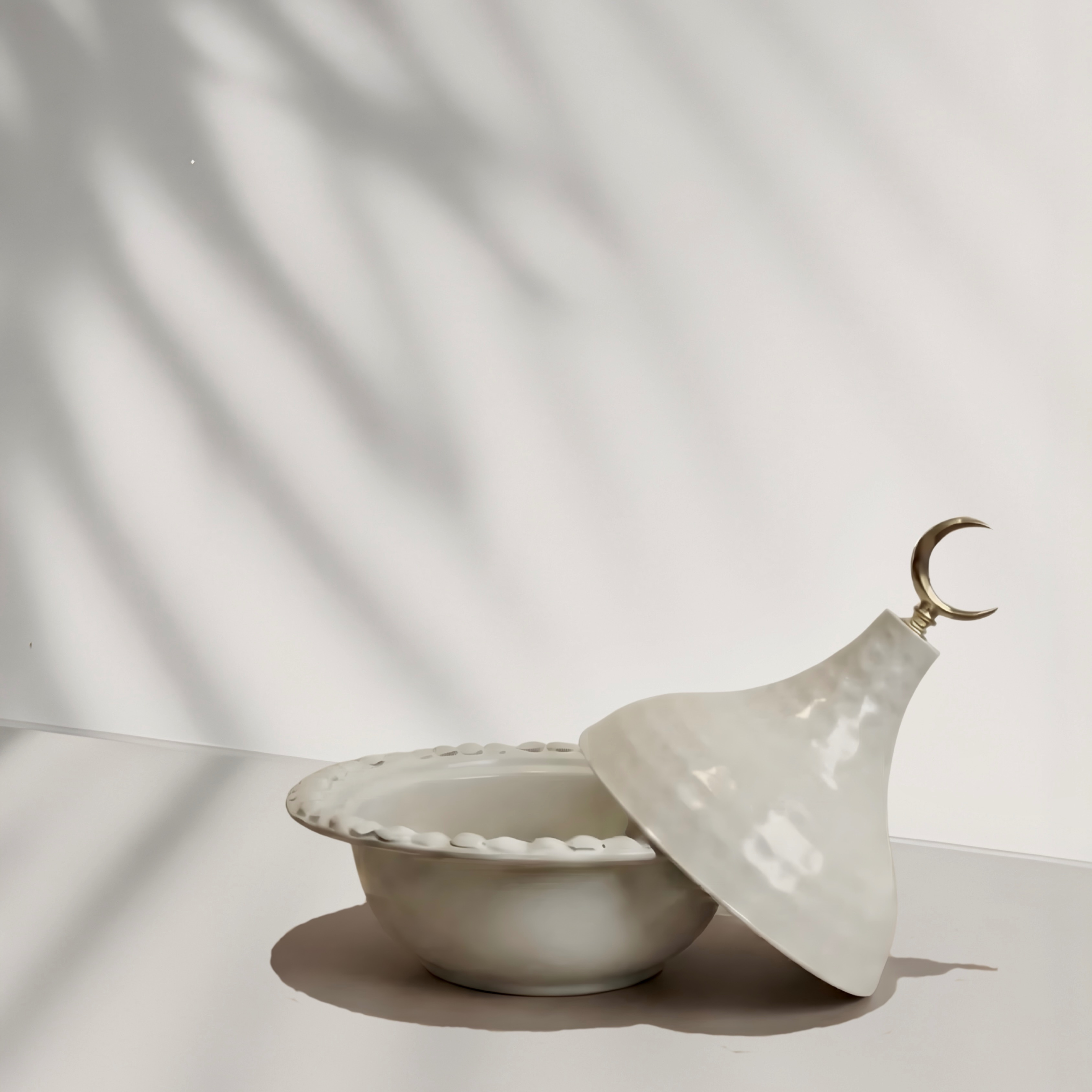 Designed with a quiet sculptural presence, this lidded bowl blends soft curves with restrained detailing. The smooth ceramic body contrasts gently with the crescent accent, creating a balanced form that feels intentional and timeless. Every proportion is considered to allow the piece to sit naturally within refined interiors.