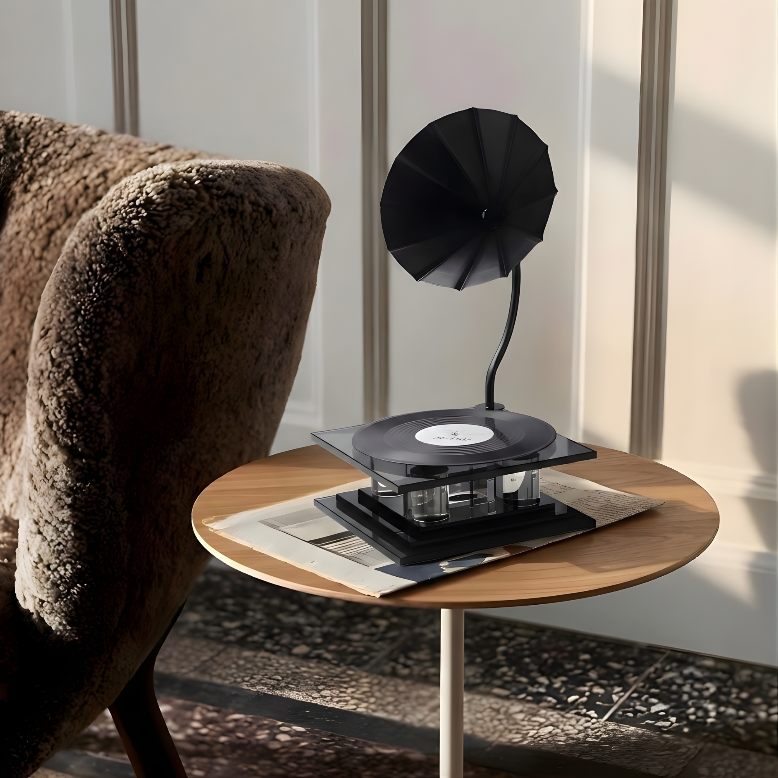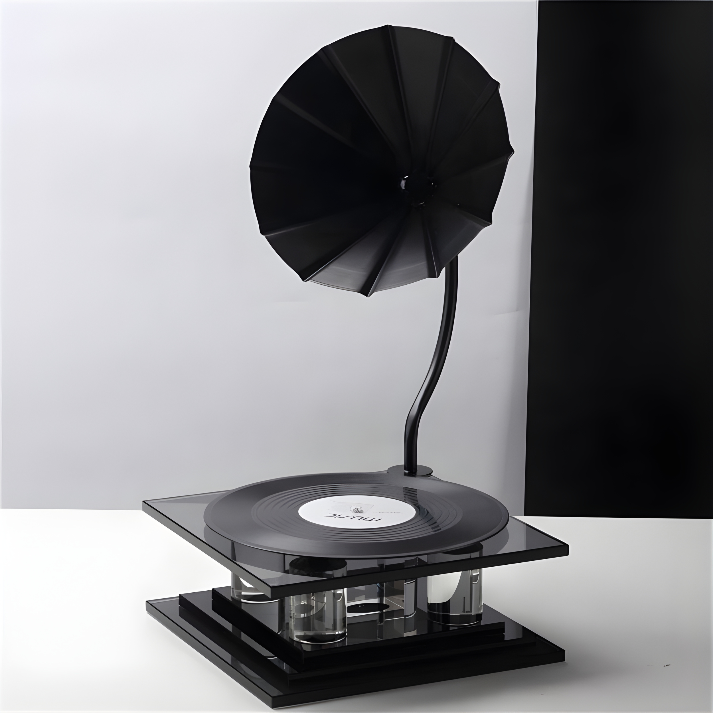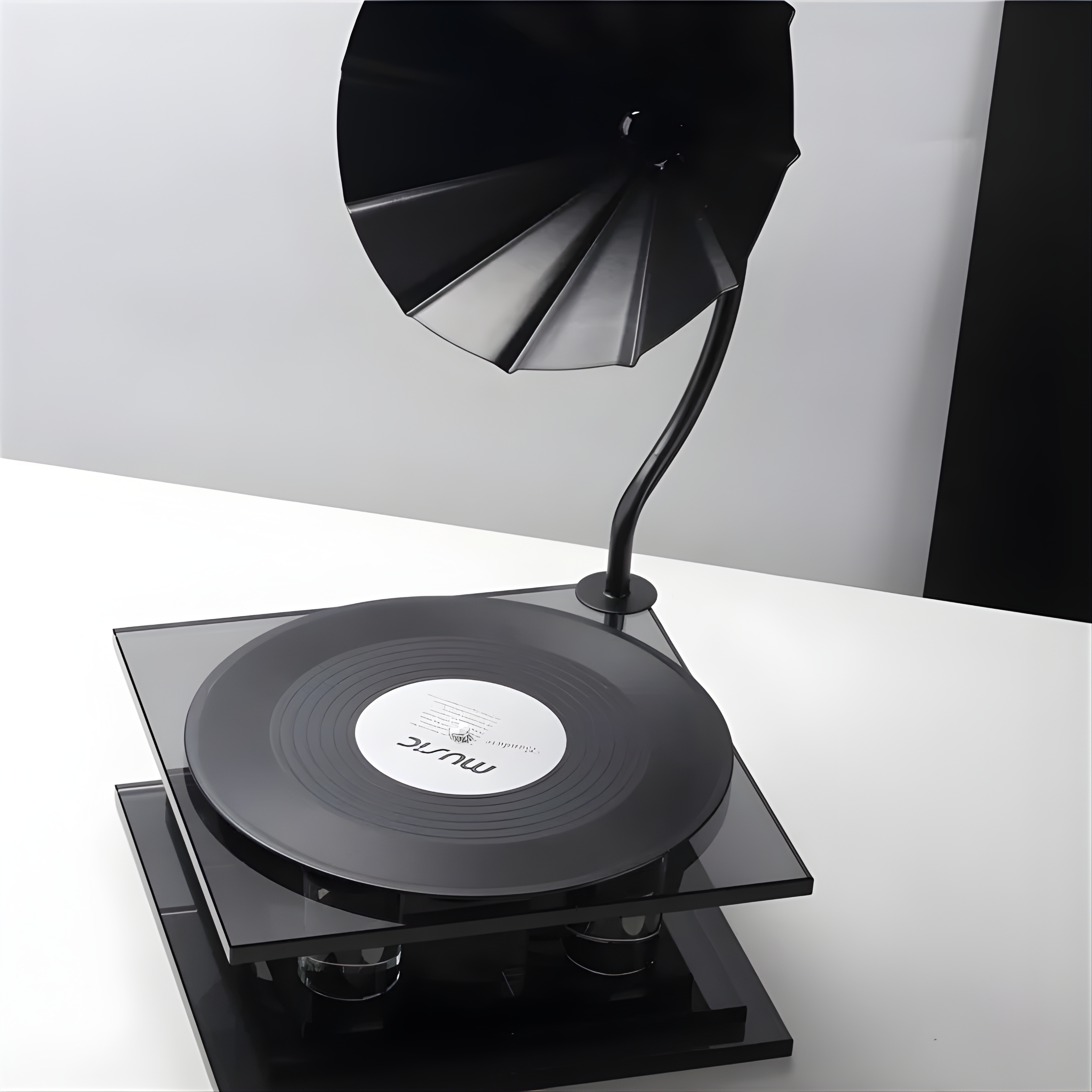 A refined decorative piece inspired by vintage gramophones, reimagined through a sleek modern lens. The sculptural black horn curves gracefully above a minimalist turntable base, blending nostalgia with contemporary geometry. Its monochrome palette enhances its architectural presence while maintaining a clean, artistic aesthetic.