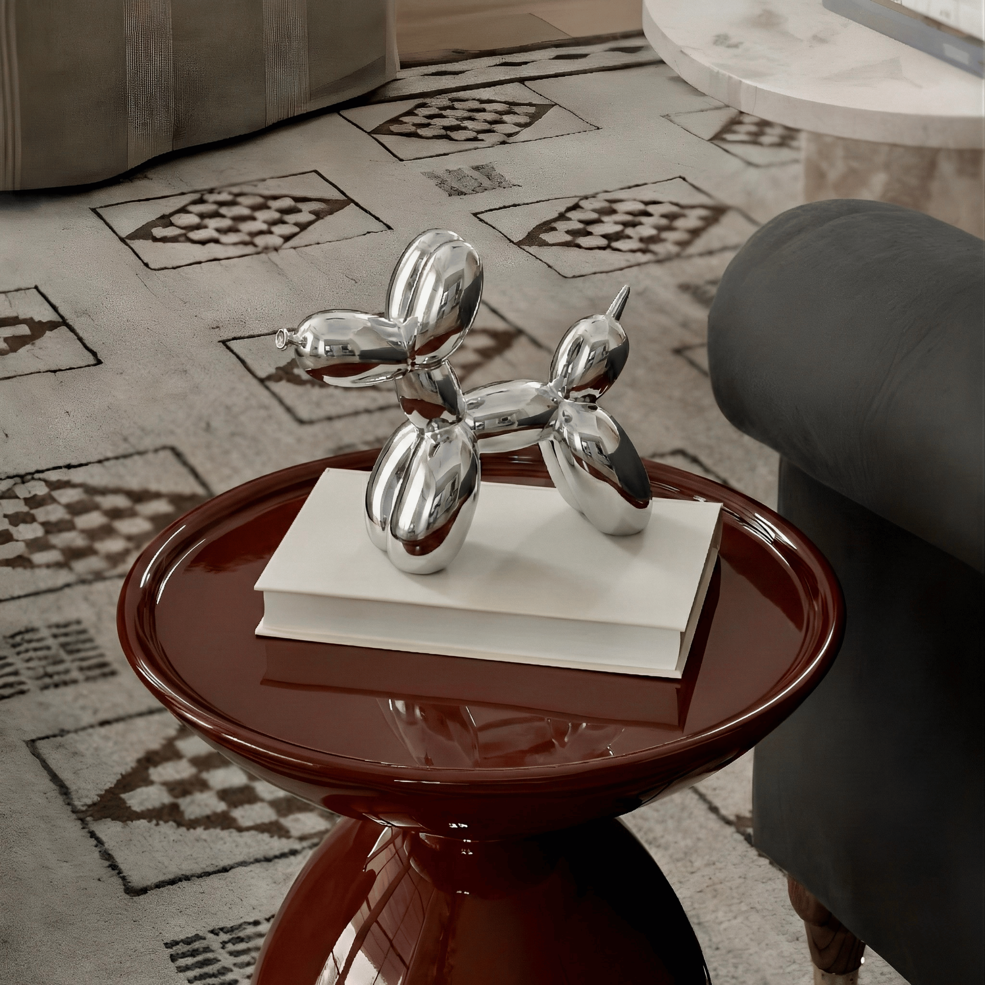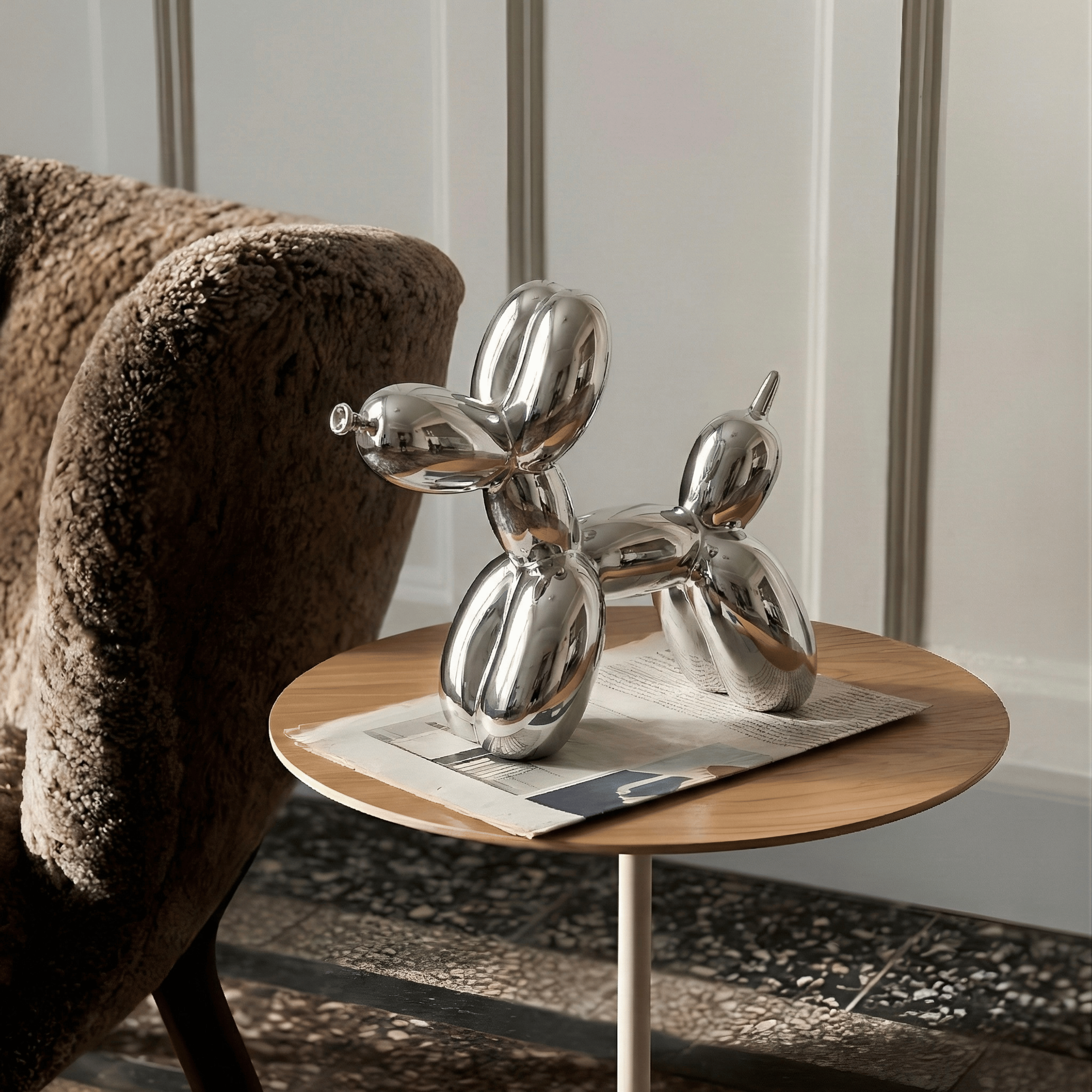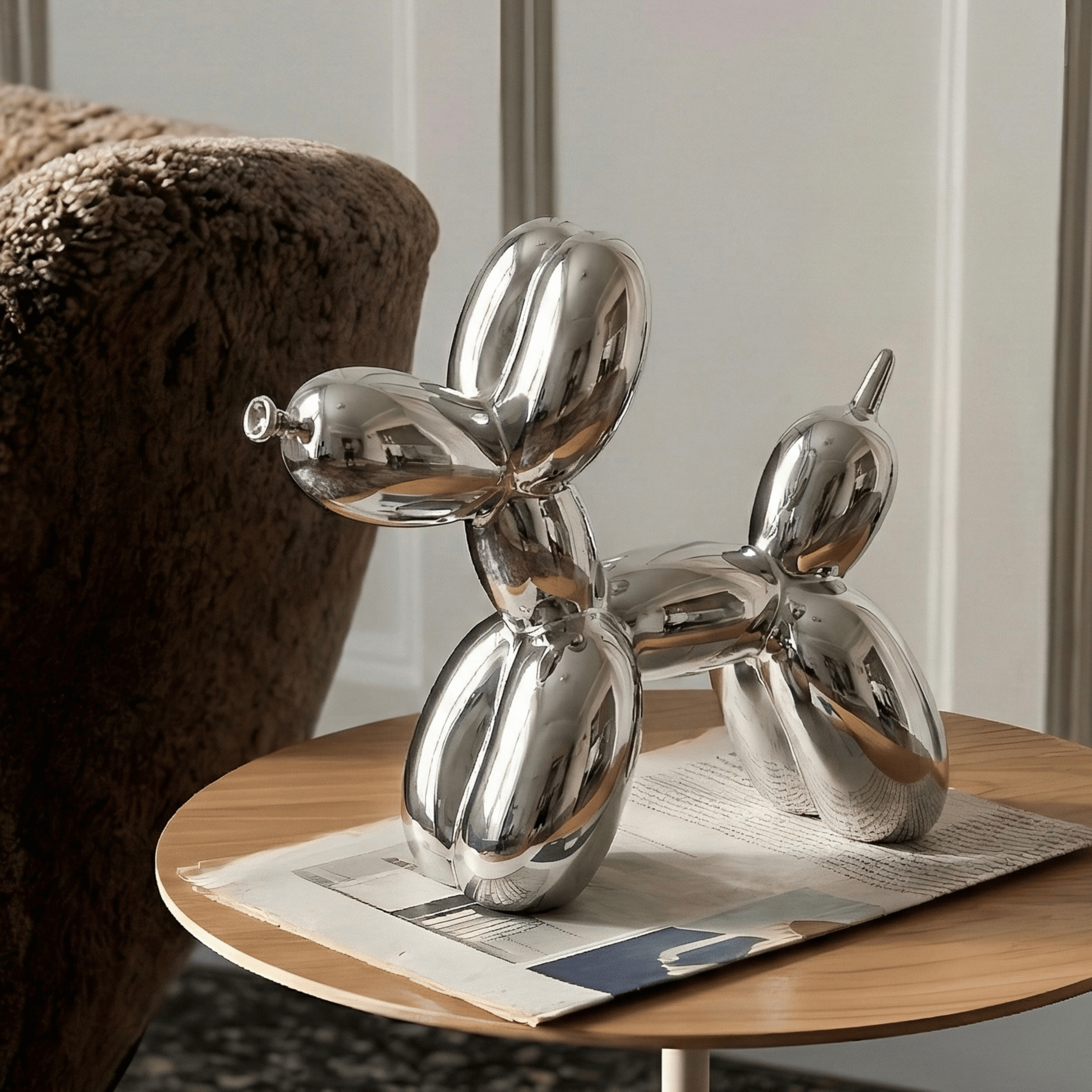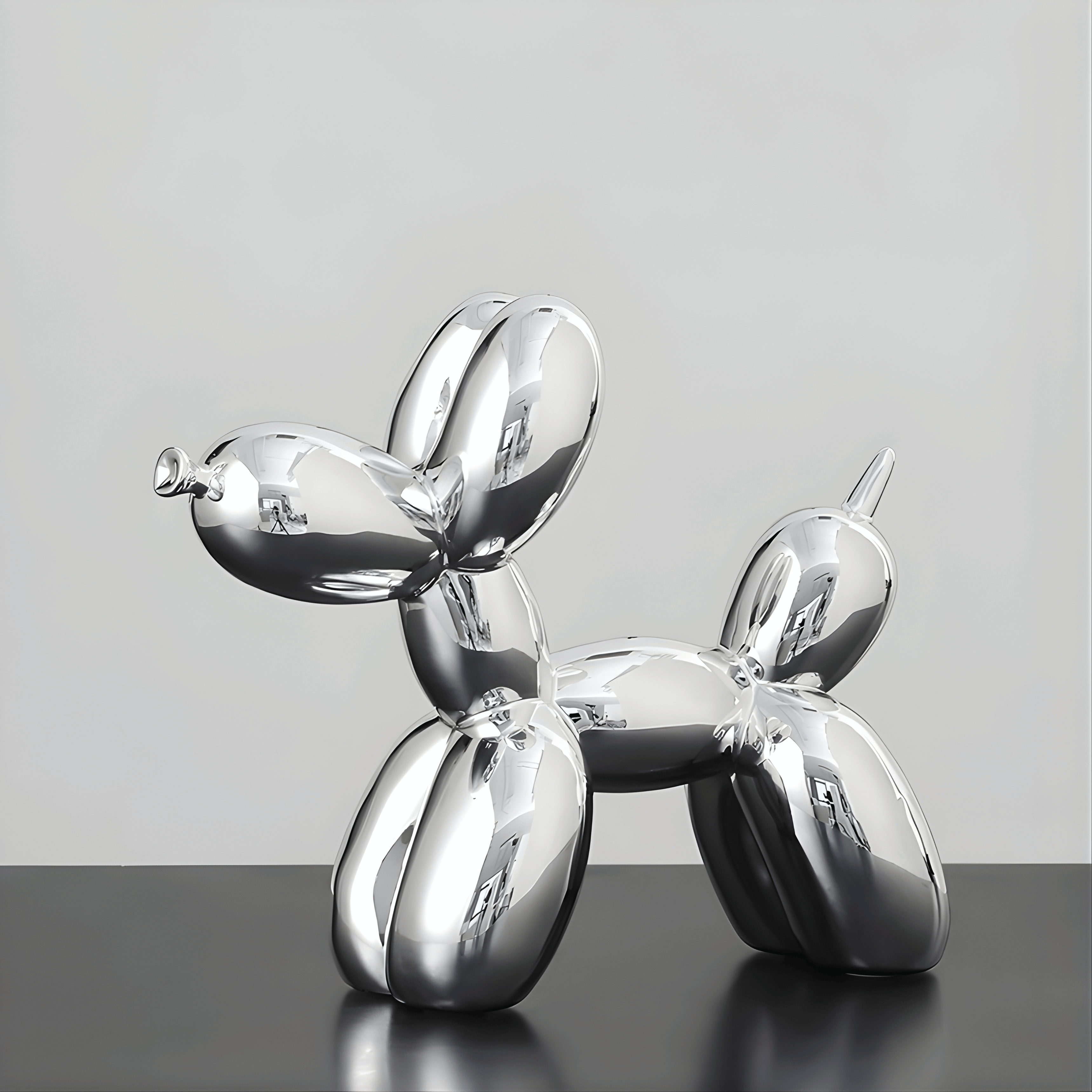 A sculptural reinterpretation of the iconic balloon dog, transformed into a sleek contemporary art object. The mirror-like chrome surface amplifies light and reflection, turning a playful silhouette into a refined statement piece. Its smooth curves and inflated form create a balance between whimsy and modern minimalism.