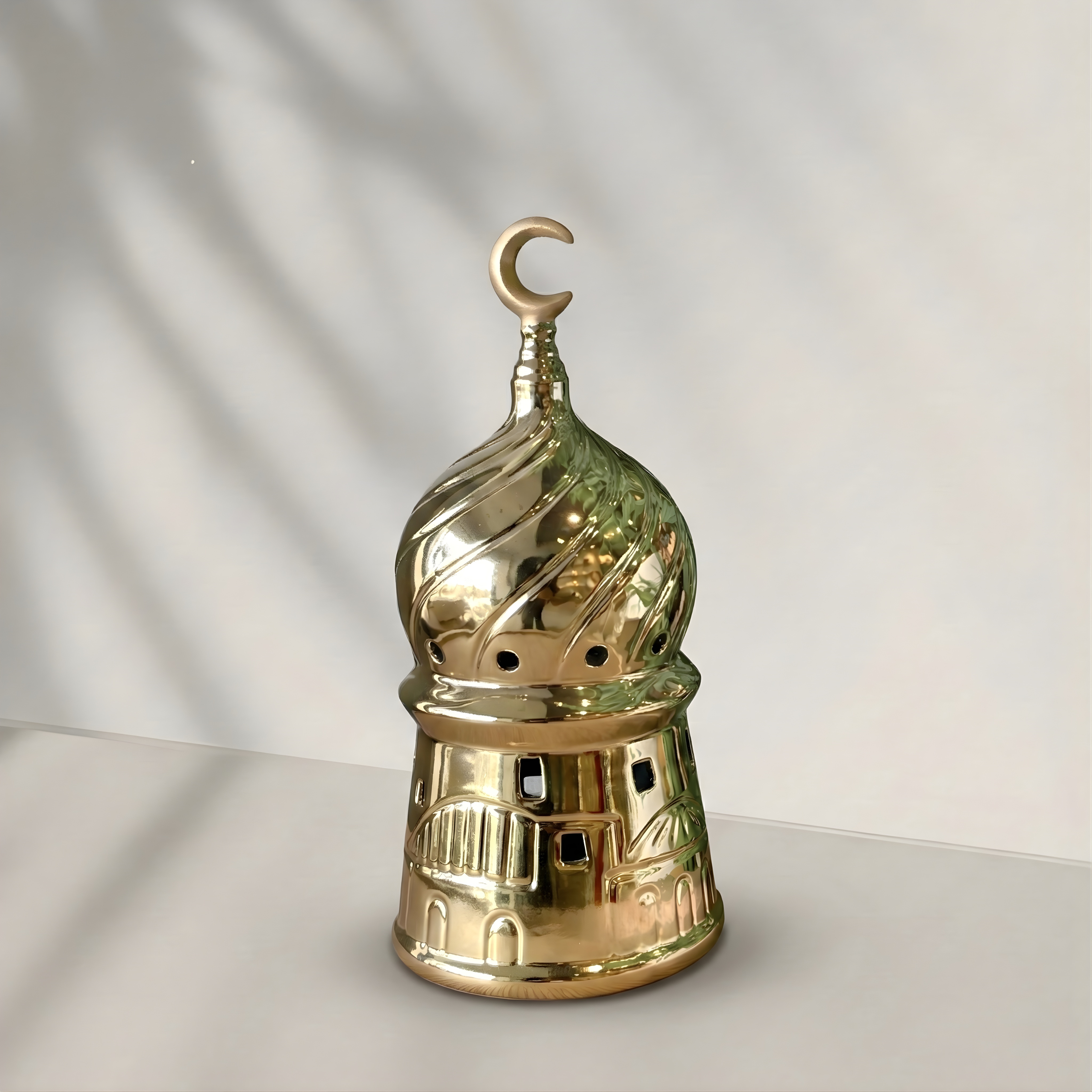 Inspired by architectural forms, this ceramic lantern combines a domed silhouette with subtle faΓ§ade-like details. The smooth white body is punctuated with small openings that create depth and rhythm, while the golden crescent crowns the piece with a restrained symbolic touch. The result is a balanced object that feels calm, refined, and timeless.