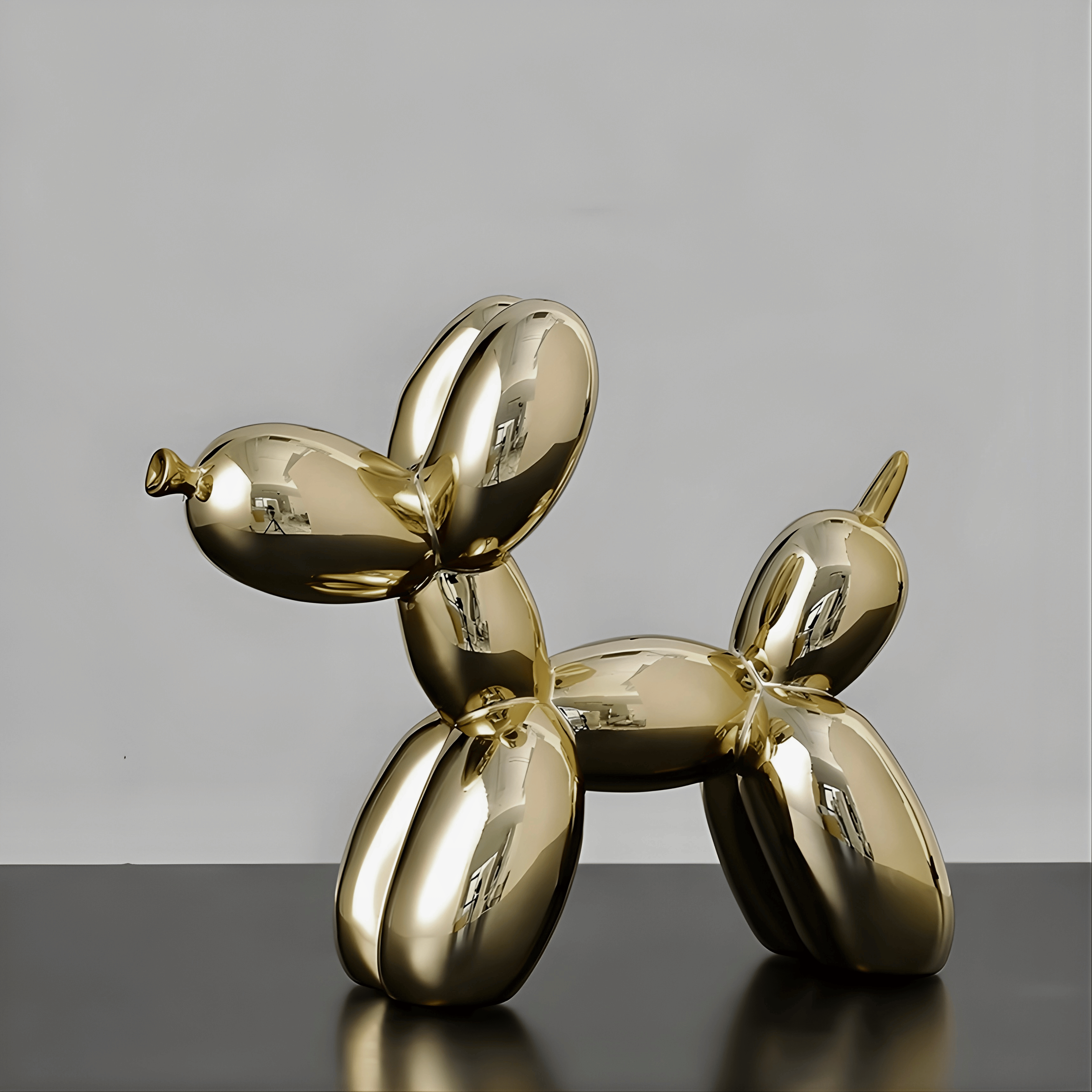 A sculptural reinterpretation of the iconic balloon dog, transformed into a sleek contemporary art object. The mirror-like chrome surface amplifies light and reflection, turning a playful silhouette into a refined statement piece. Its smooth curves and inflated form create a balance between whimsy and modern minimalism.
