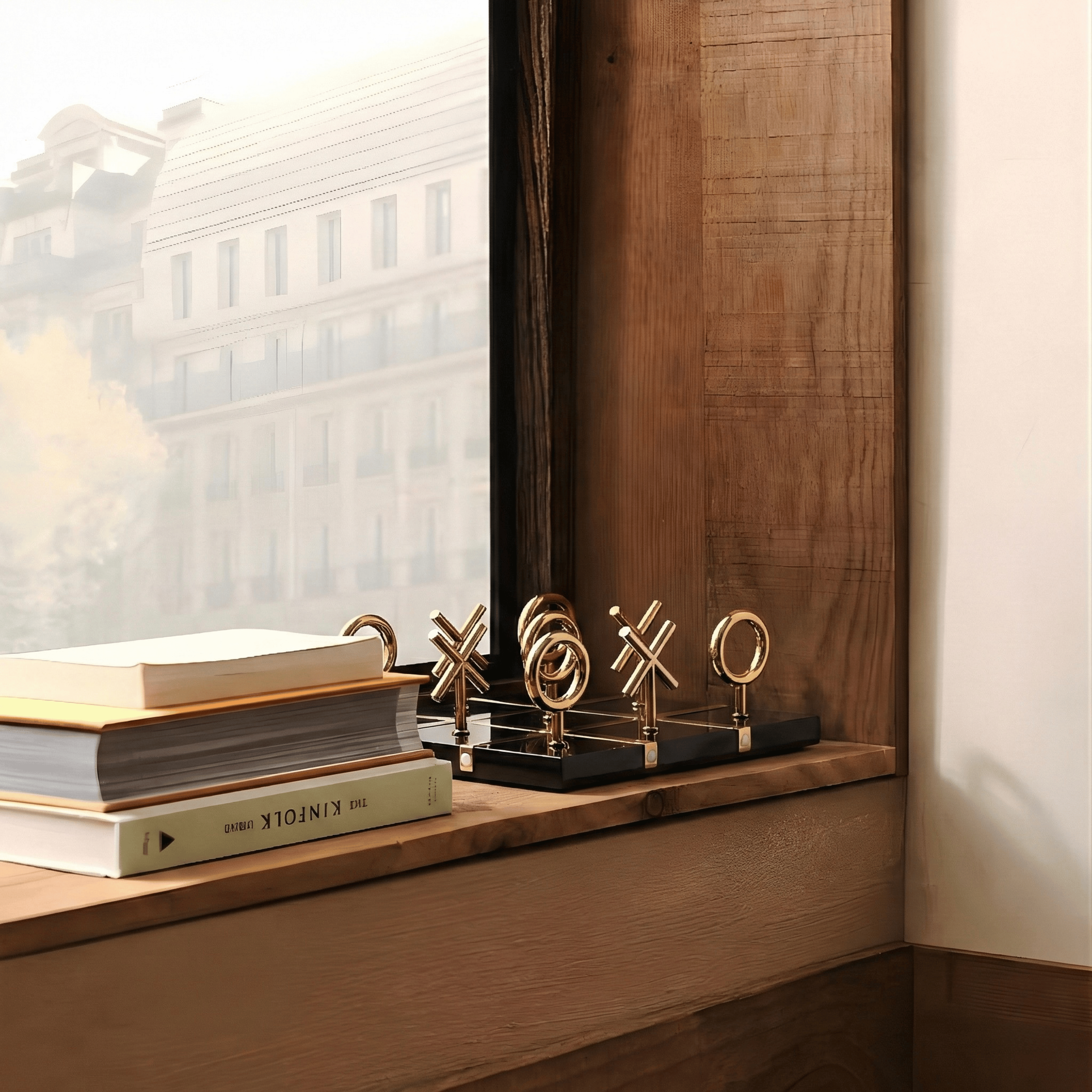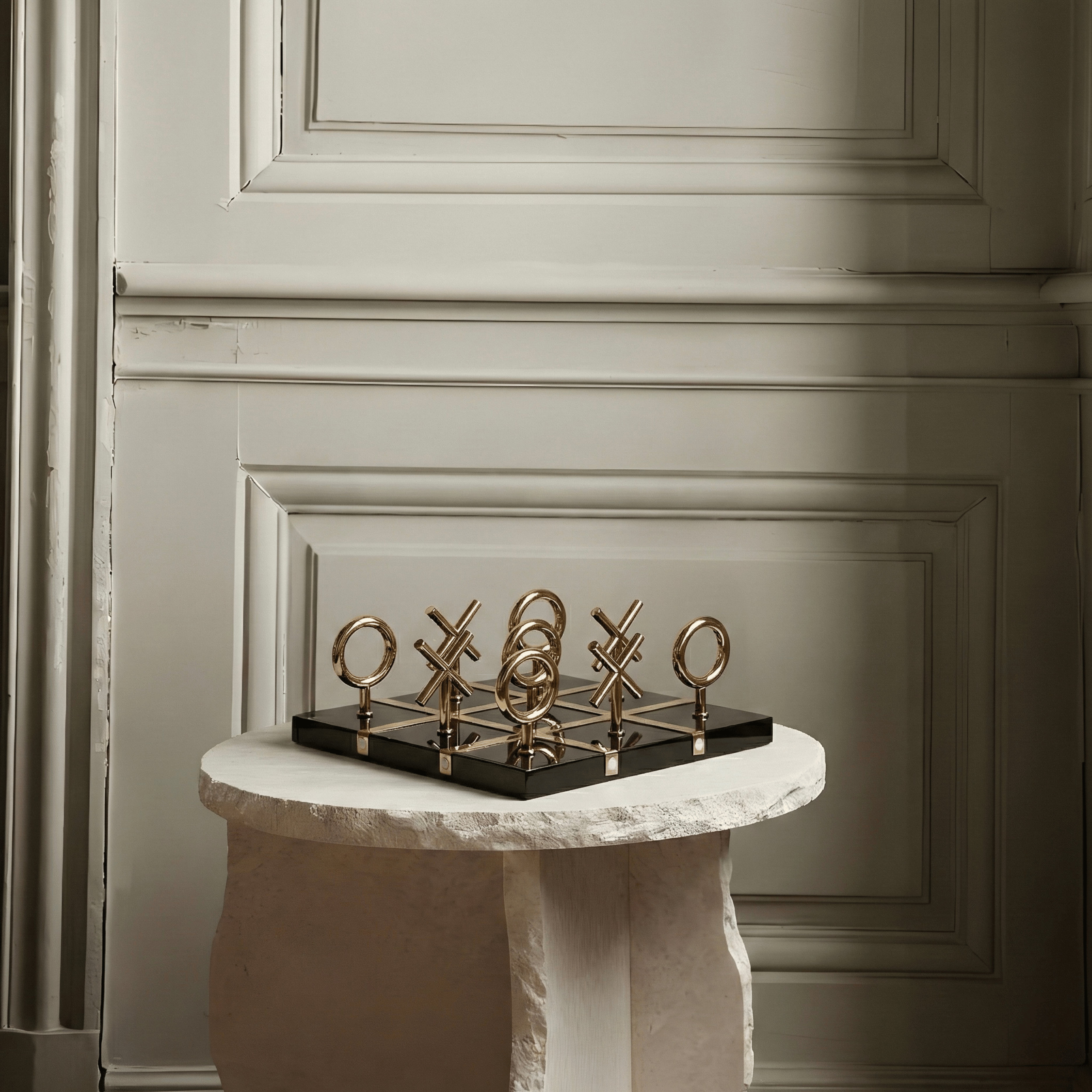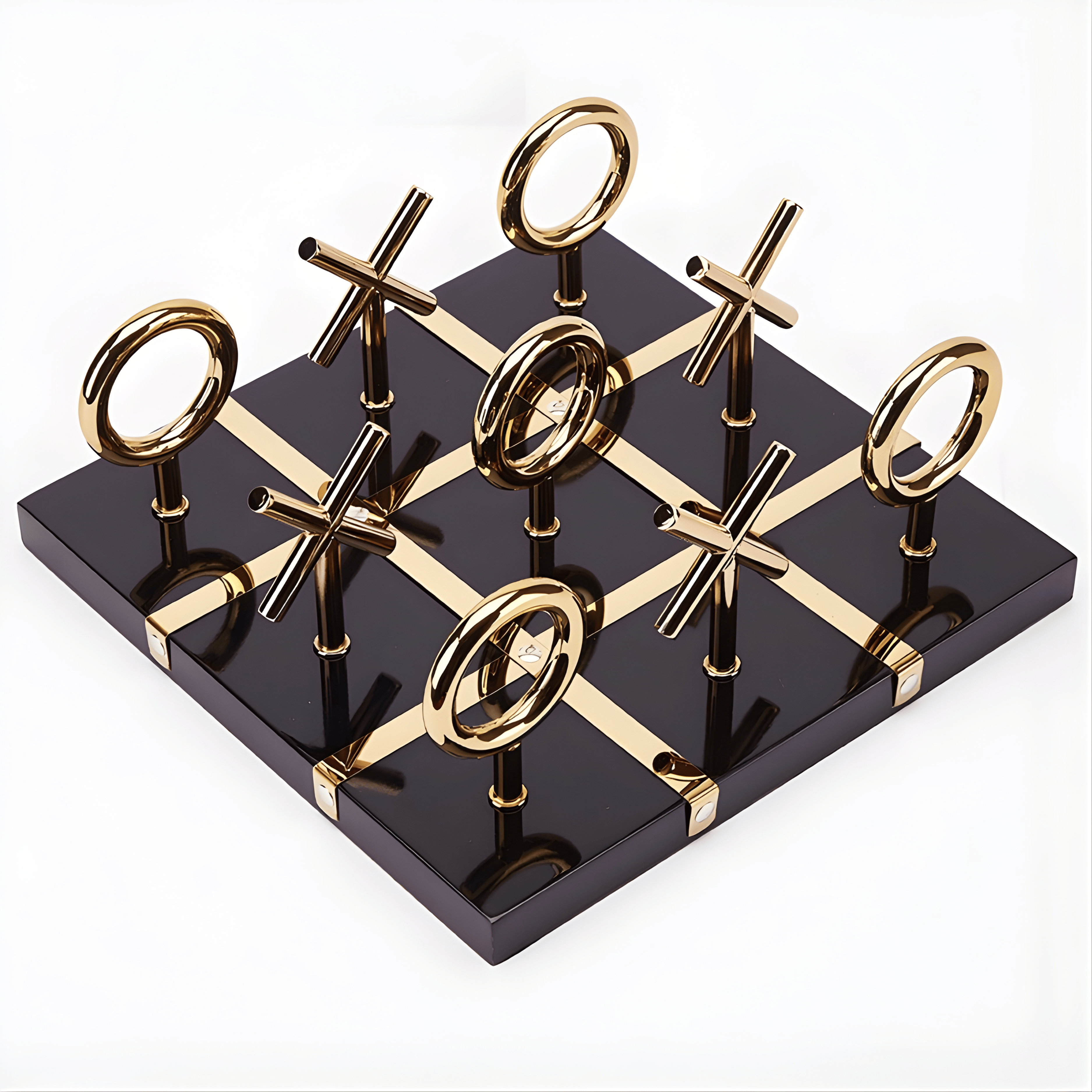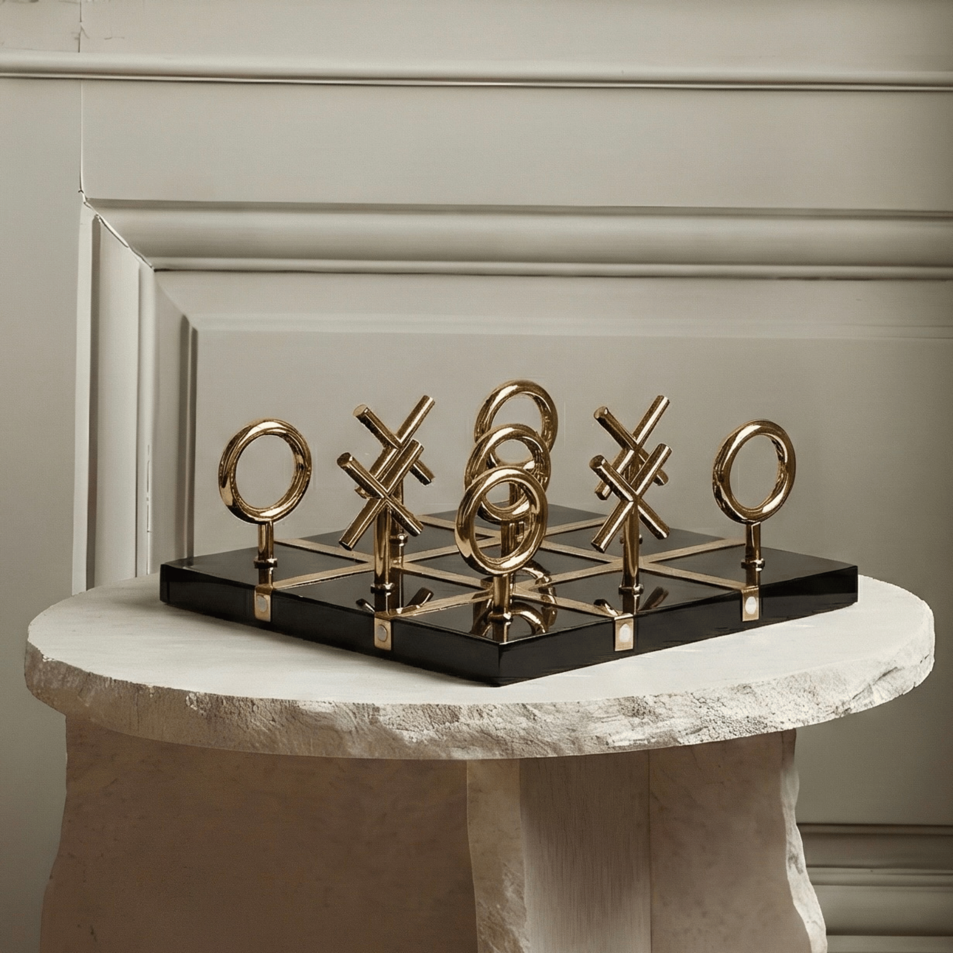 A bold reinterpretation of a classic strategy game. The deep black base contrasts with polished gold X and O pieces, creating a dramatic visual dialogue between strength and elegance. Each element stands vertically with architectural precision, transforming a simple grid into a sculptural centerpiece.