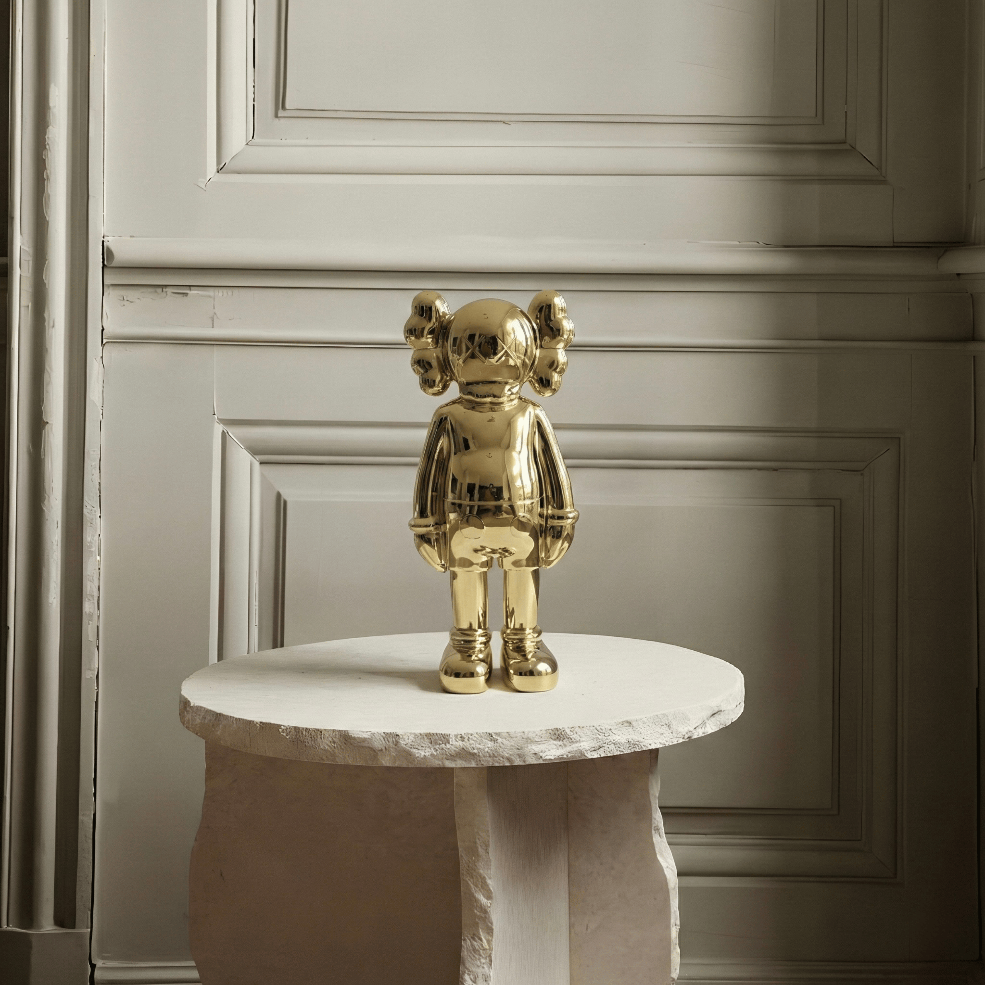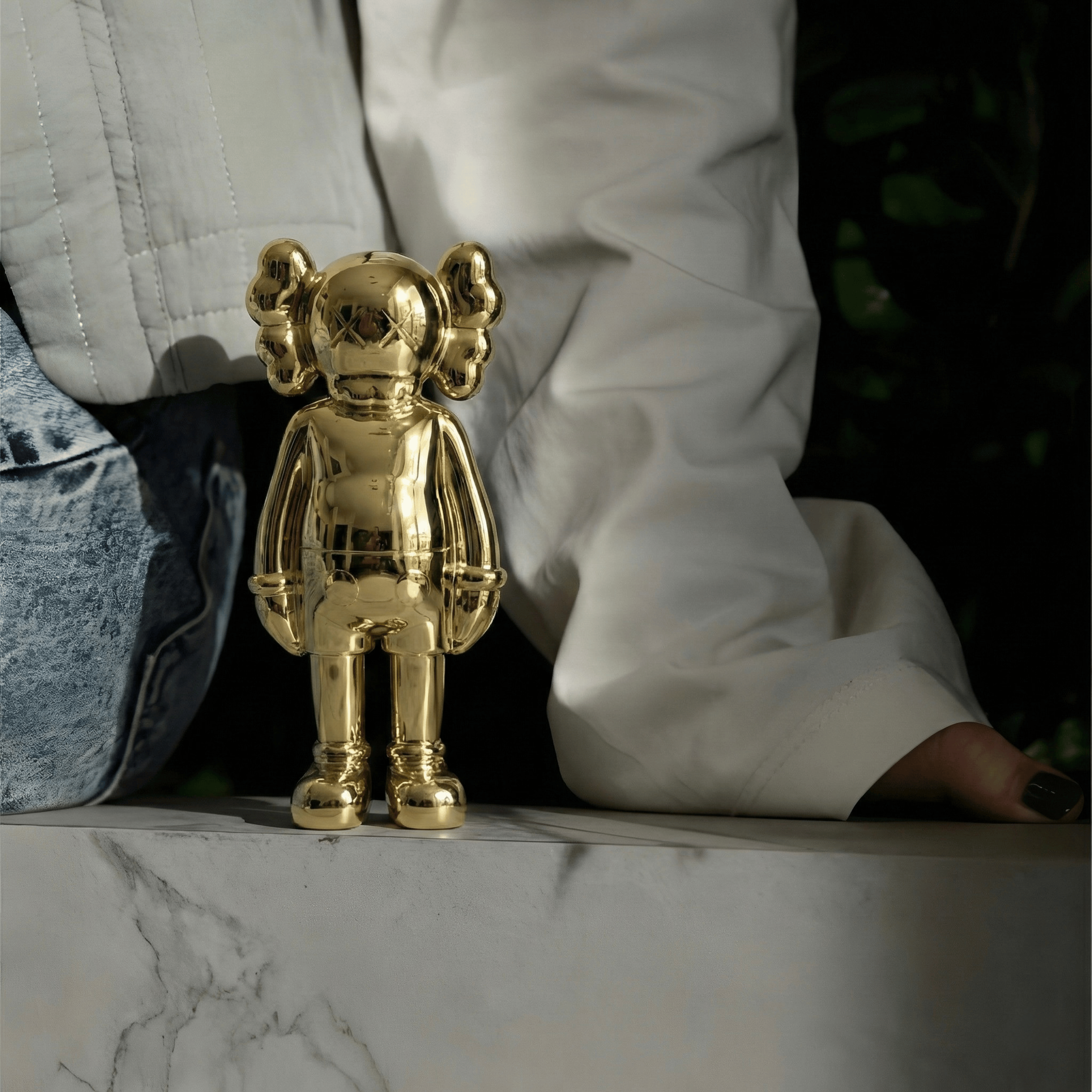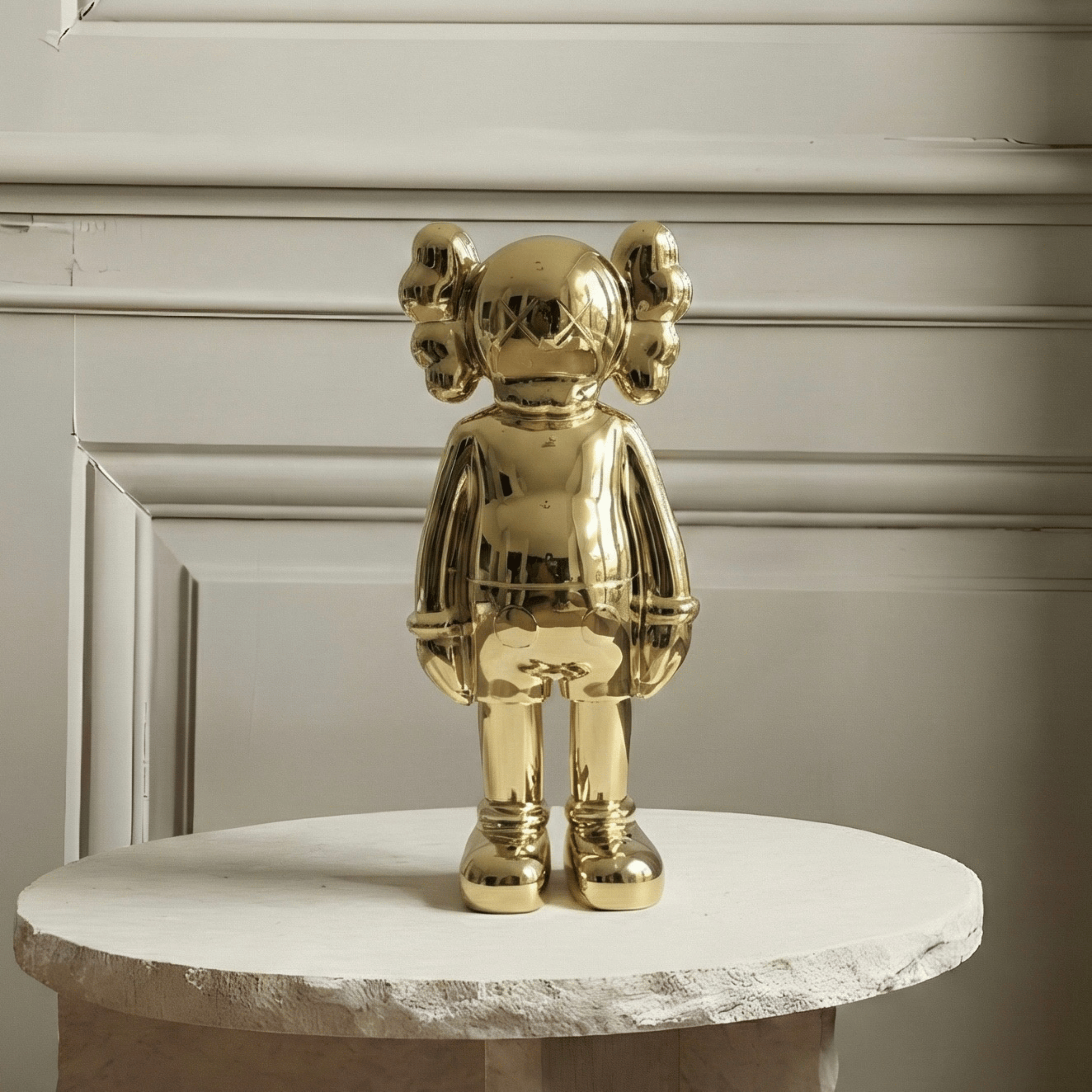This gold reflective character sculpture embodies bold contemporary art with a luxury twist. Inspired by collectible pop-art figures, the design features rounded proportions, oversized hands and feet, and signature crossed eyes that create strong visual identity. The high-gloss metallic gold finish transforms the playful silhouette into a sophisticated statement piece, reflecting surrounding light and architecture for a dynamic, gallery-like presence.