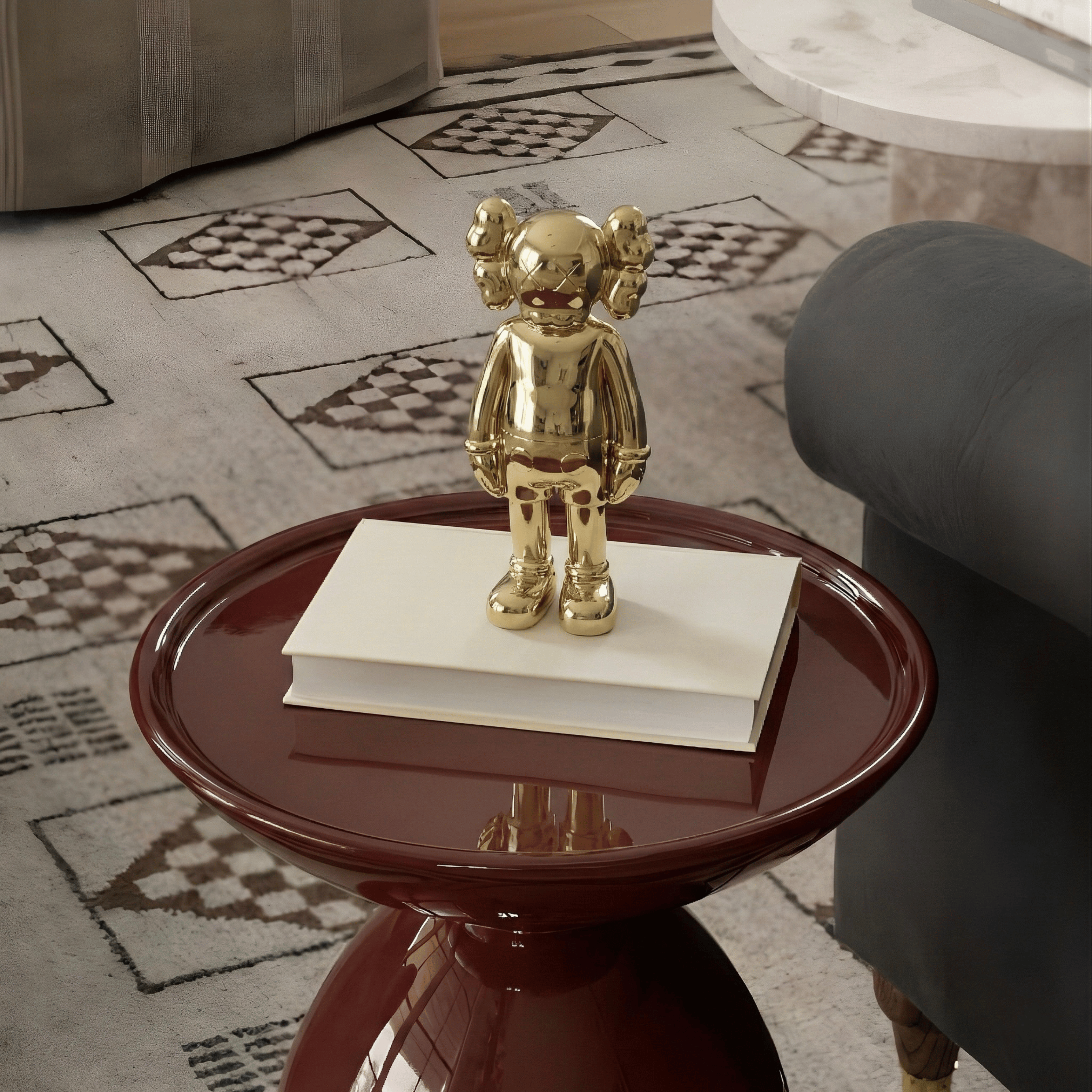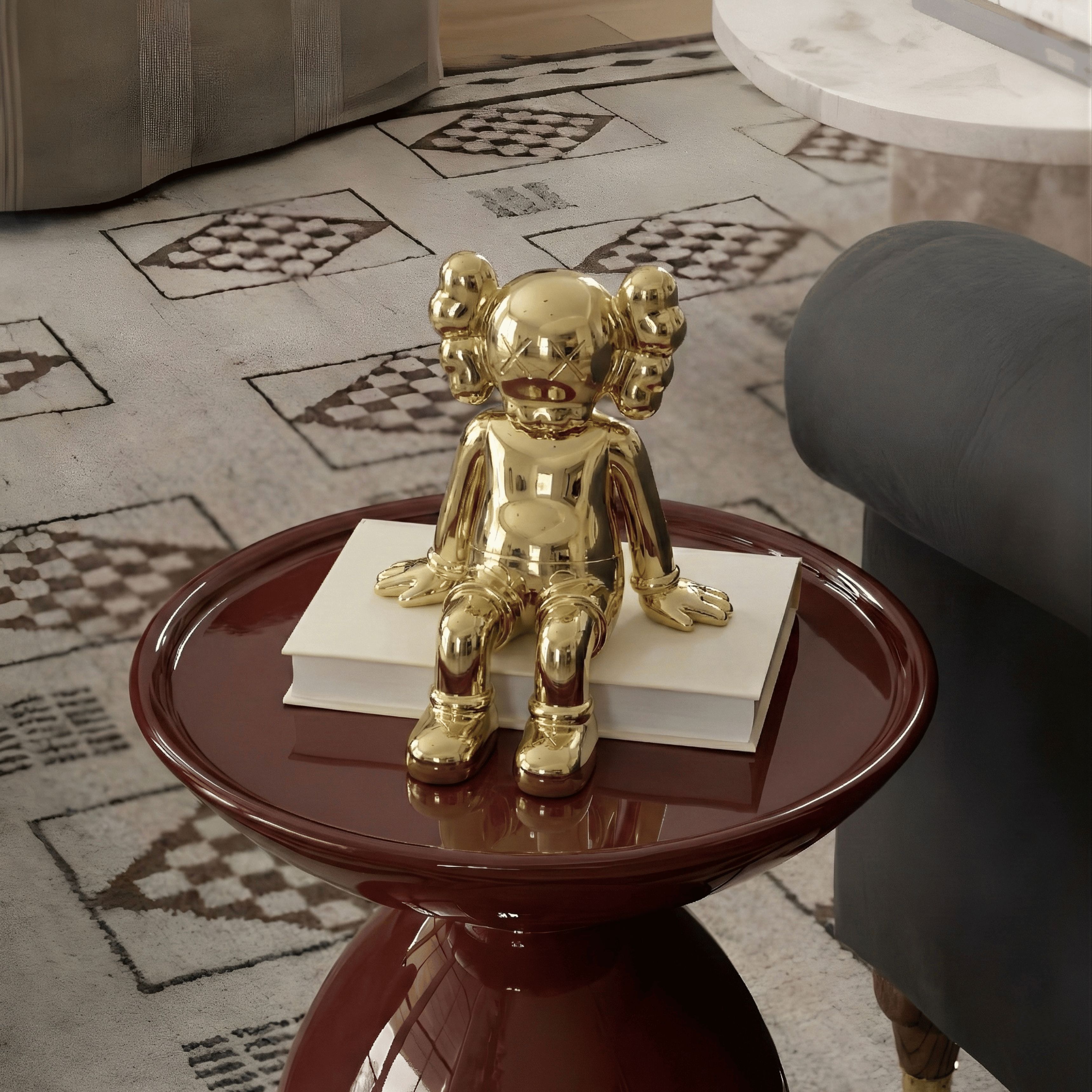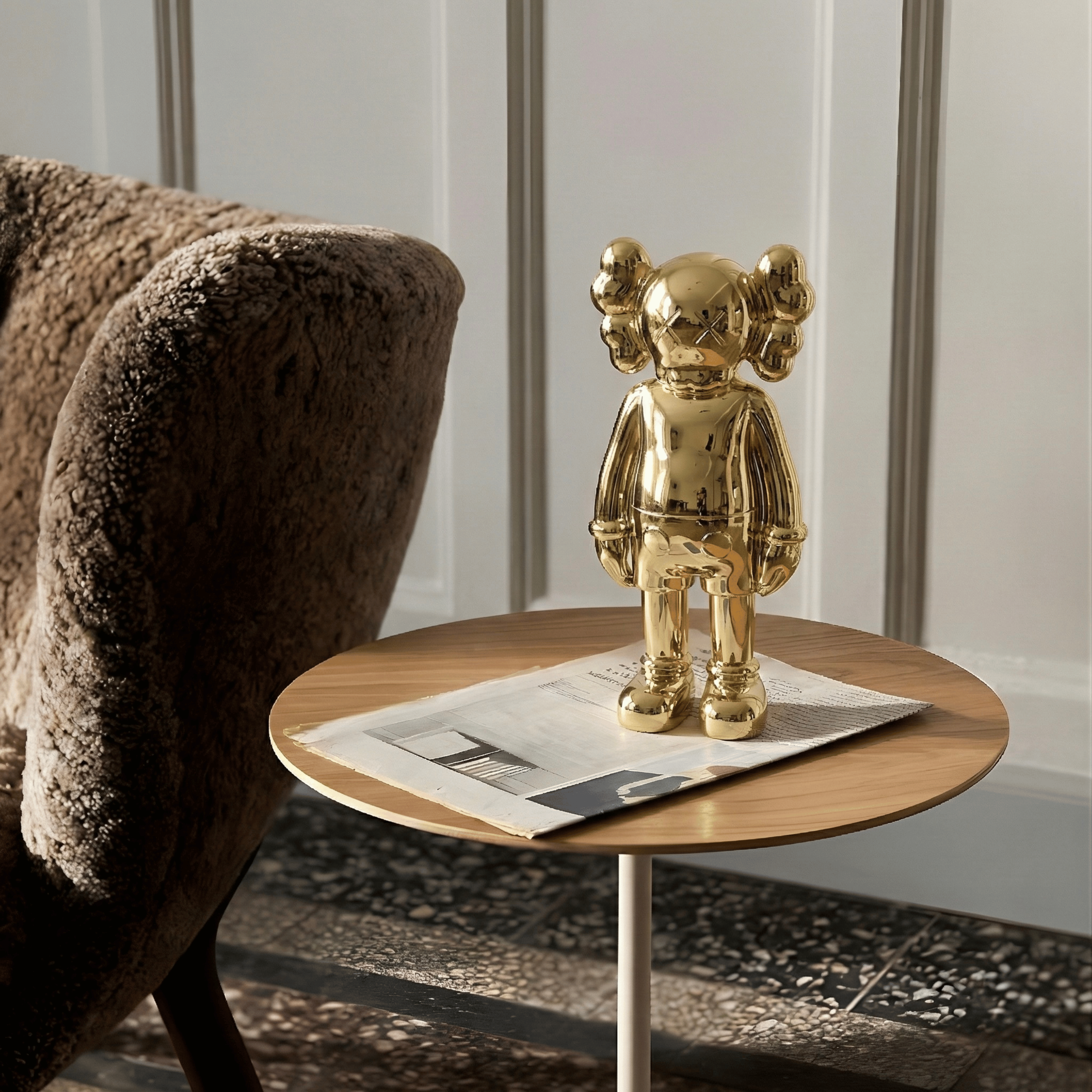 This gold reflective character sculpture embodies bold contemporary art with a luxury twist. Inspired by collectible pop-art figures, the design features rounded proportions, oversized hands and feet, and signature crossed eyes that create strong visual identity. The high-gloss metallic gold finish transforms the playful silhouette into a sophisticated statement piece, reflecting surrounding light and architecture for a dynamic, gallery-like presence.
