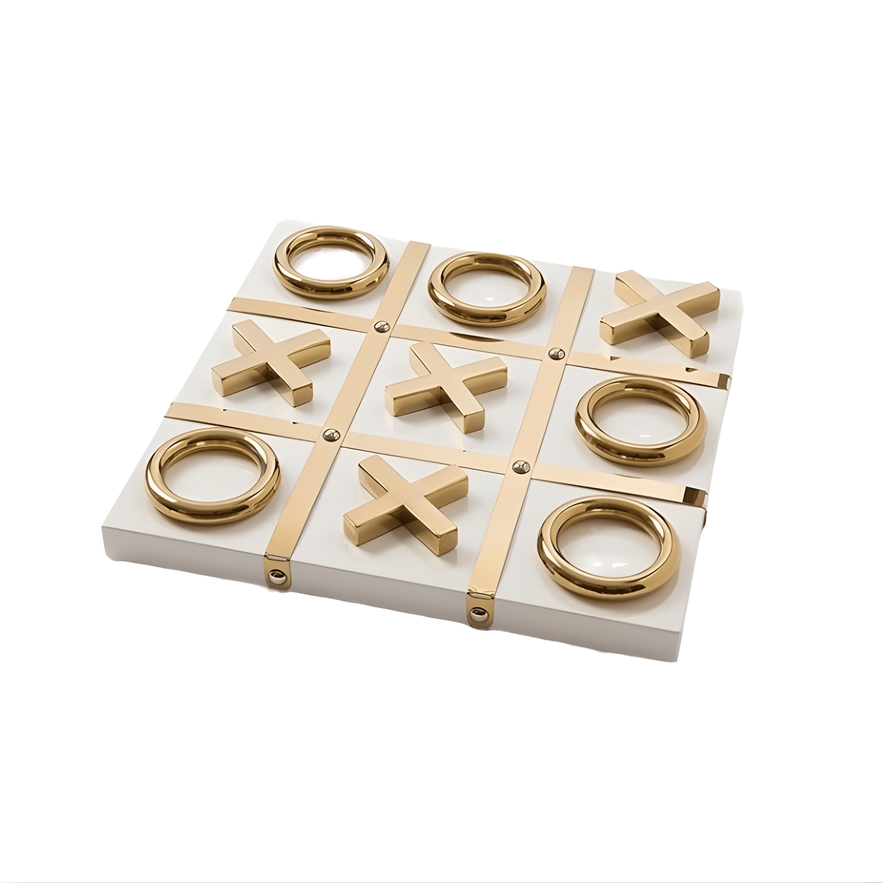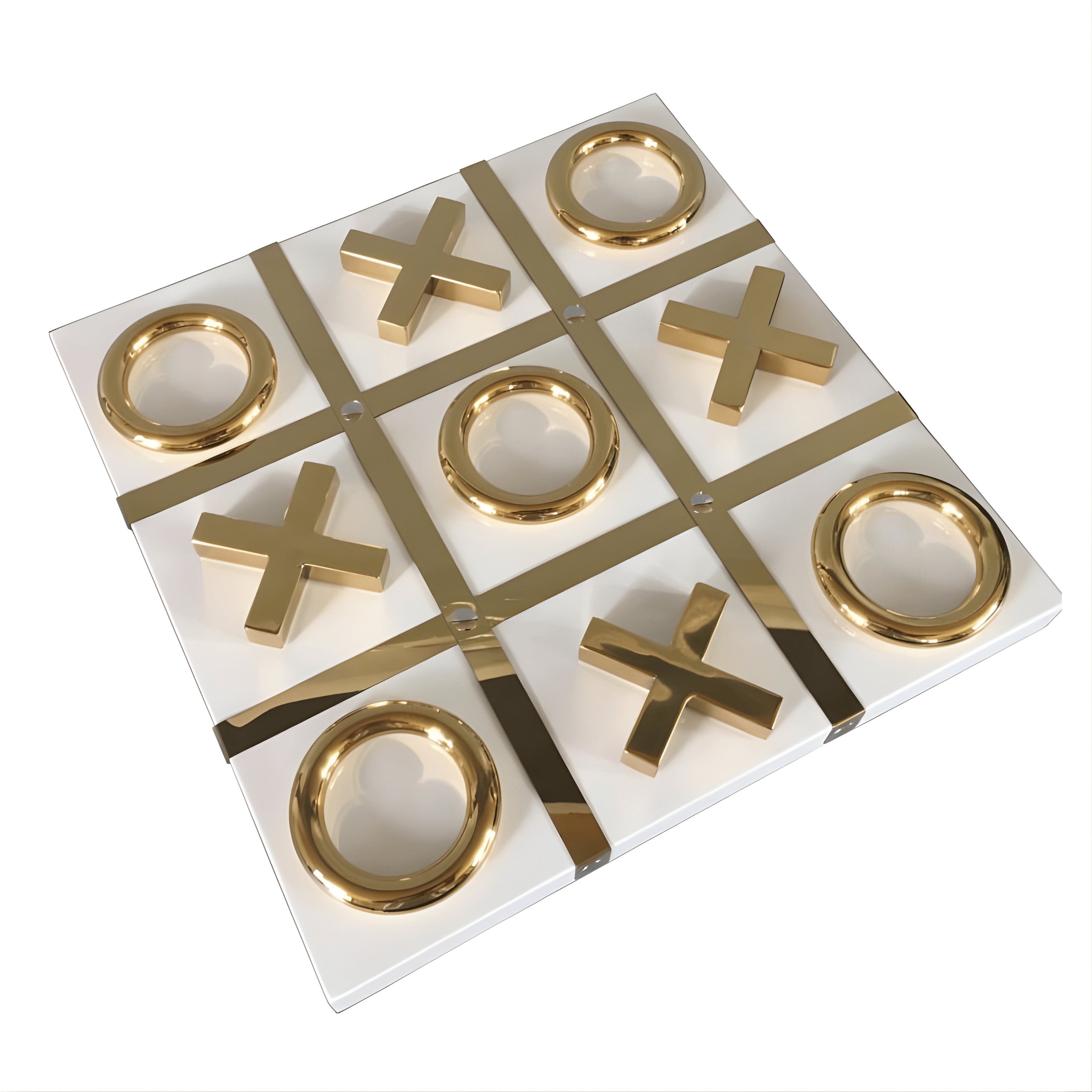 Designed with a clean geometric board and sculptural metallic pieces, this set elevates the traditional Tic Tac Toe into a decorative object. The glossy gold X and O pieces introduce depth and shine, while the crisp white base maintains a modern minimalist aesthetic. The result is both playful and elegant.