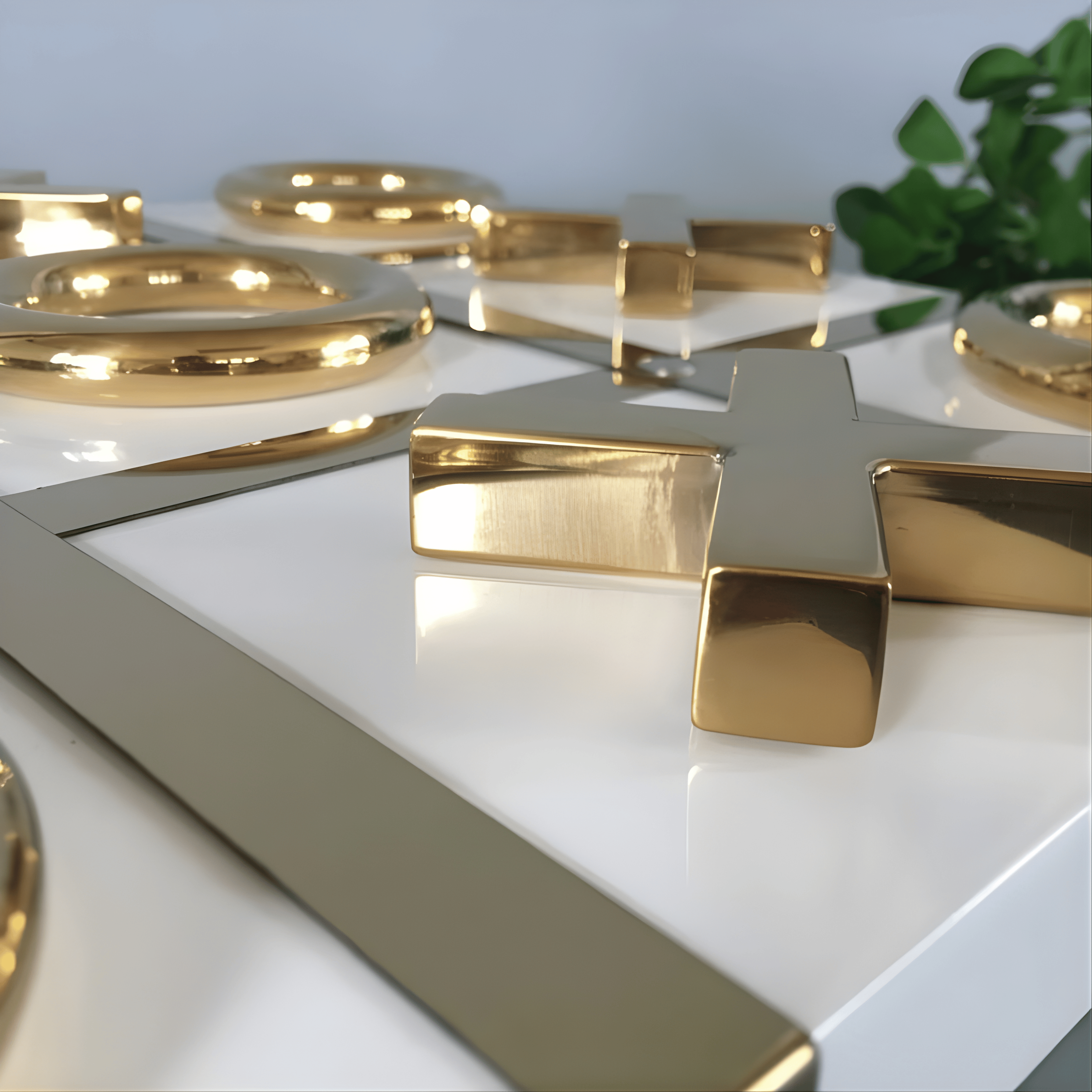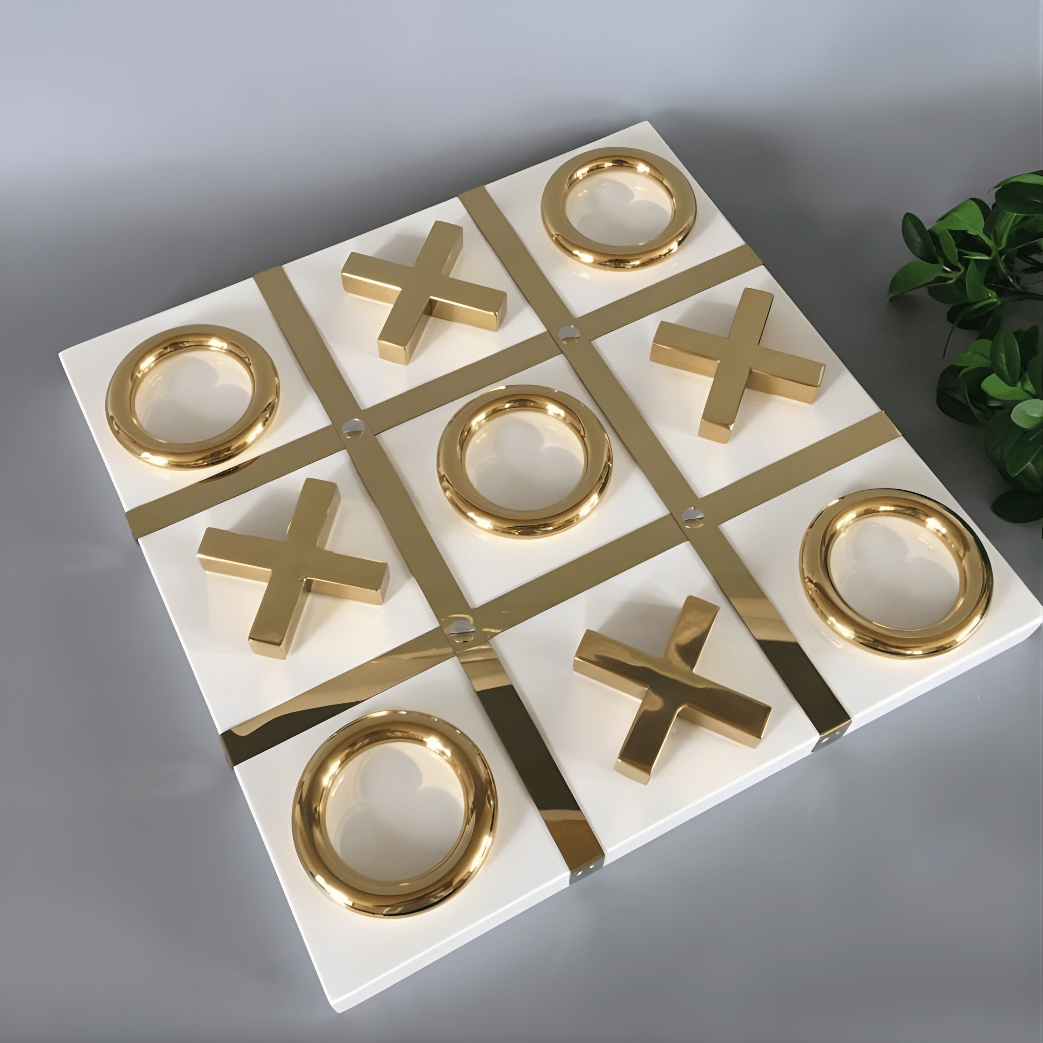 A classic game reimagined as a decorative statement. Golden Strategy Tic Tac Toe transforms the familiar childhood game into a refined tabletop sculpture, blending playful interaction with elegant design. The polished gold pieces con