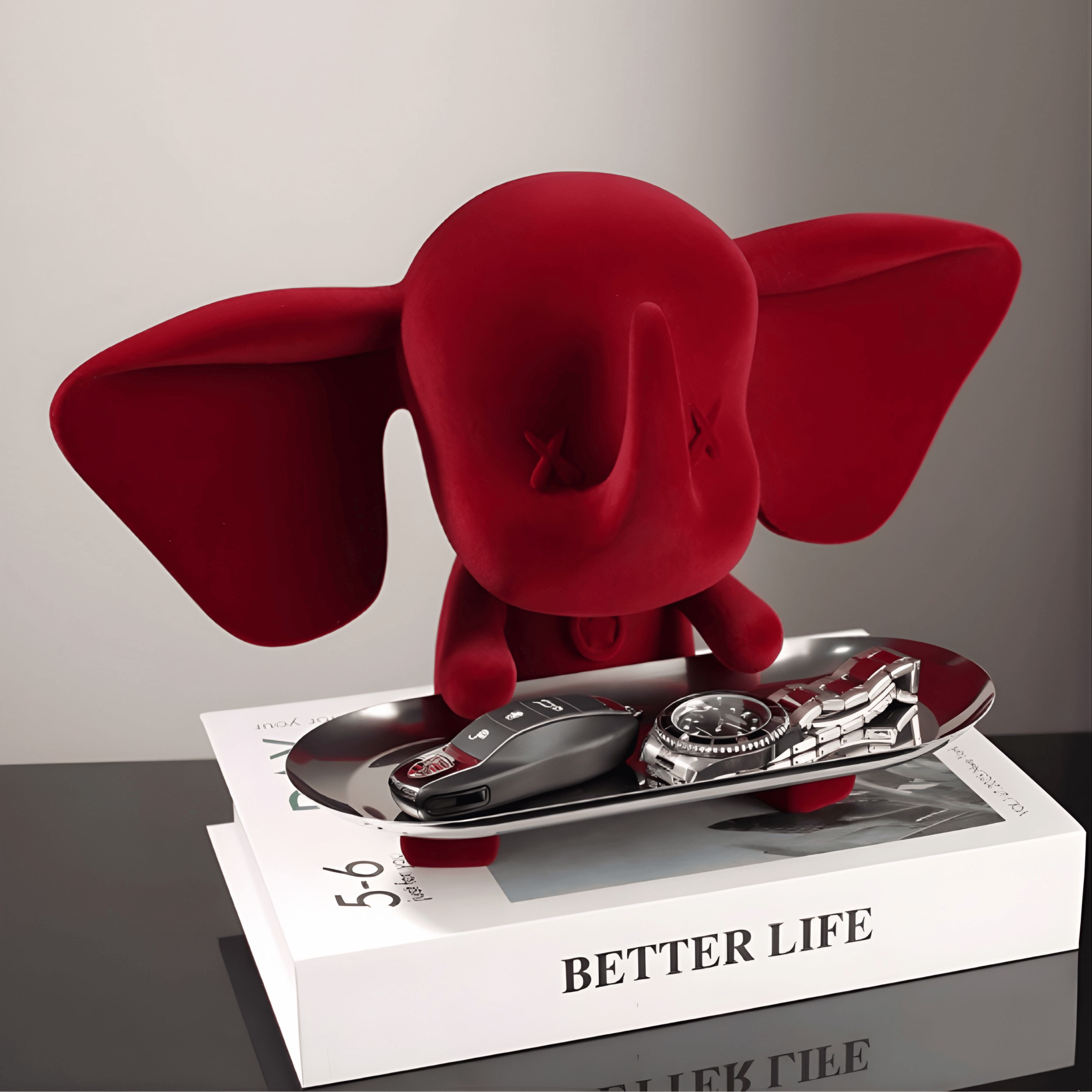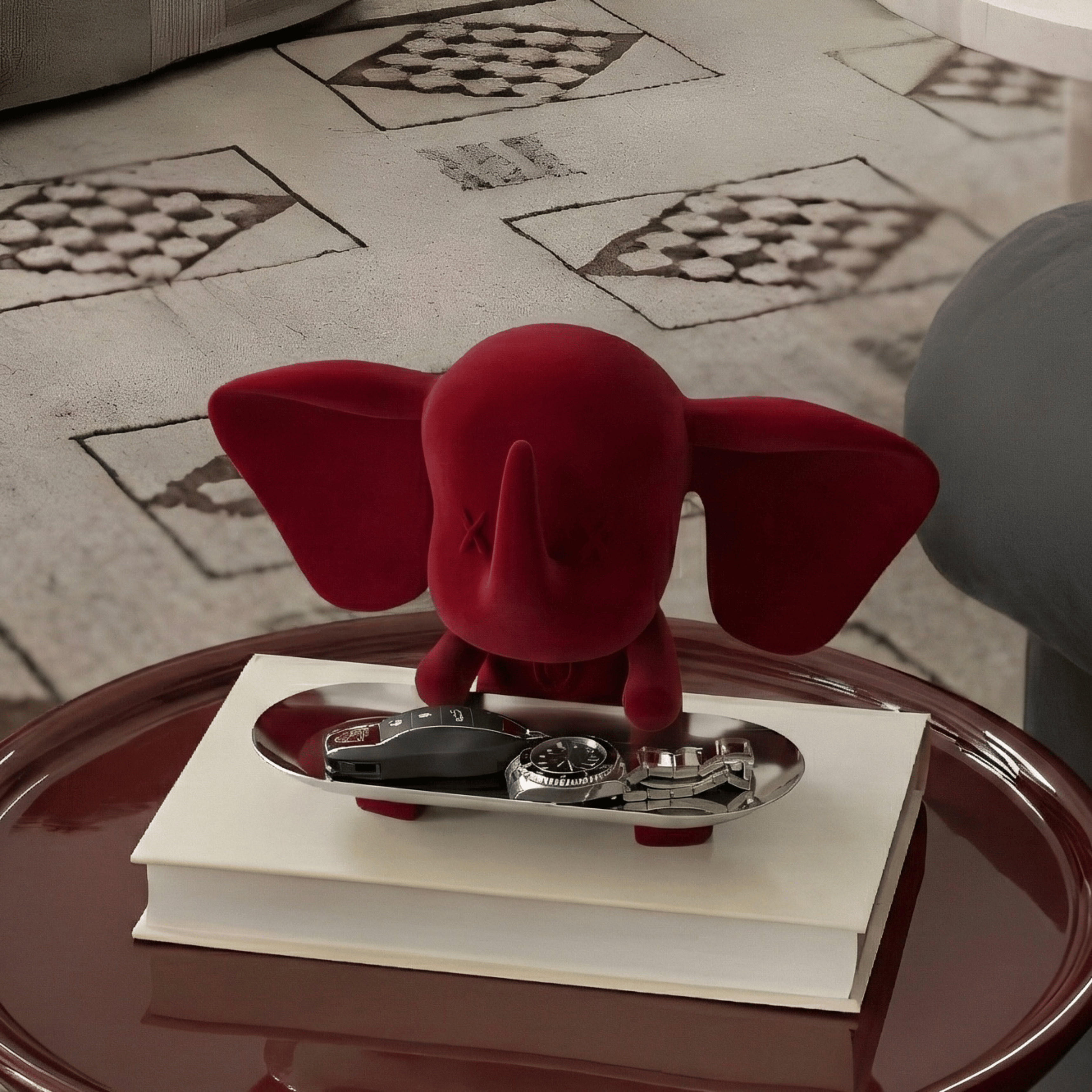 A bold reinterpretation of character-inspired art, this sculptural piece merges playful form with contemporary edge. The matte black finish contrasts beautifully with the deep amber-toned ears, while the subtle metallic tray element introduces a refined balance. Minimal facial detailing creates a striking, graphic presence that feels modern and collectible.