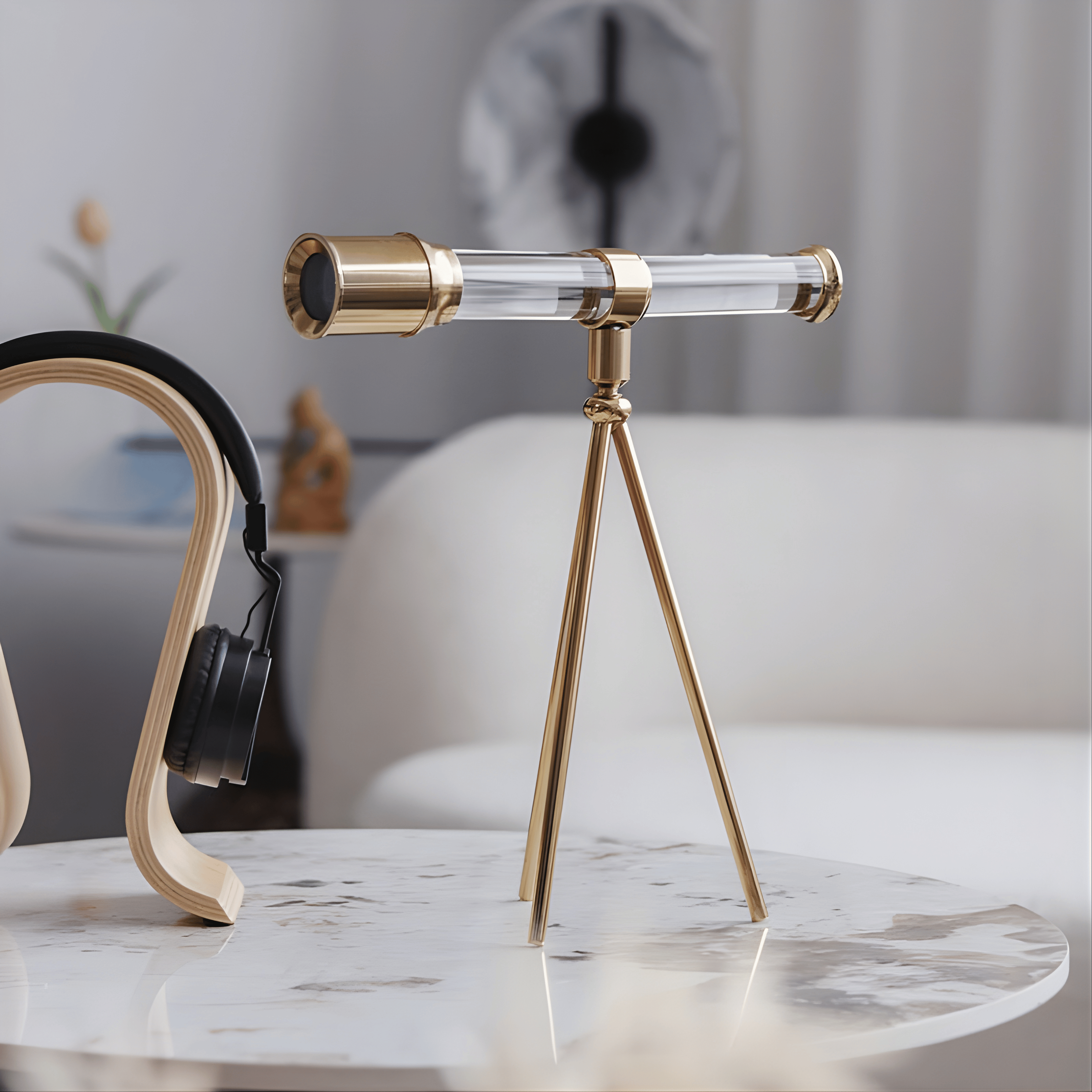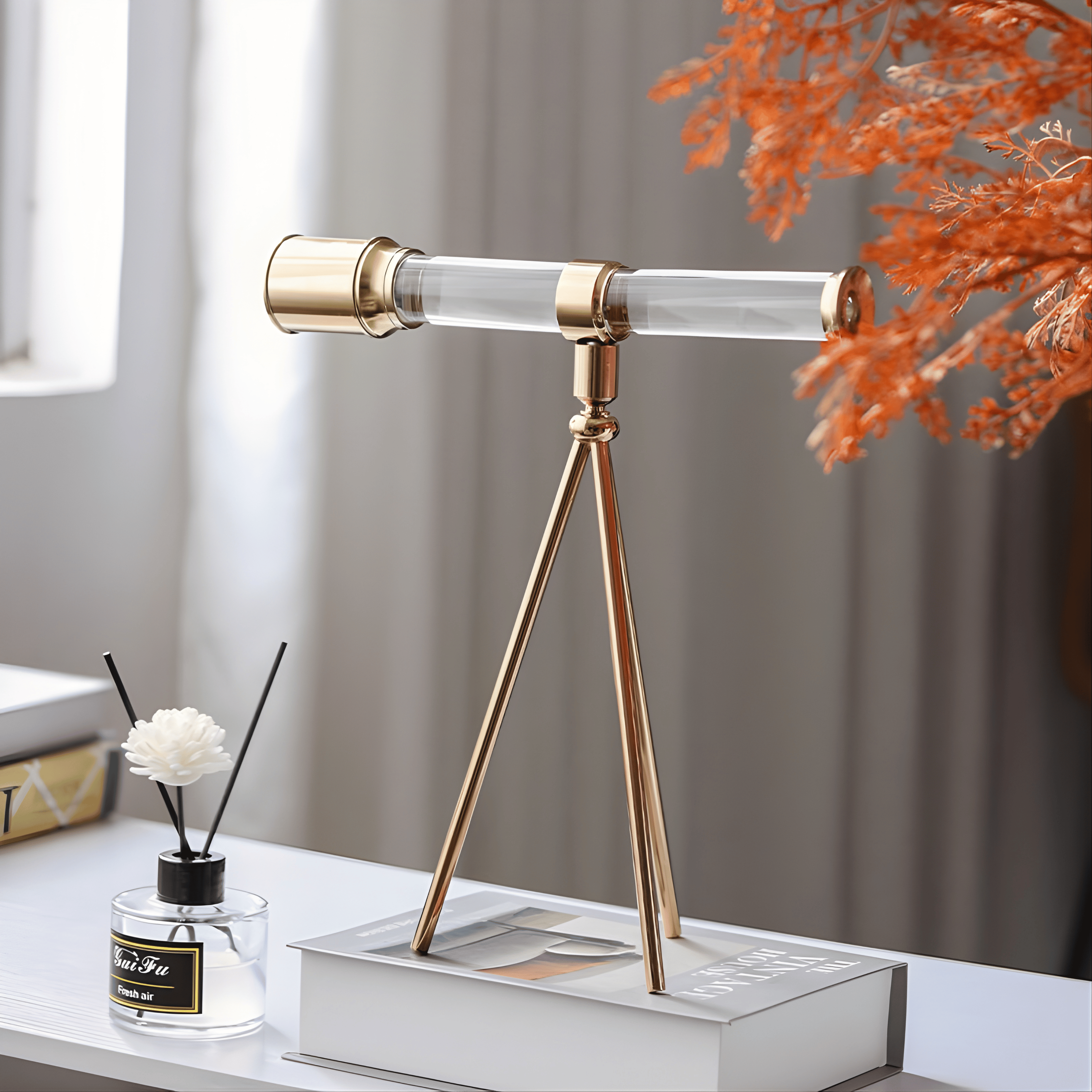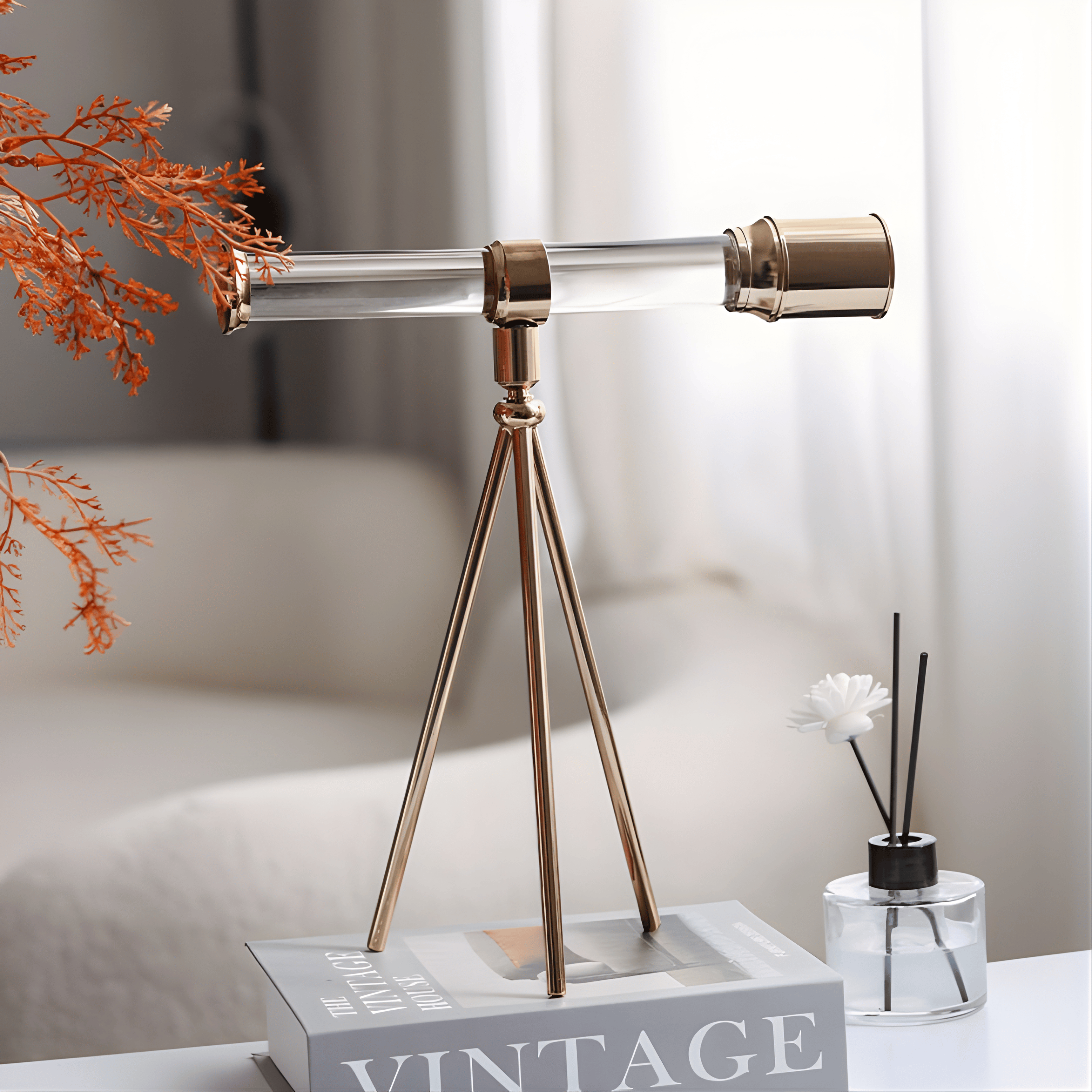 A refined decorative telescope that blends curiosity with elegance. The transparent crystal-clear barrel paired with brushed gold detailing creates a harmonious balance between clarity and prestige. Its minimalist tripod structure adds architectural lightness, making it a timeless statement of exploration and vision.