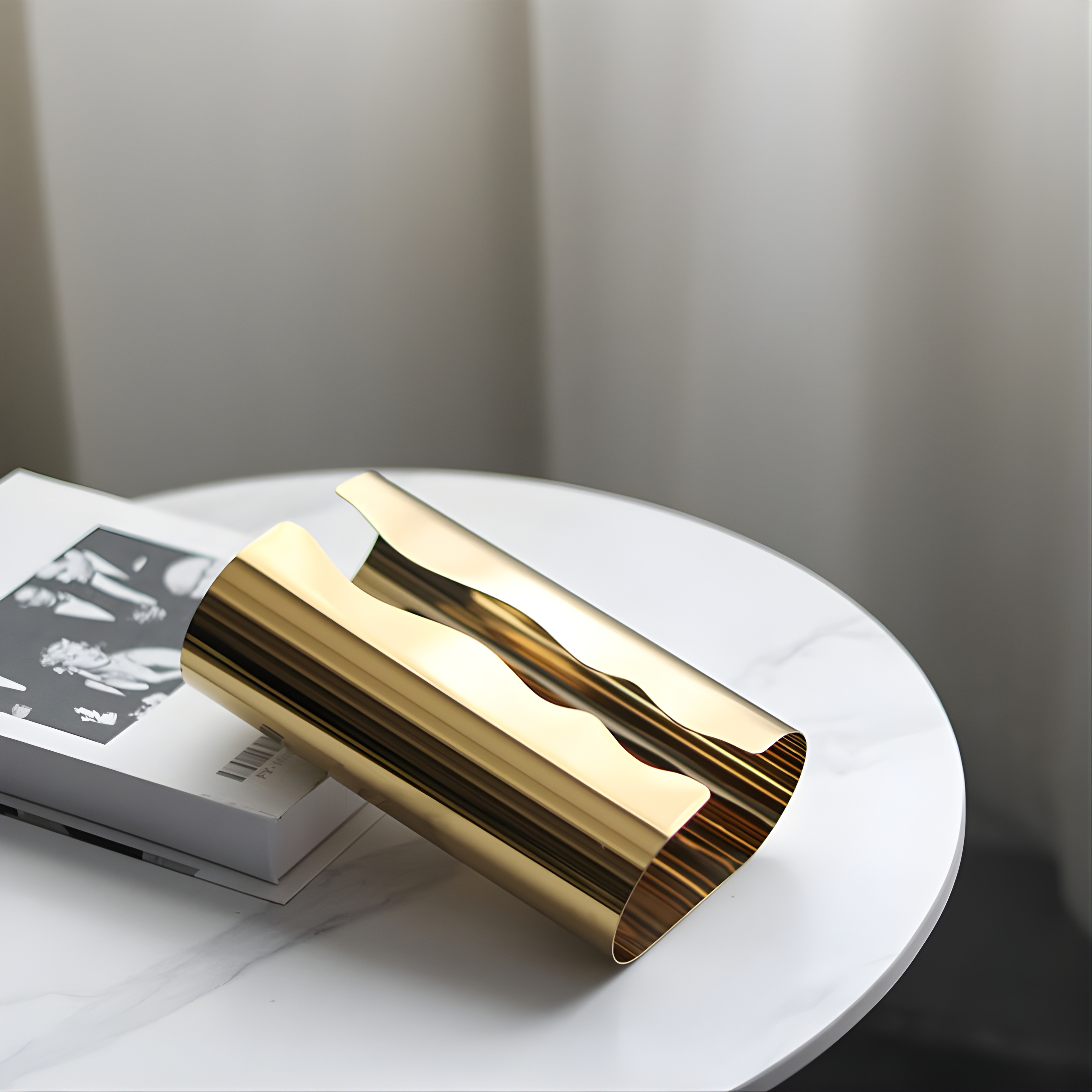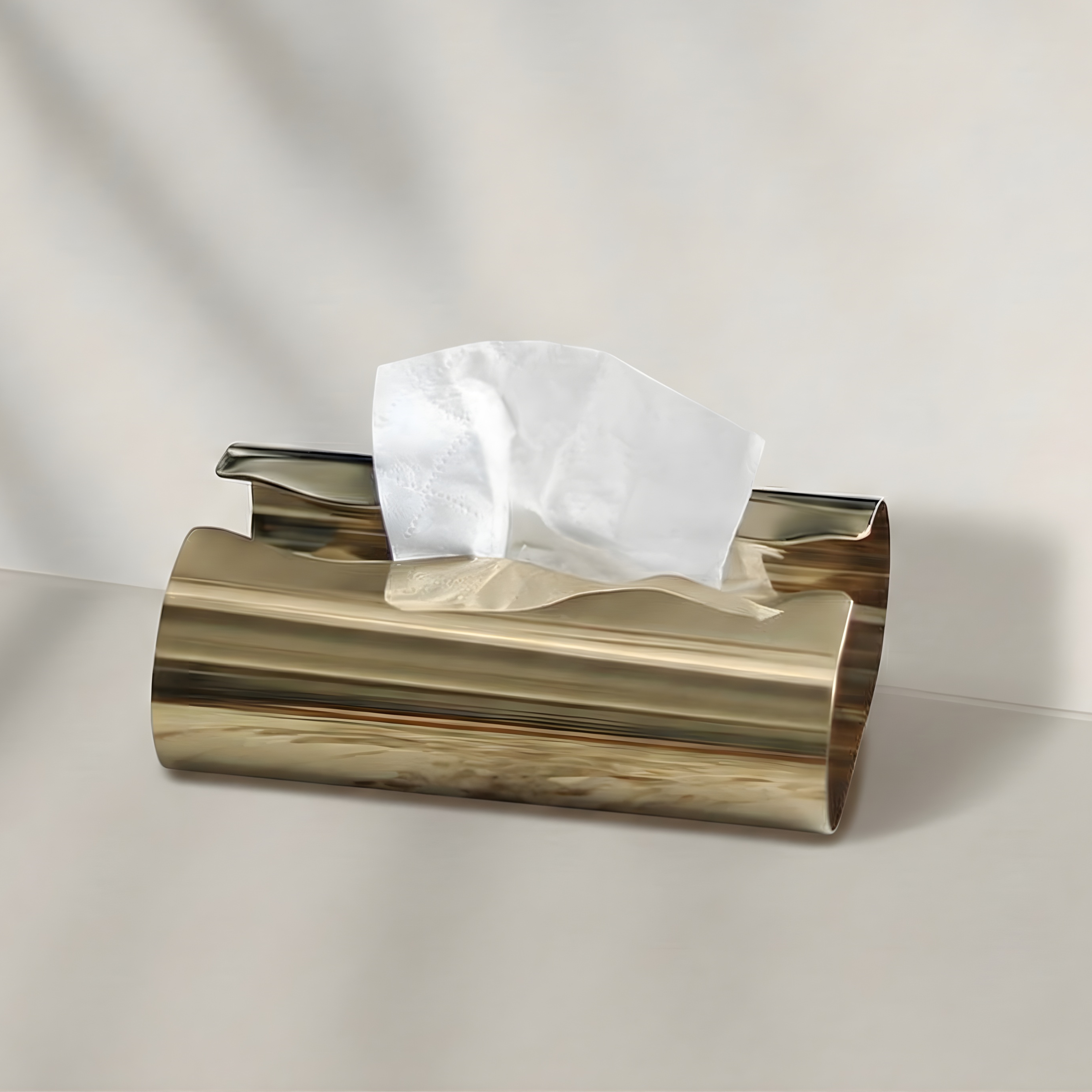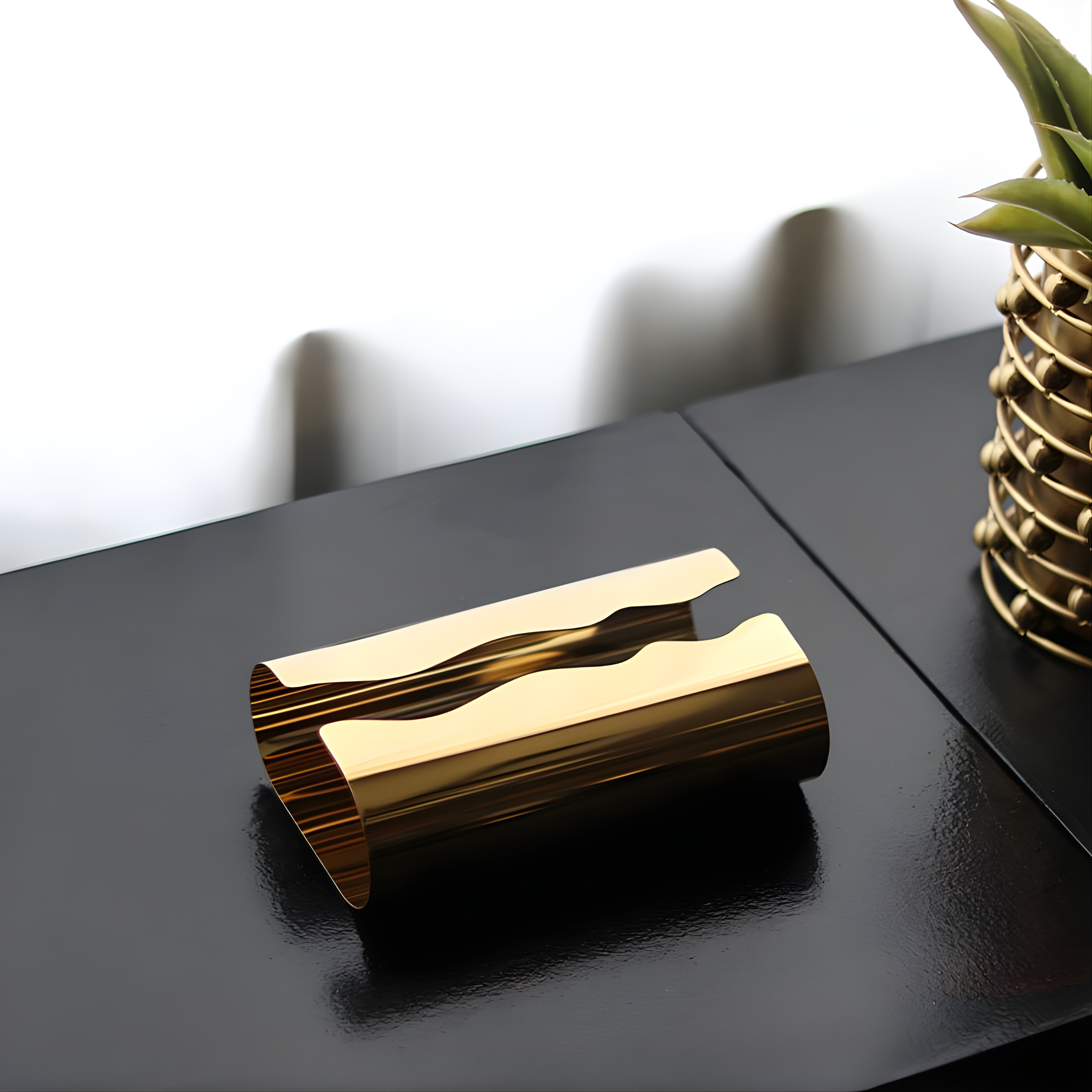 Defined by soft edges and polished metal, this holder adds a subtle functional accent to tables and countertops.