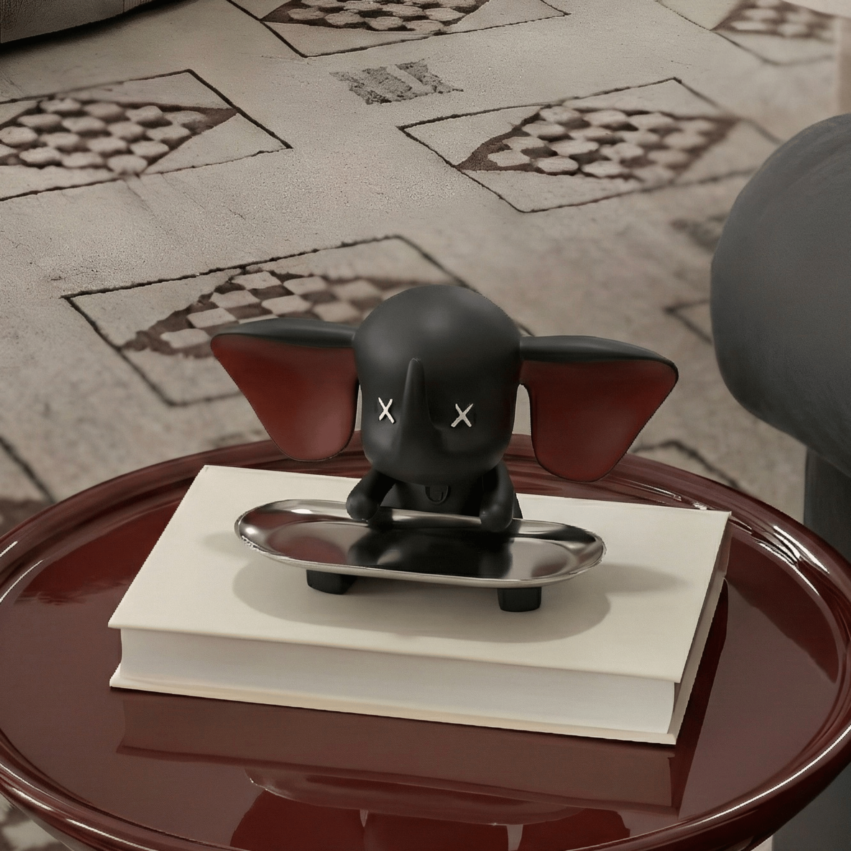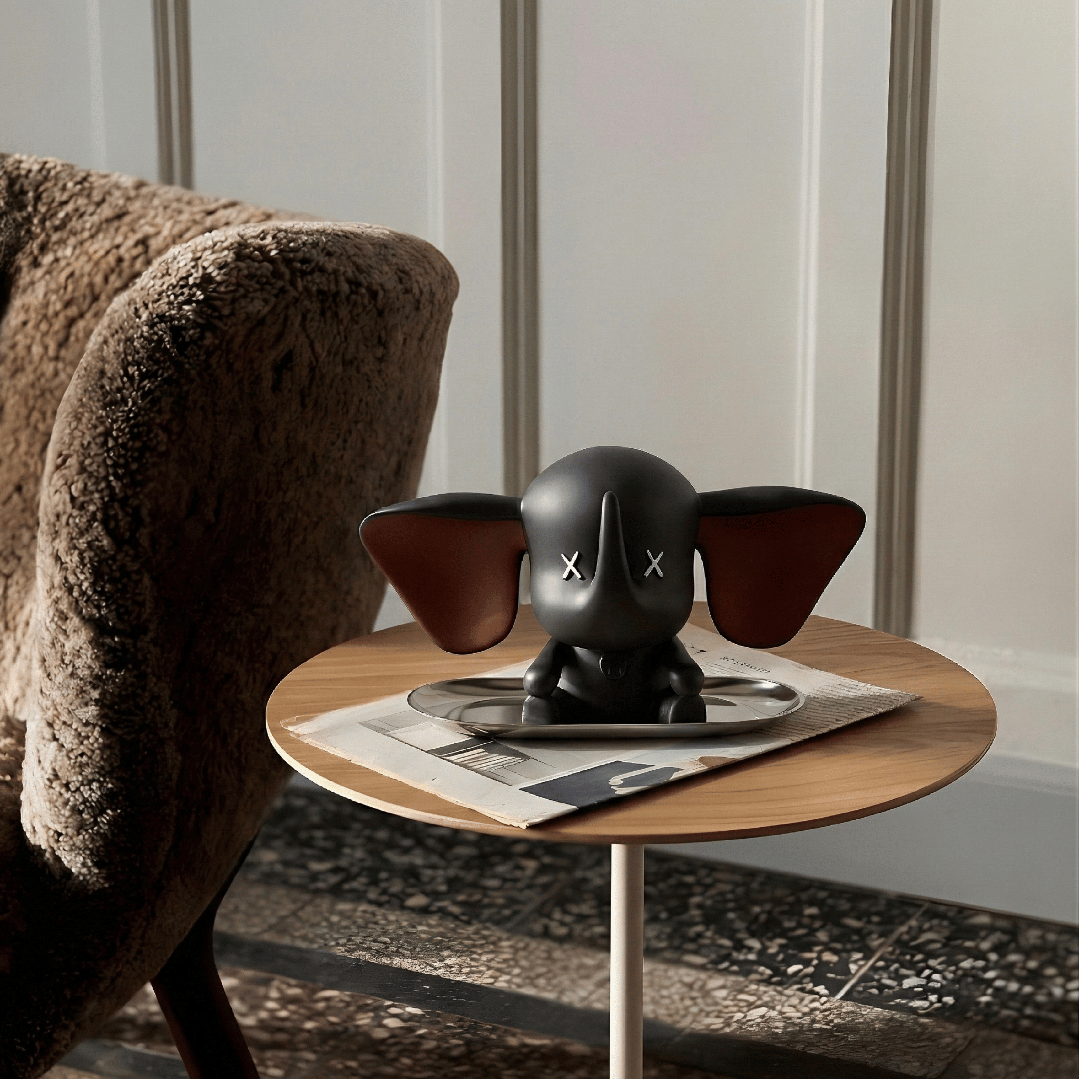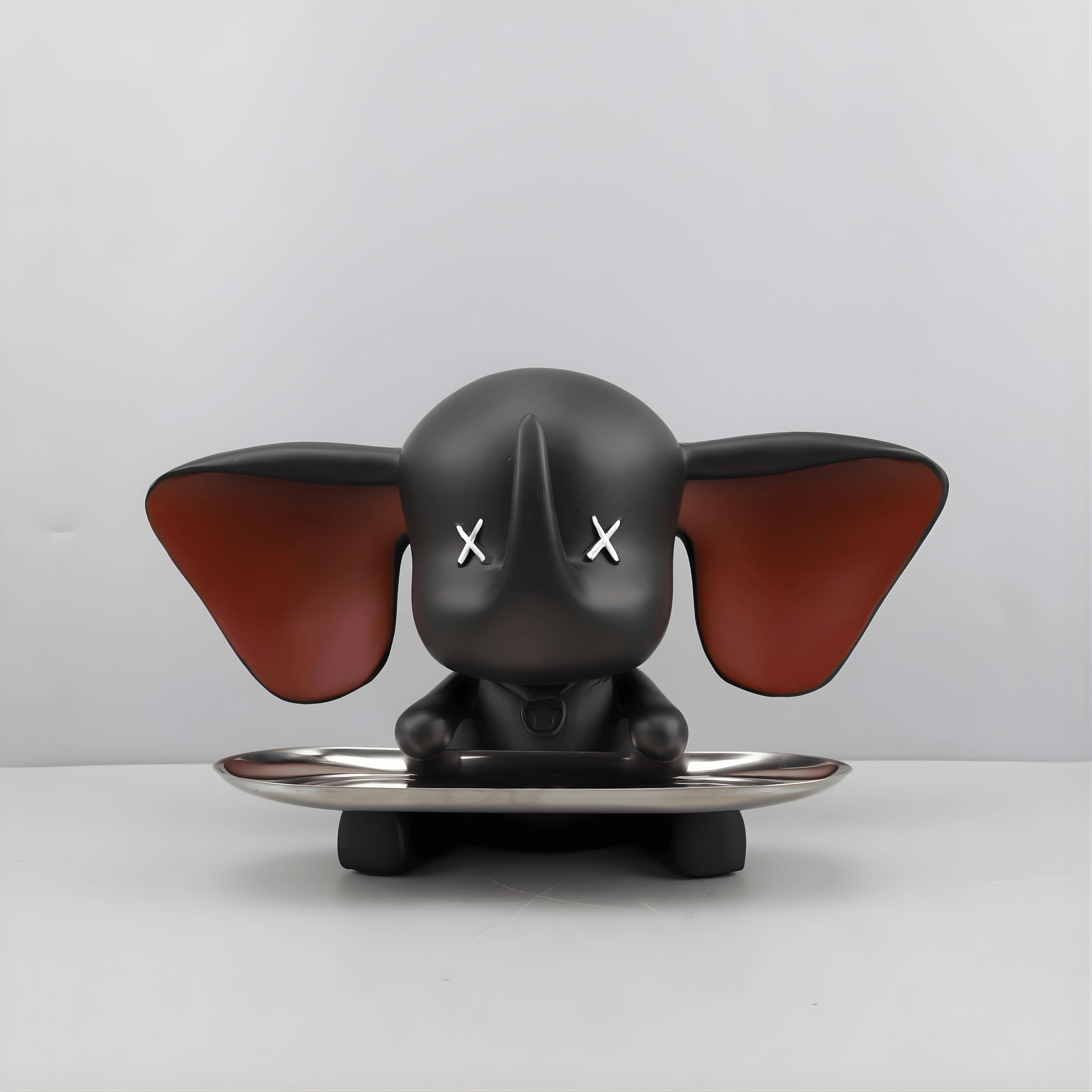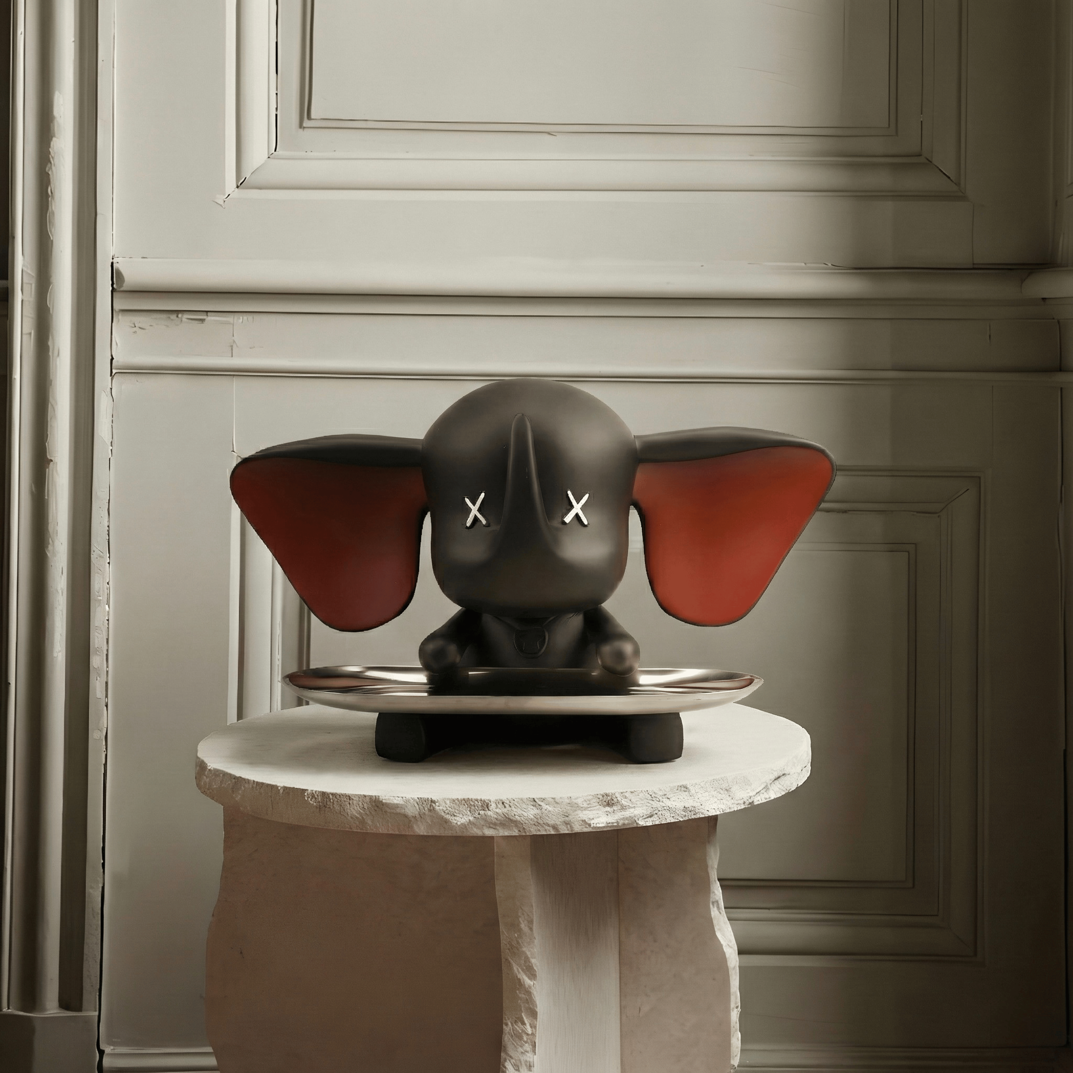 A bold reinterpretation of character-inspired art, this sculptural piece merges playful form with contemporary edge. The matte black finish contrasts beautifully with the deep amber-toned ears, while the subtle metallic tray element introduces a refined balance. Minimal facial detailing creates a striking, graphic presence that feels modern and collectible.