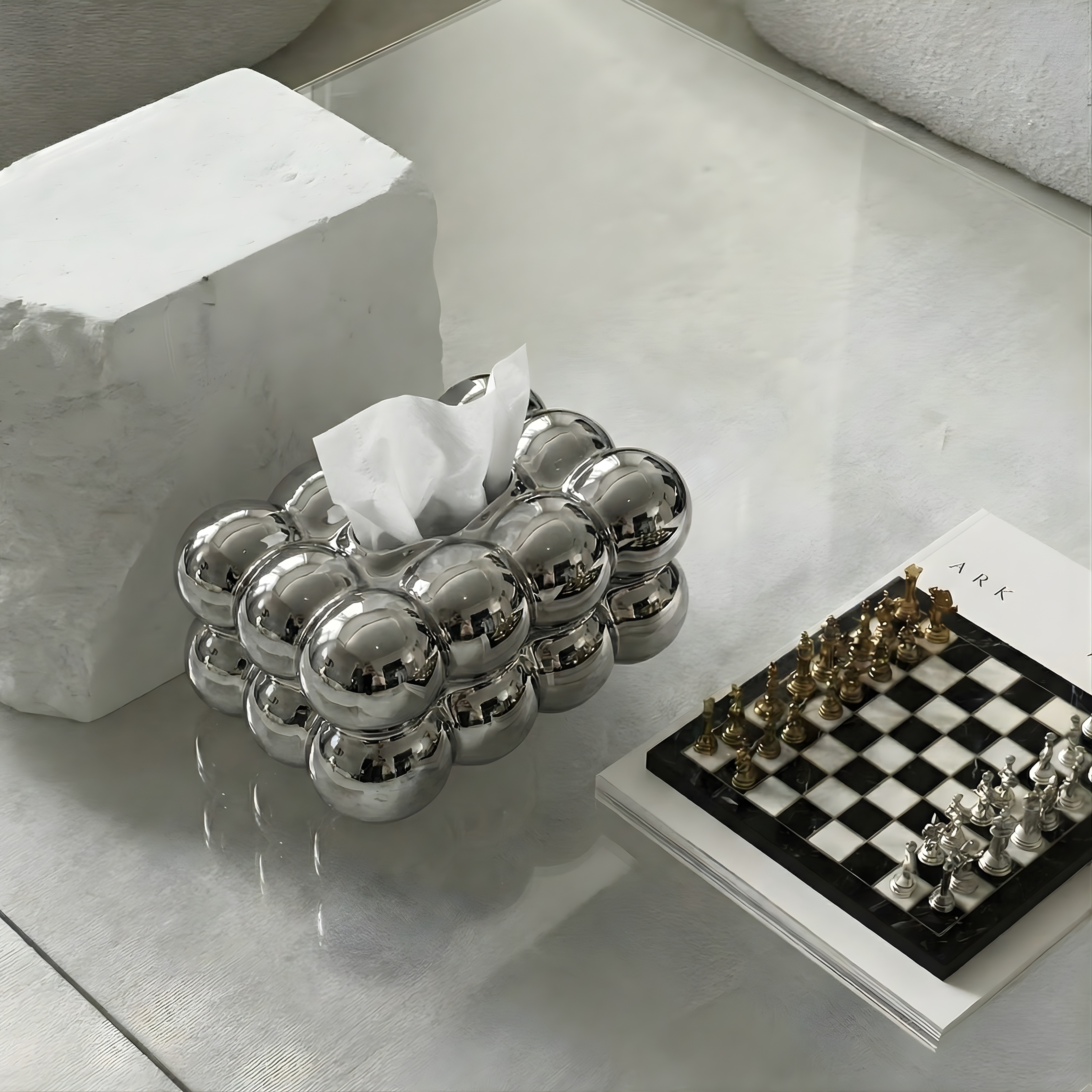 Ideal for coffee tables, bedside units, desks, or bathroom counters, this tissue box blends seamlessly into modern, minimal, or monochrome interiors. Its reflective finish subtly mirrors its surroundings, allowing it to adapt effortlessly to different spaces while adding a sculptural accent.