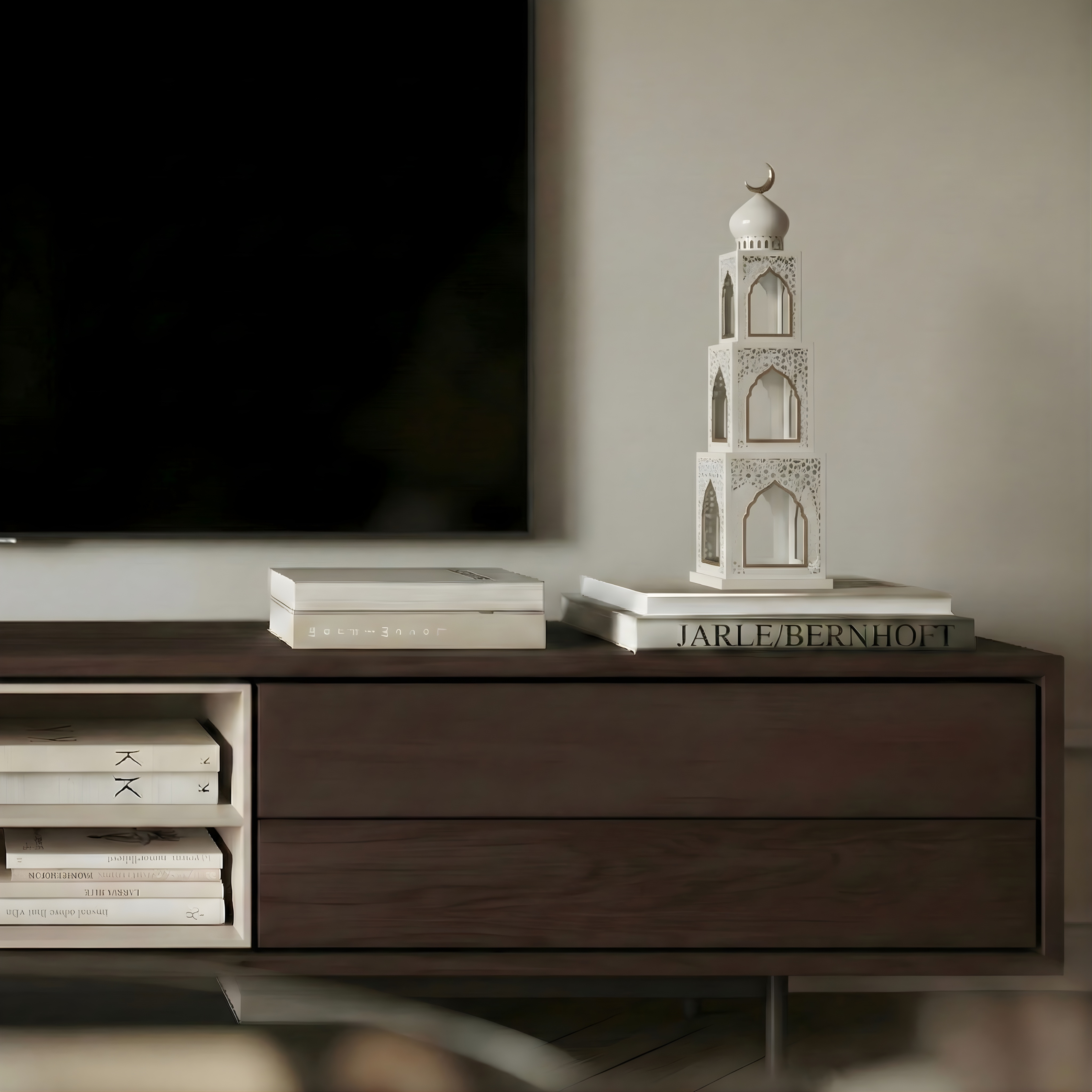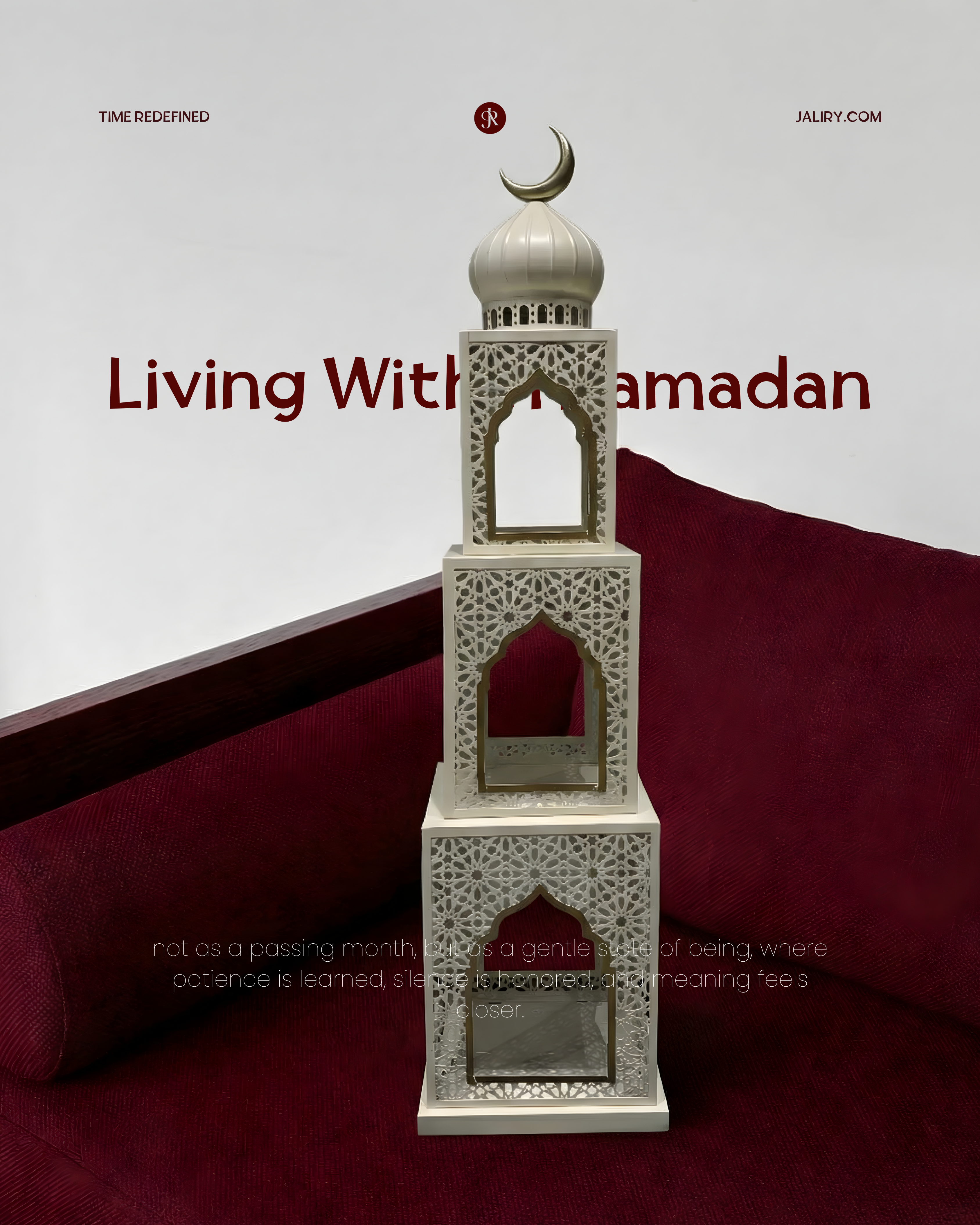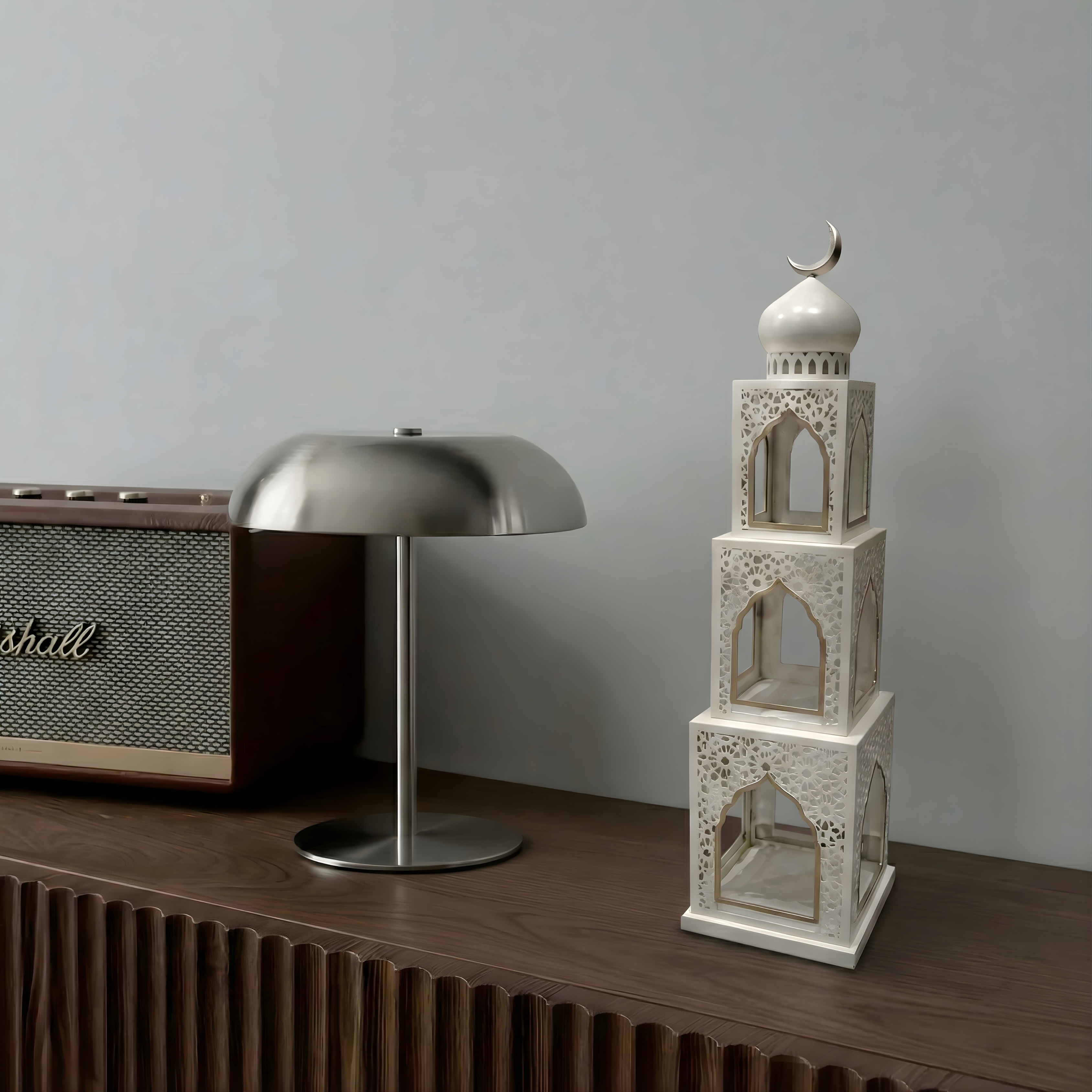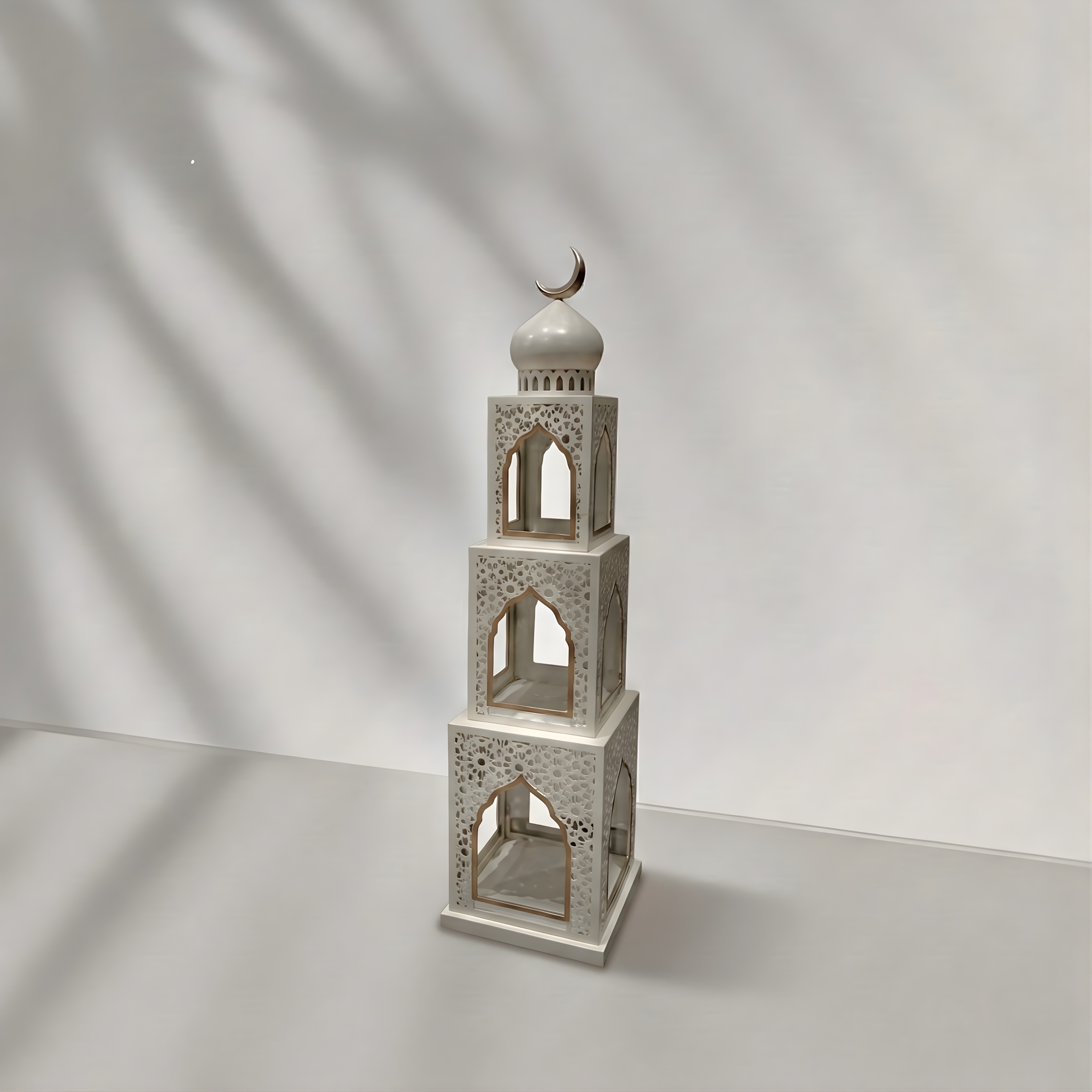 Inspired by vertical architectural structures, this lantern is composed of stacked geometric forms that create a strong yet refined presence. Each level features arched openings and delicate cut-out patterns, allowing the design to feel both structured and light. The crescent detail at the top completes the silhouette with a subtle, symbolic finish.