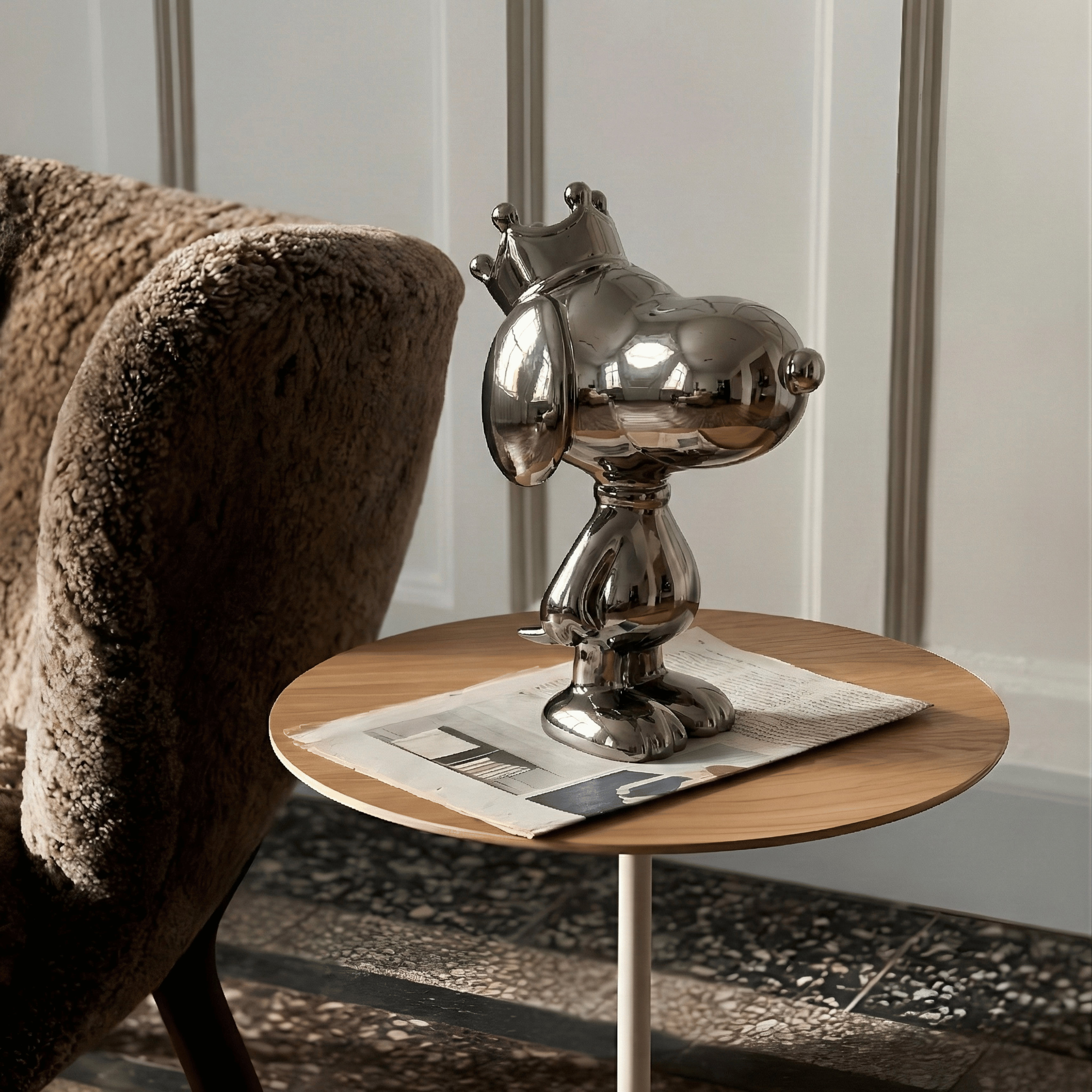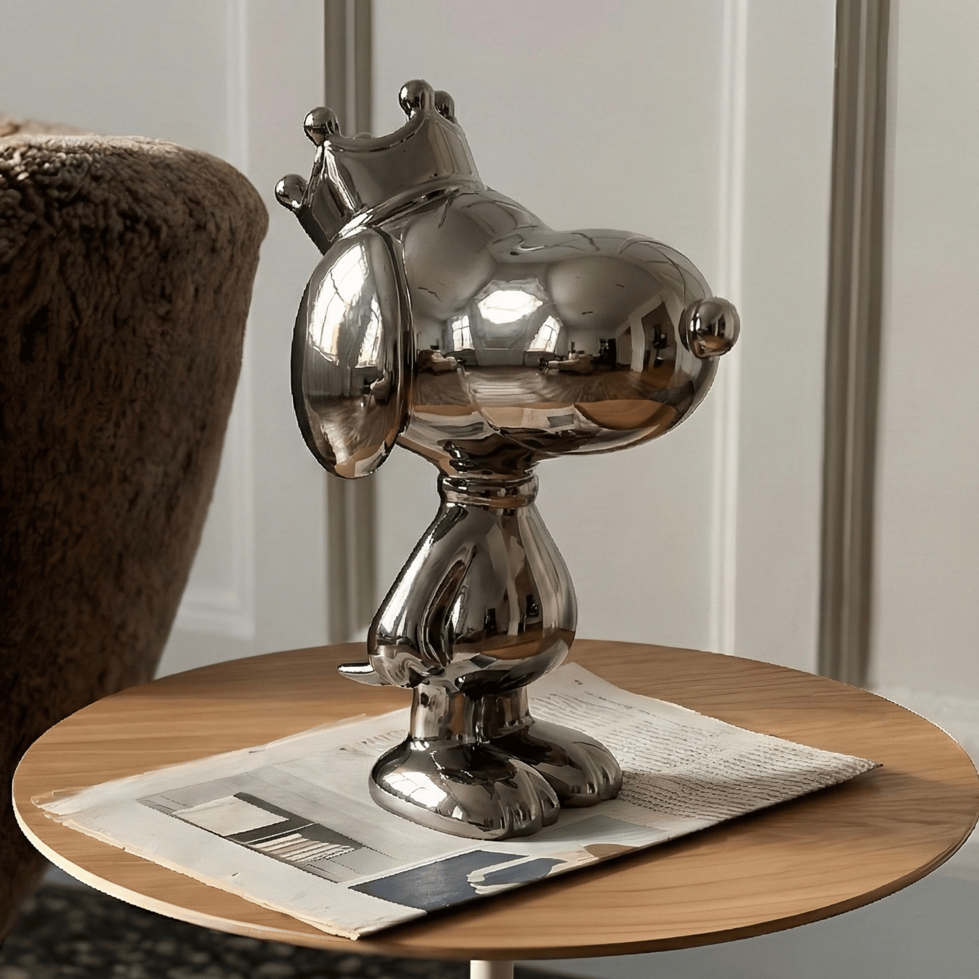 A contemporary reinterpretation of a classic cartoon silhouette, elevated with a royal crown detail. The sculptural form is smooth, rounded, and exaggerated in proportion, giving it a playful yet luxurious presence. The mirror-polished metallic finish transforms the familiar shape into a modern art statement piece β bold, reflective, and visually striking.
