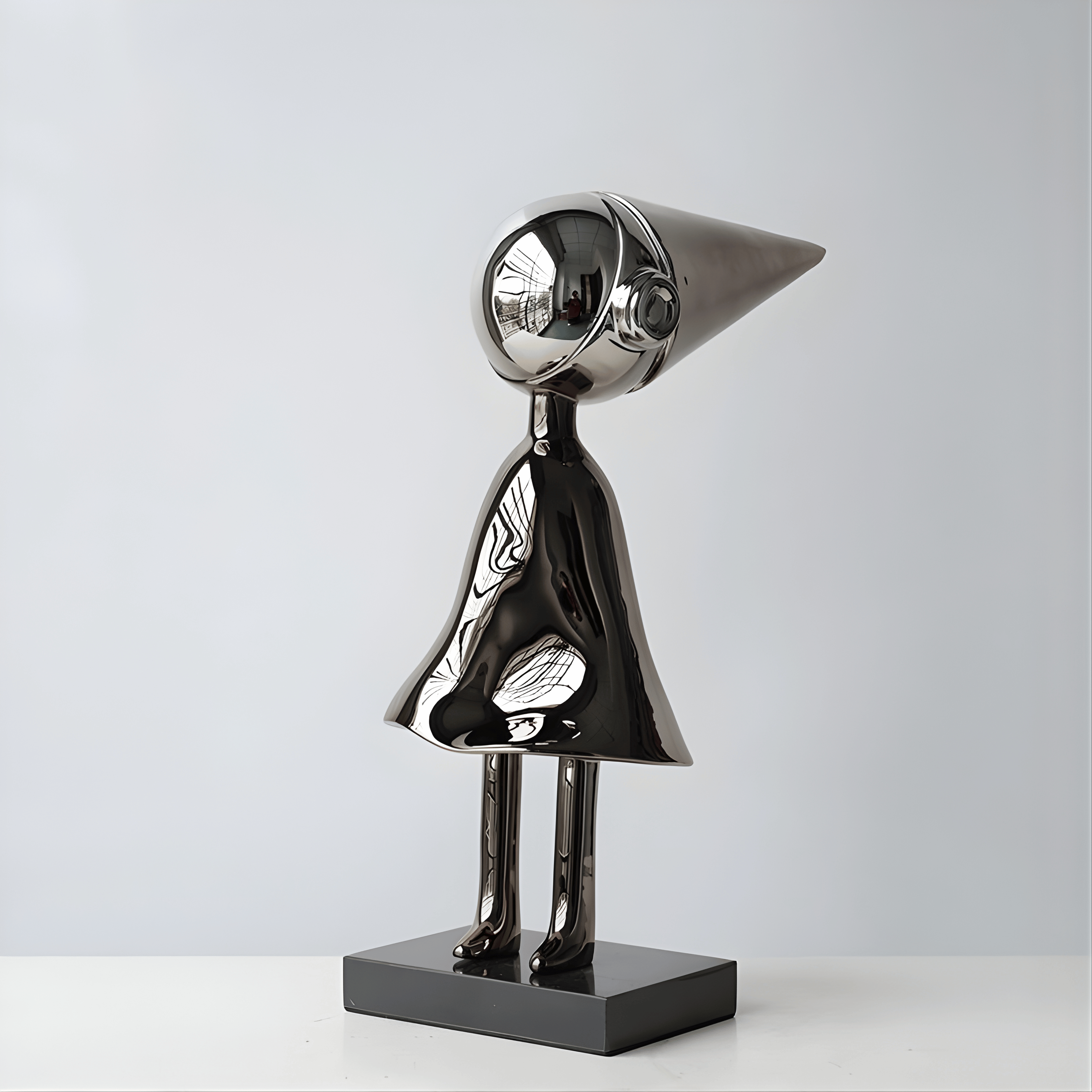 Designed with a clean, simplified humanoid form, this piece blends playful abstraction with contemporary sculpture. The high-gloss chrome finish enhances its reflective sphere-like head, creating dynamic light interaction from every angle. The structured base anchors the fluid body form for visual stability. Its proportions create a deliberate tension between innocence and introspection.