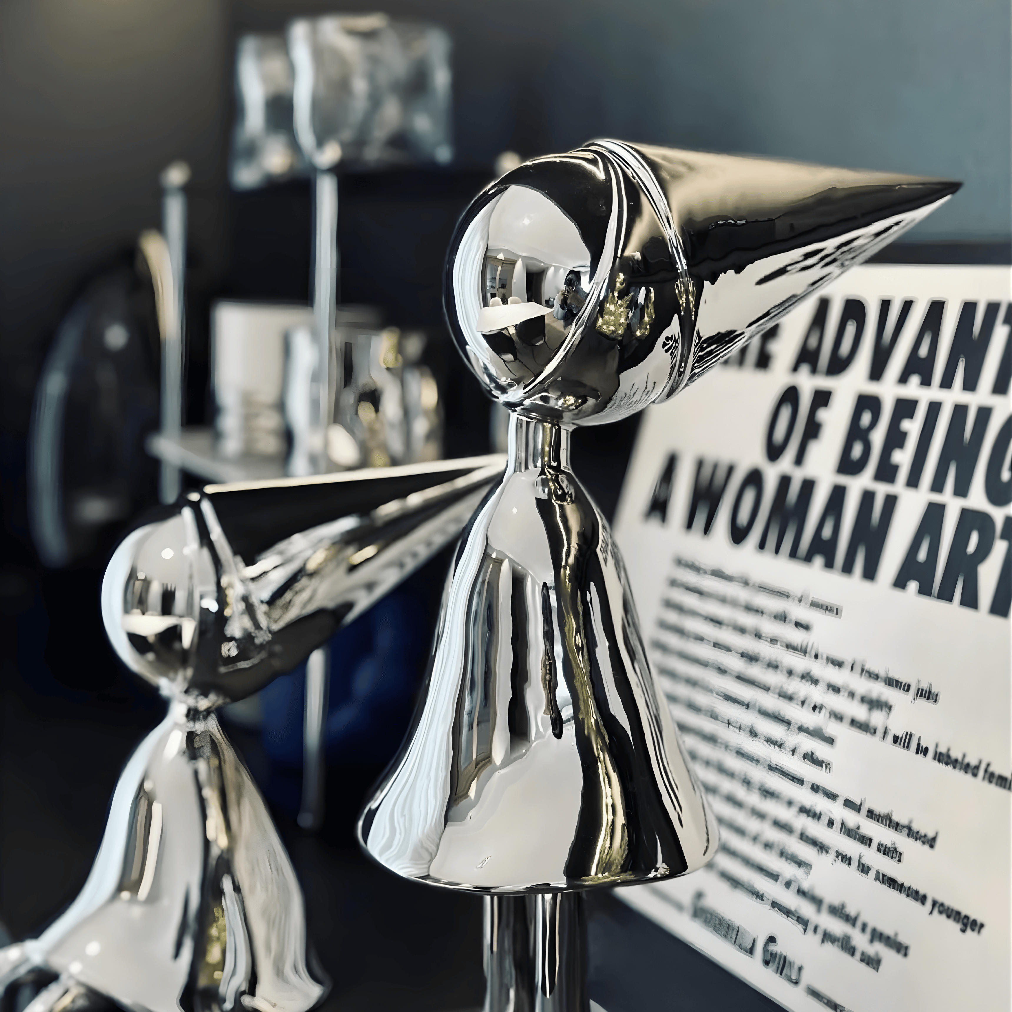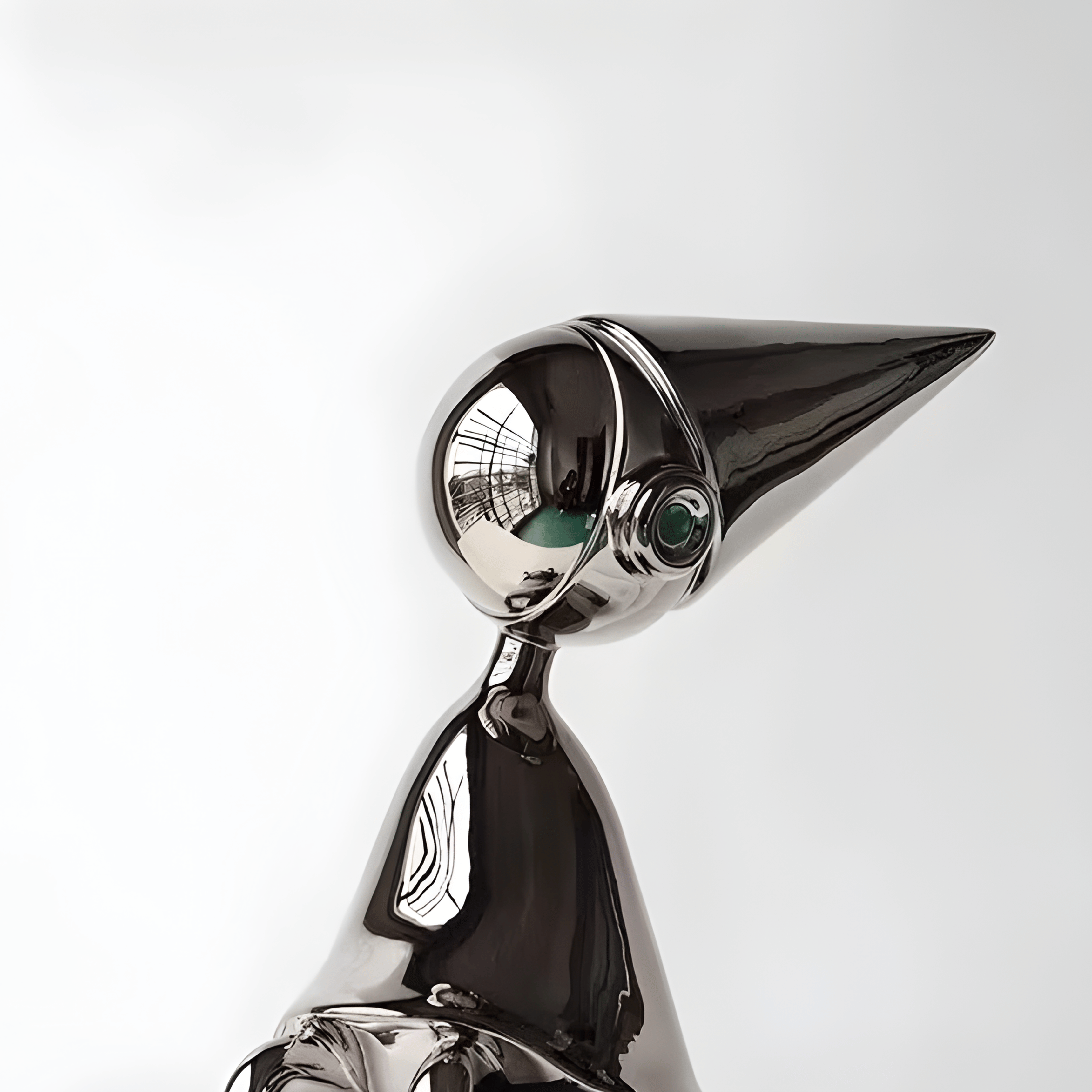 A minimalist figure with an exaggerated gaze — the Silent Observer stands still, yet sees everything. Its mirror-polished chrome head reflects the world around it, turning surroundings into part of the artwork itself. The elongated pointed form suggests curiosity, direction, and quiet awareness. Childlike in silhouette. Philosophical in presence.