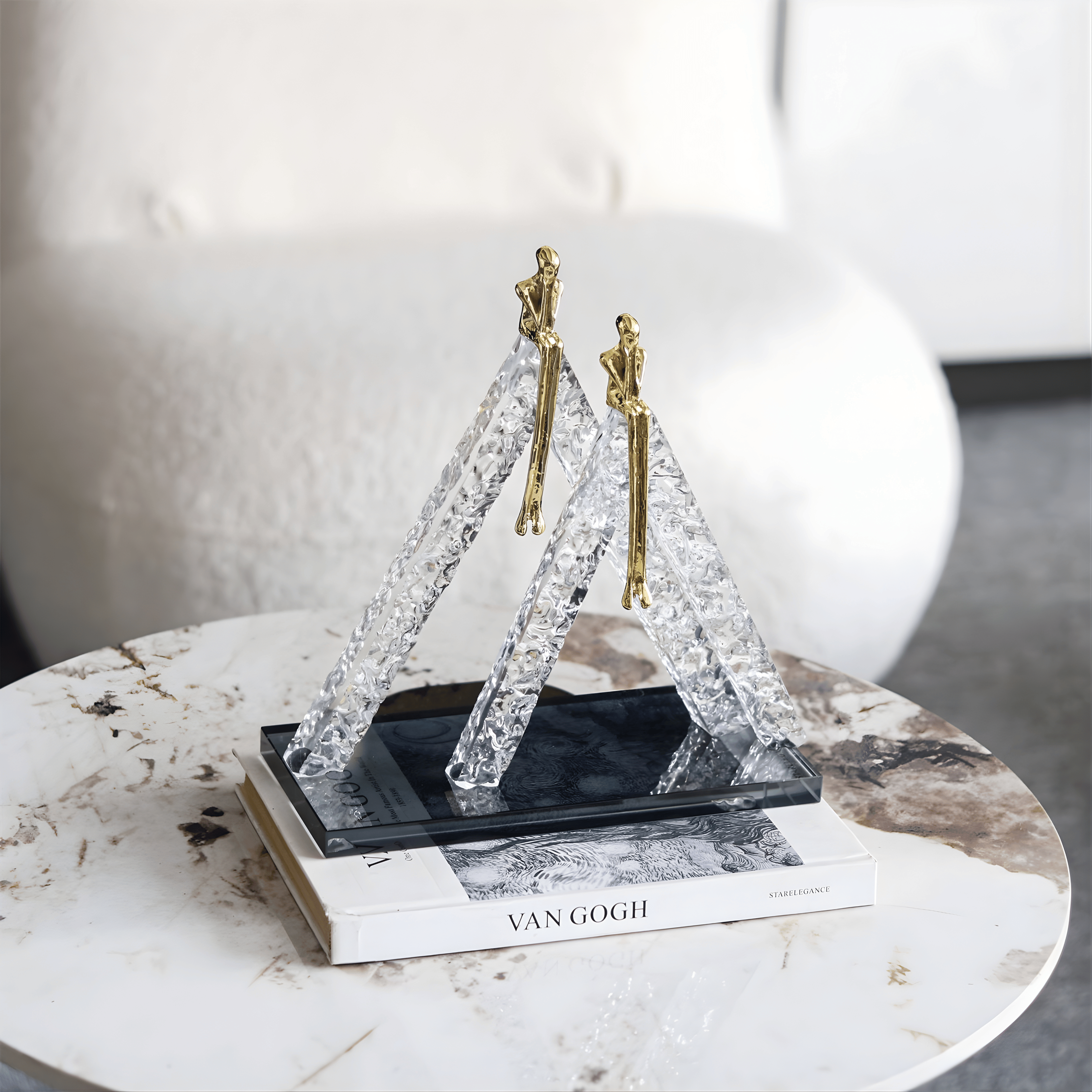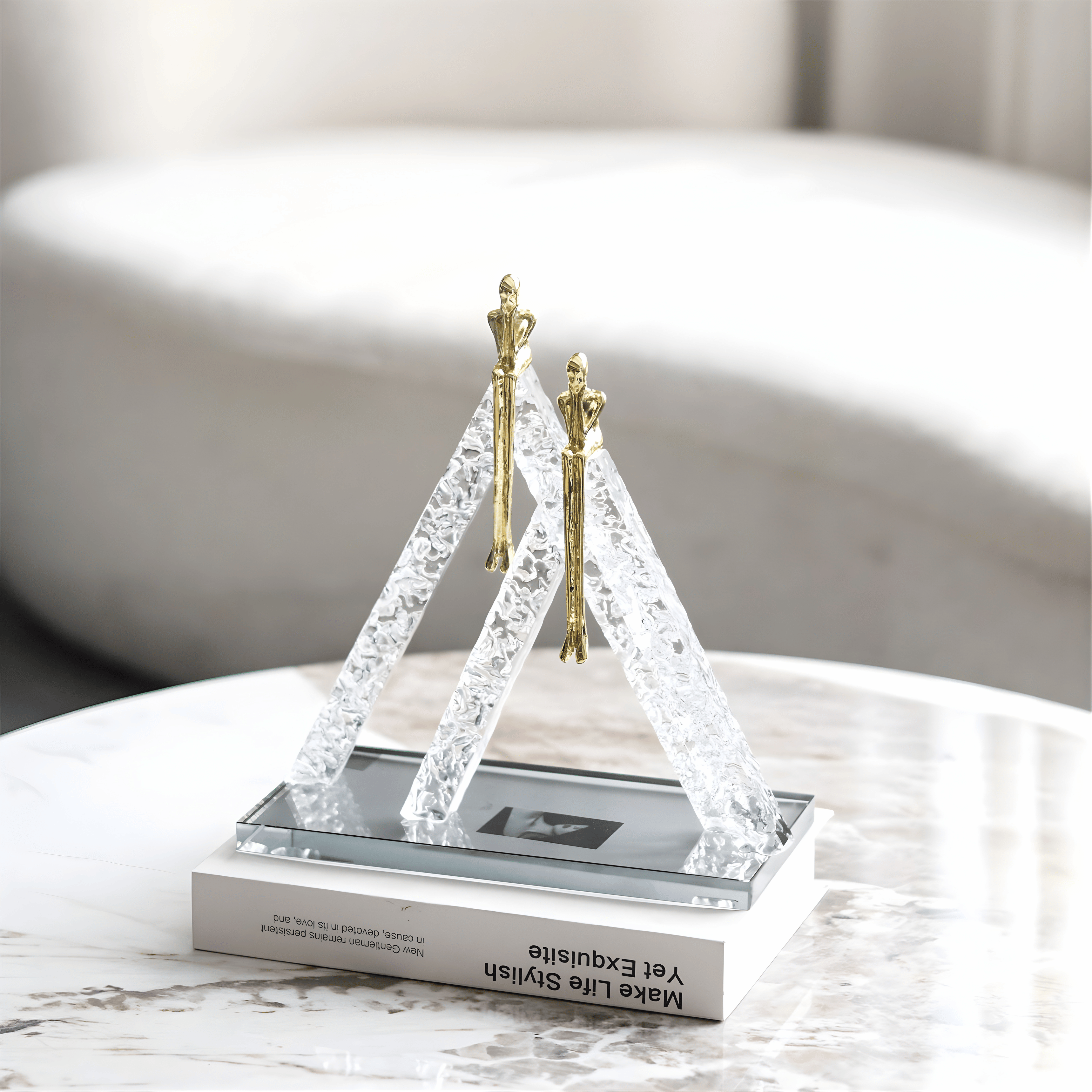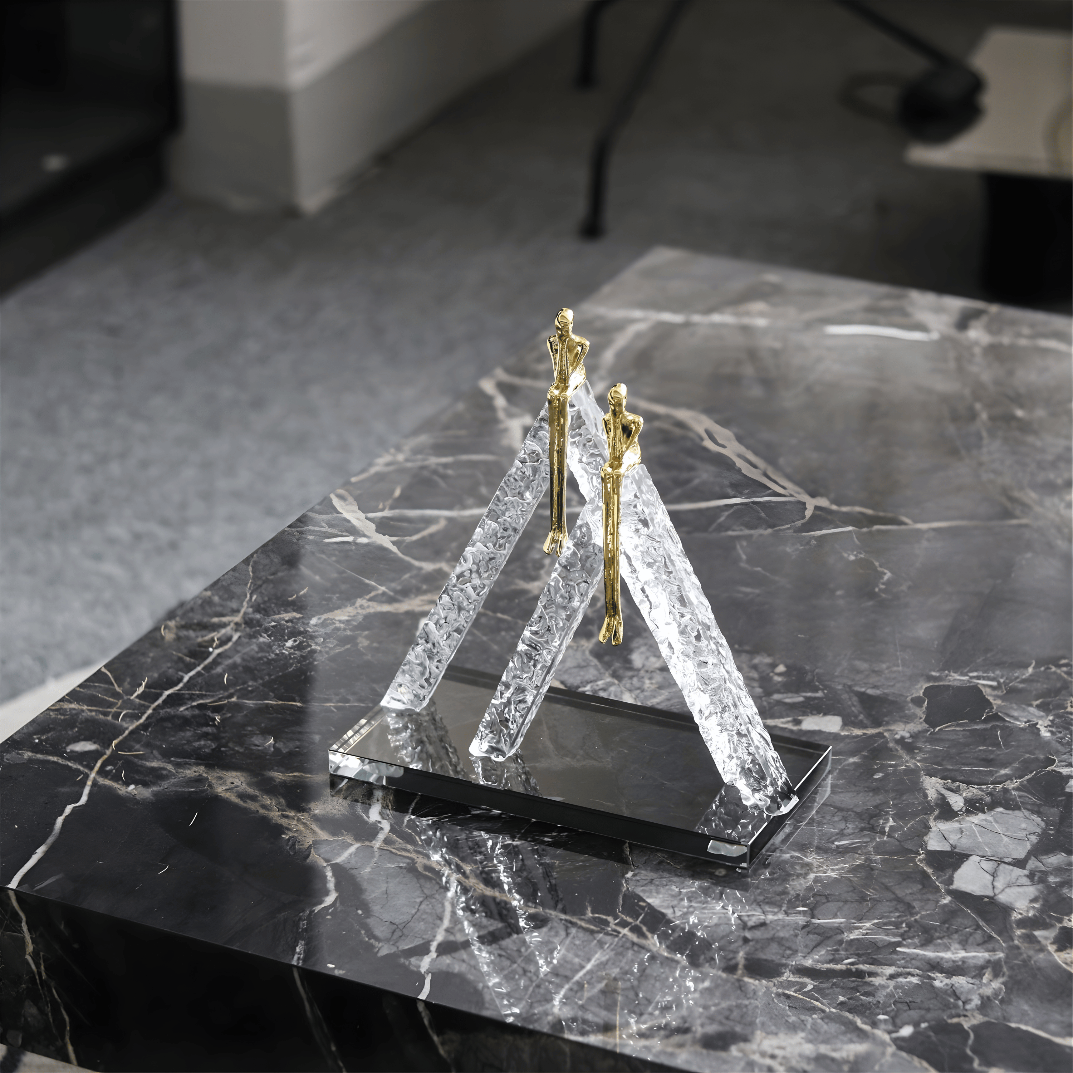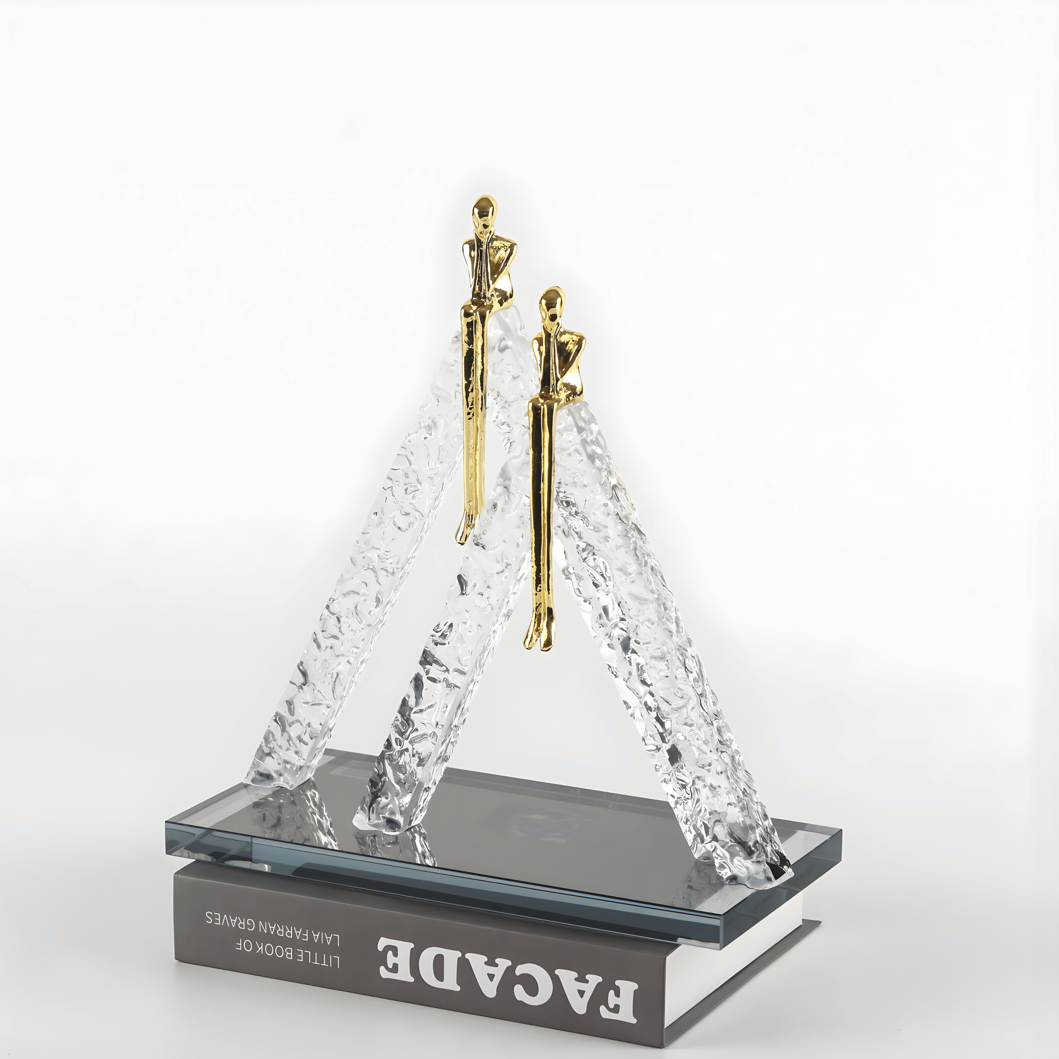 The design combines textured crystal-inspired forms with sleek metallic figures to create a balanced artistic composition. The clear sculptural structures mimic mountain peaks, while the polished gold silhouettes introduce elegance and contrast.