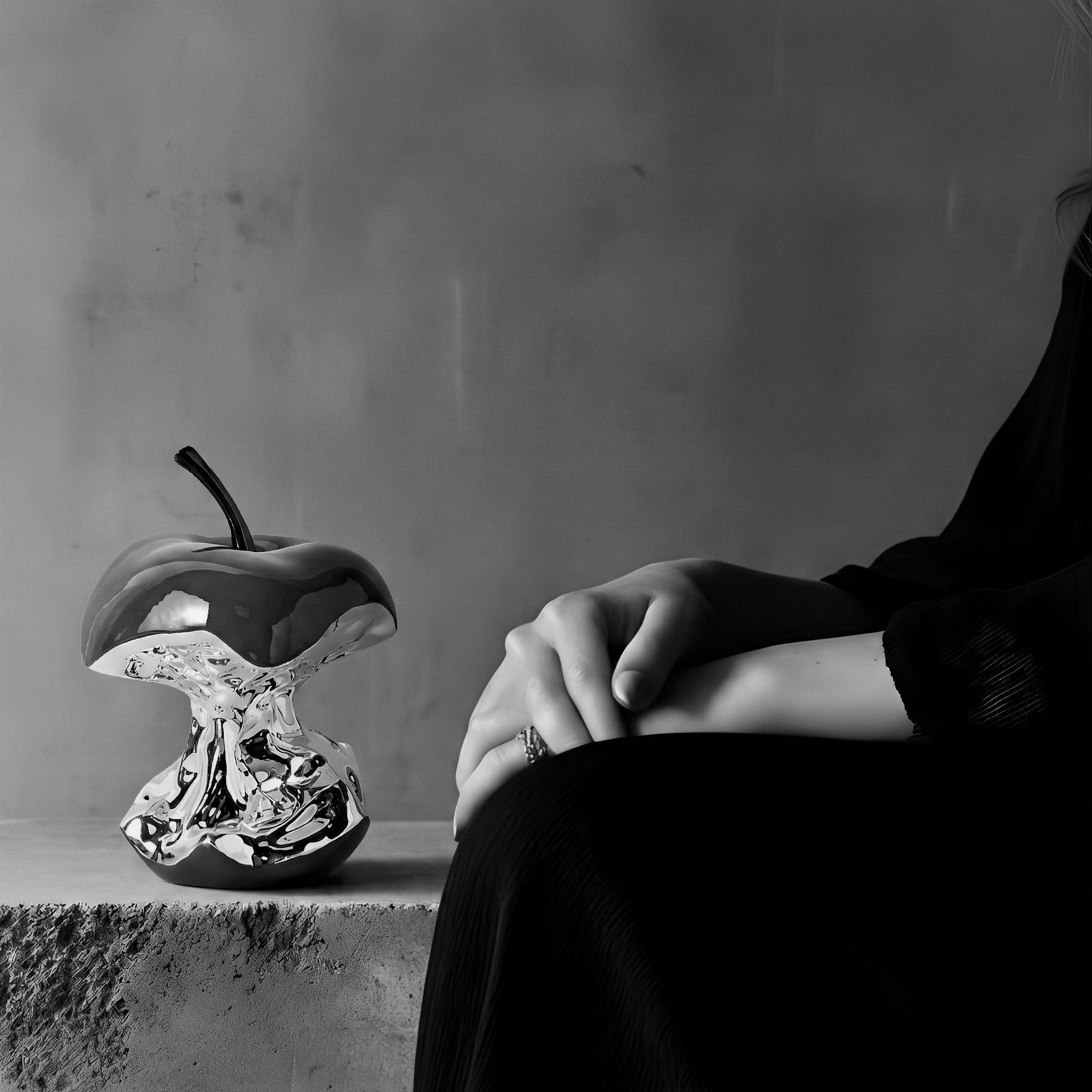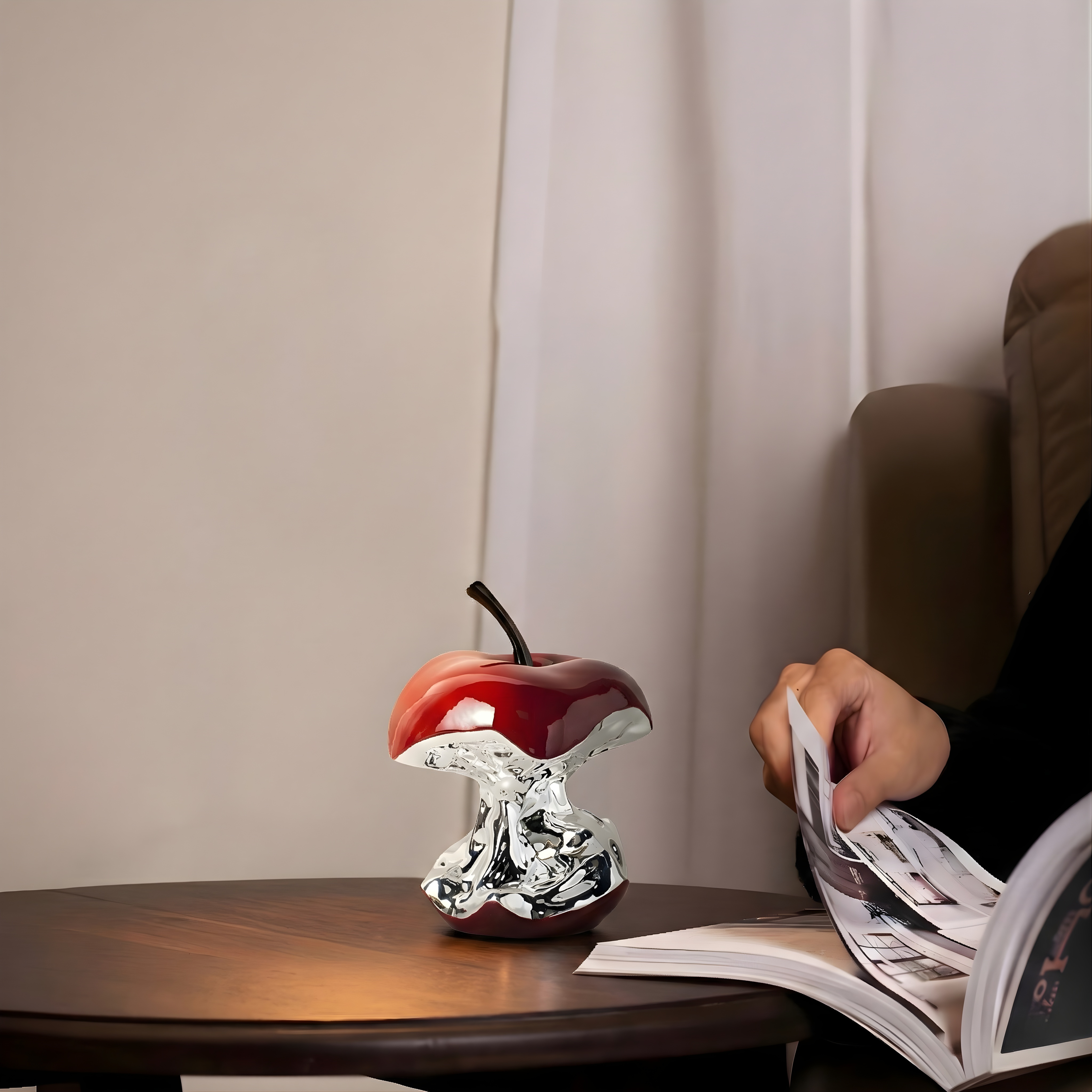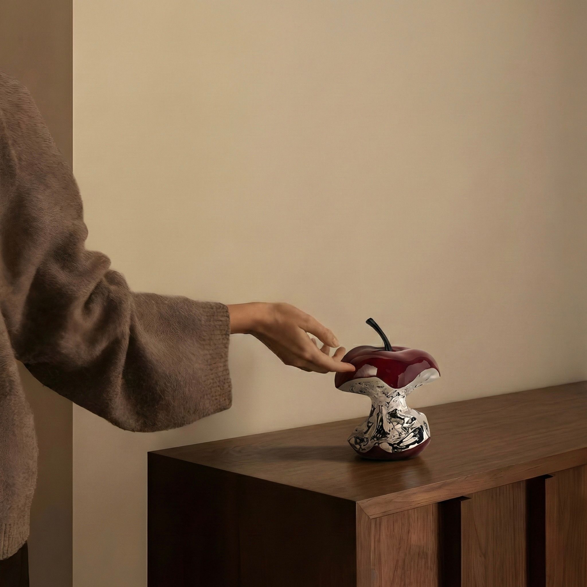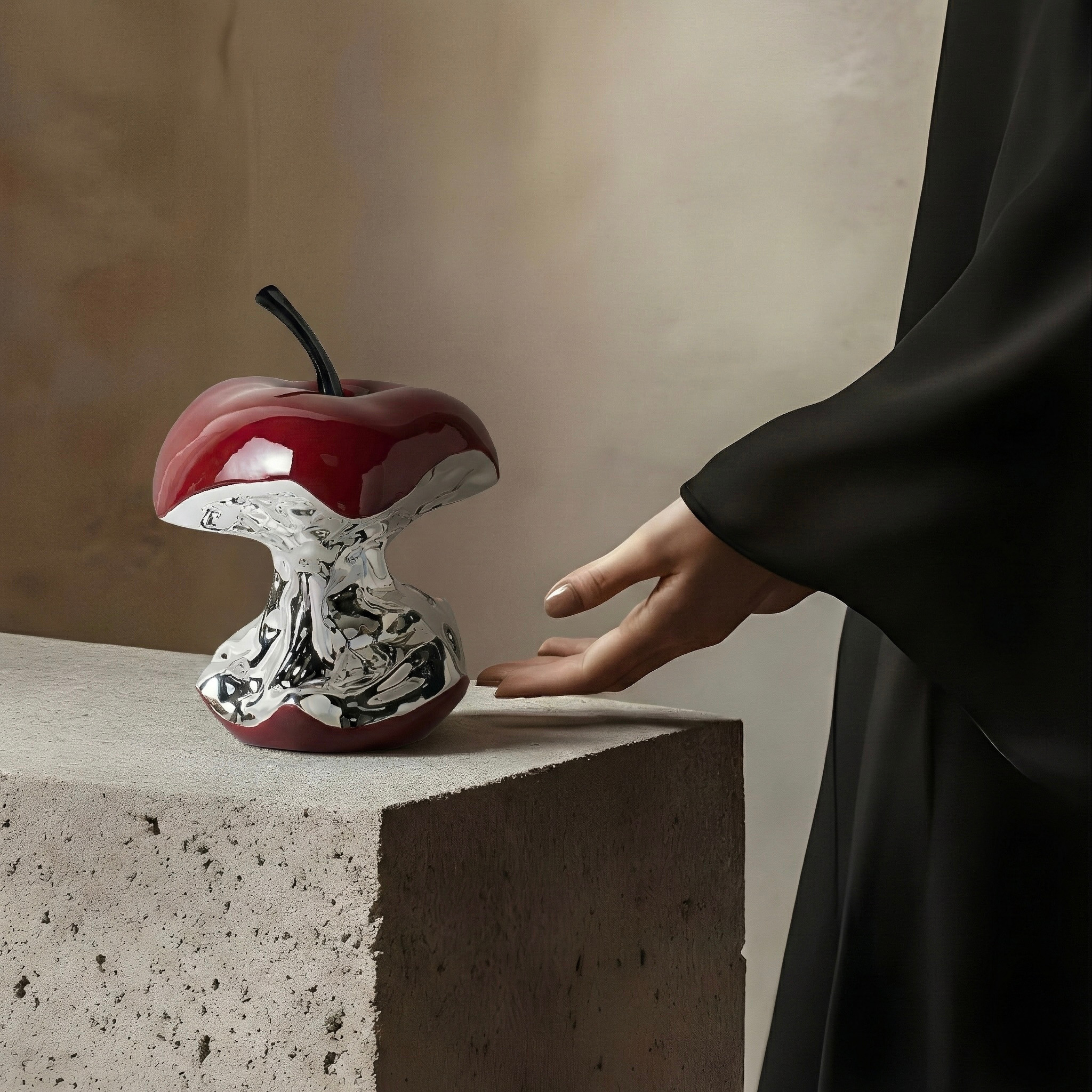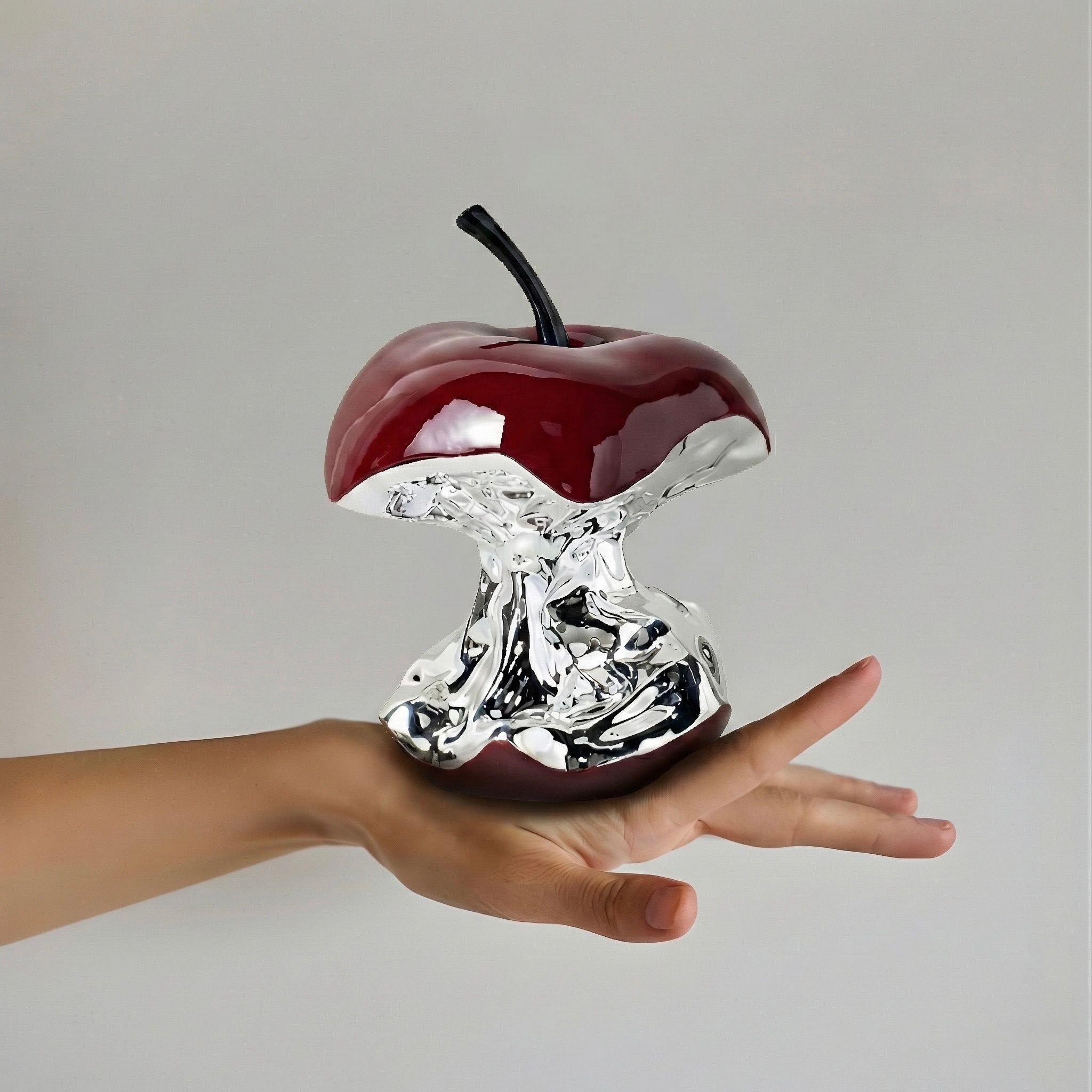 A bold reinterpretation of a familiar form, this sculptural apple blends glossy crimson curves with a liquid-chrome core. The contrast between the smooth enamel finish and the mirrored metallic texture creates depth, movement, and a striking contemporary presence.