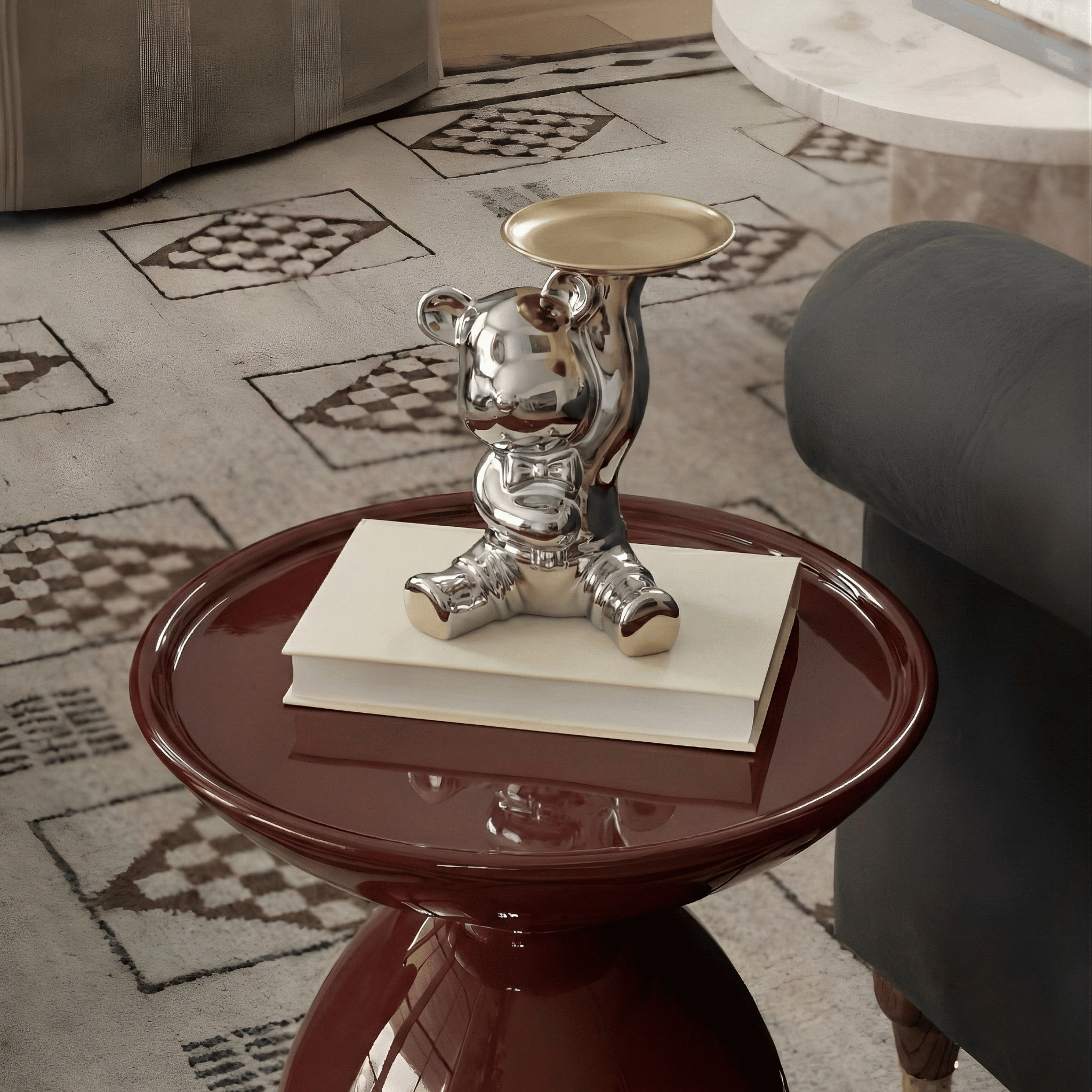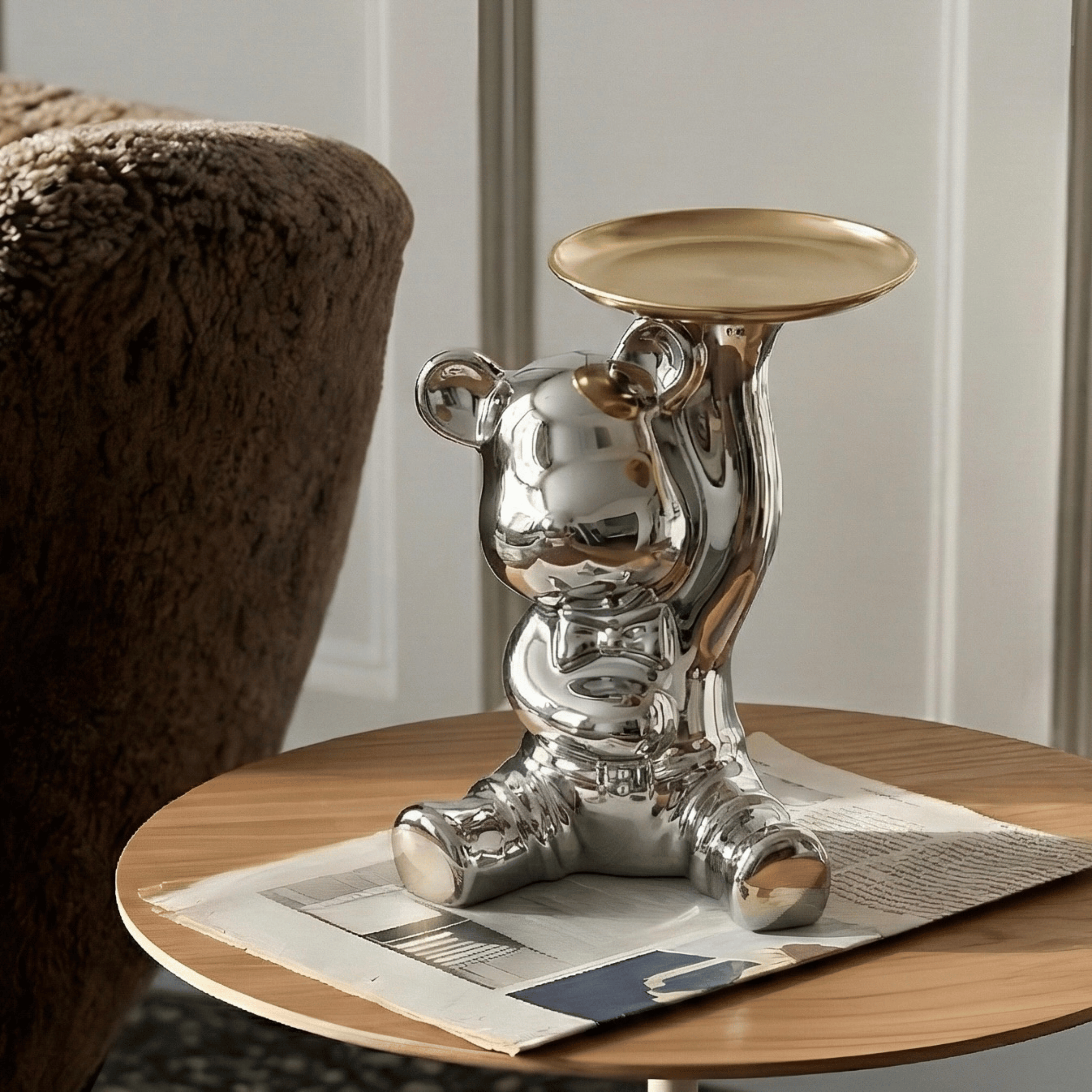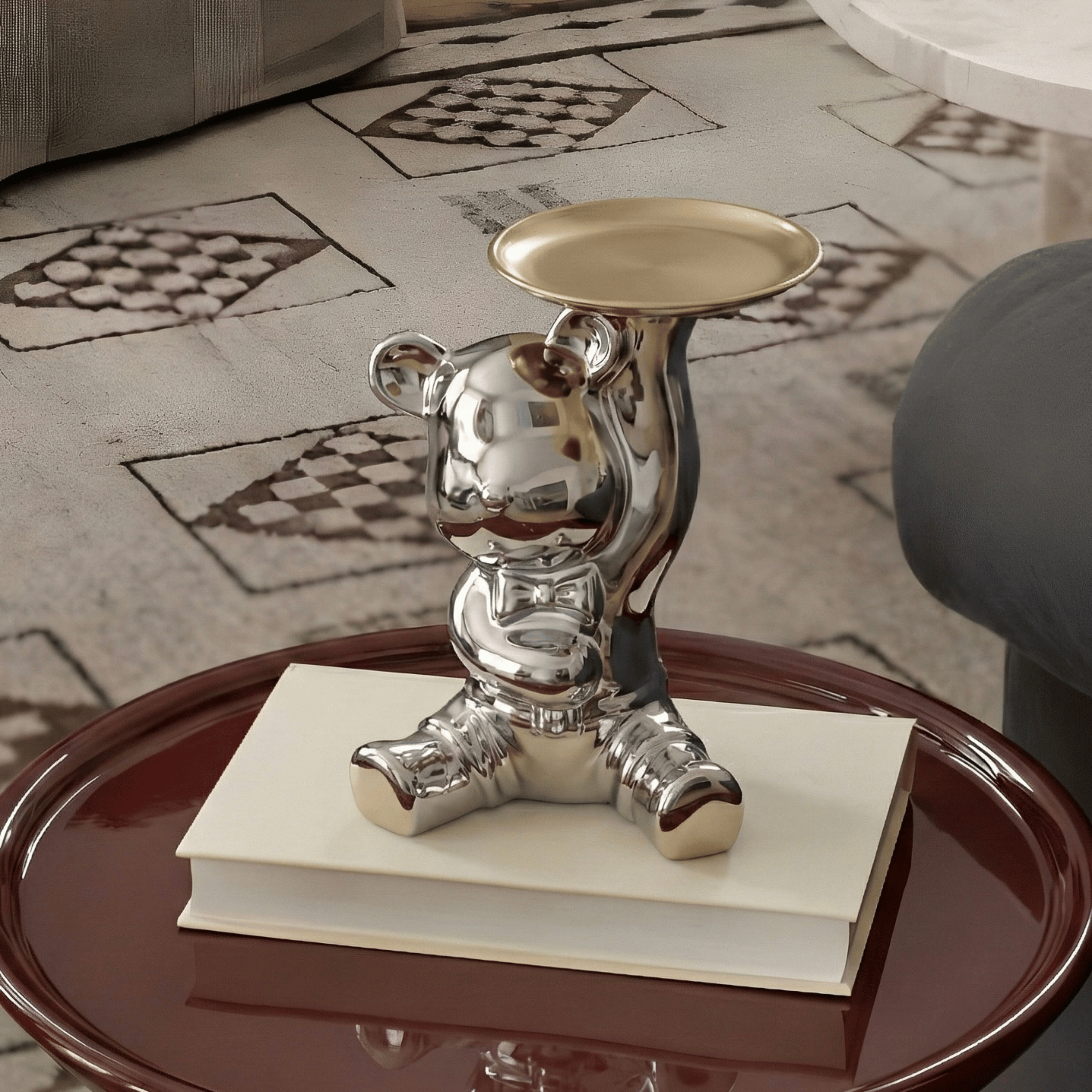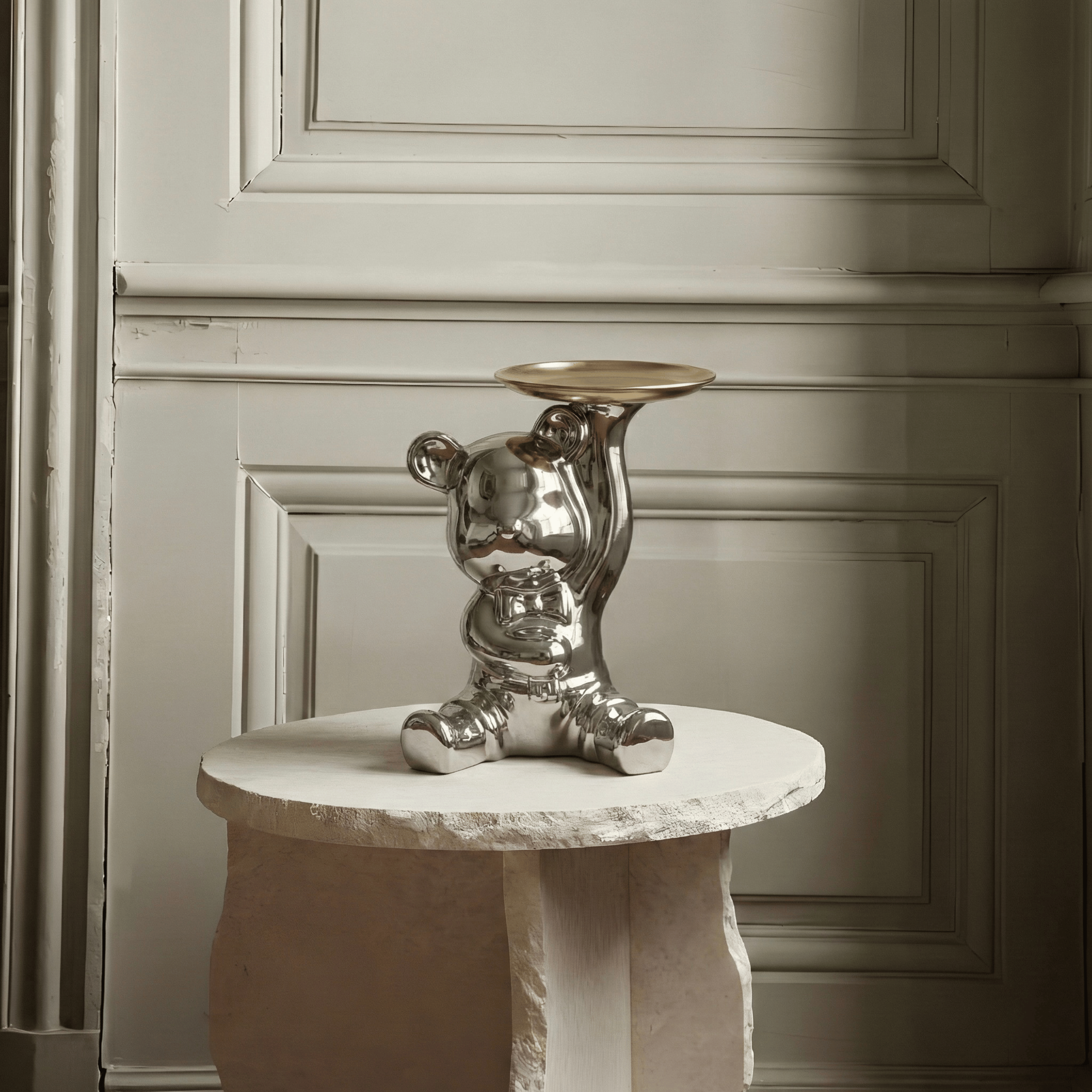 This golden bear tray sculpture blends playful charm with refined luxury. The rounded, minimalist teddy silhouette is elevated by a high-gloss metallic gold finish that reflects light beautifully from every angle. The integrated tray adds both visual balance and practical function, transforming a whimsical character into a sophisticated decorative accent. Its smooth curves and polished surface create a statement piece that feels both modern and collectible.