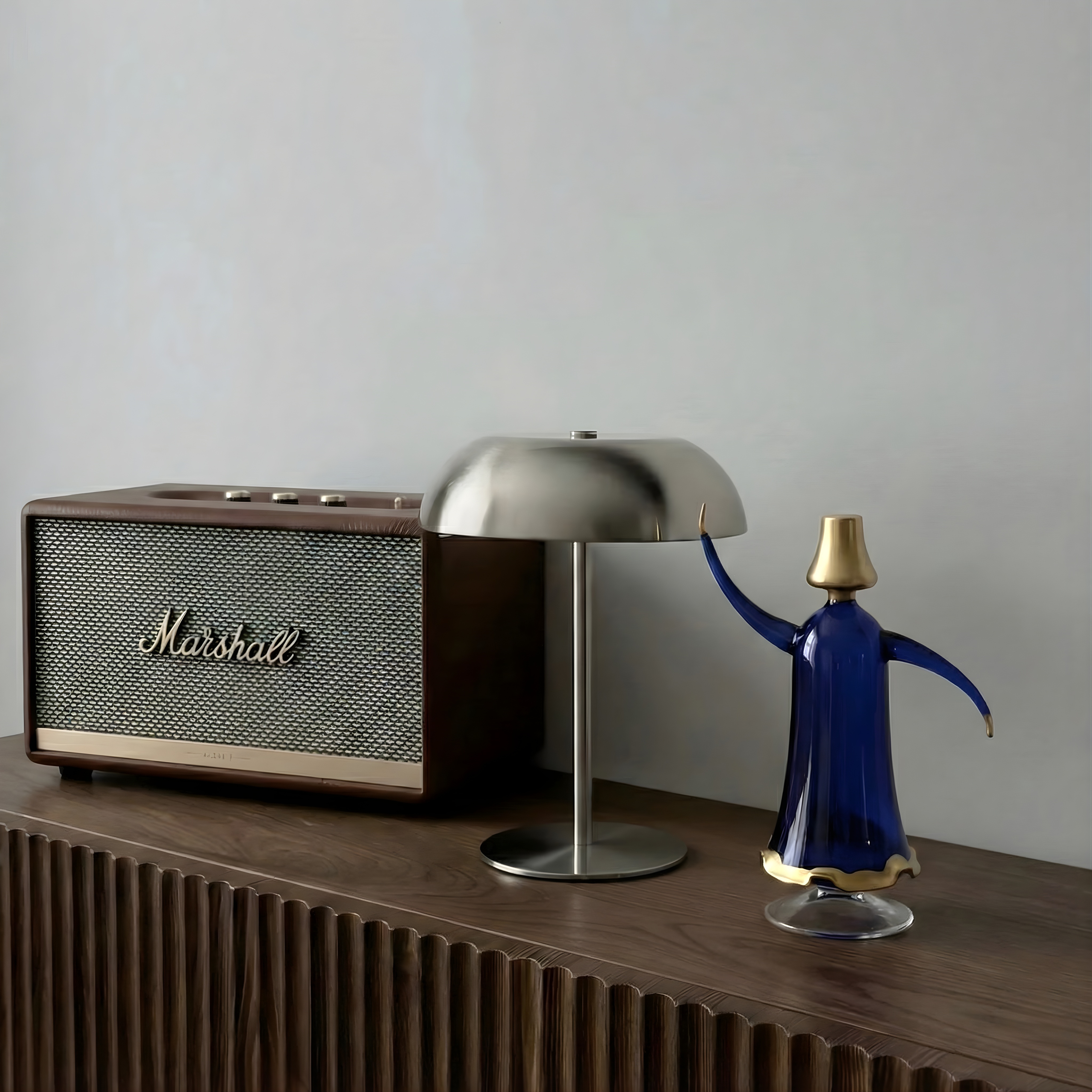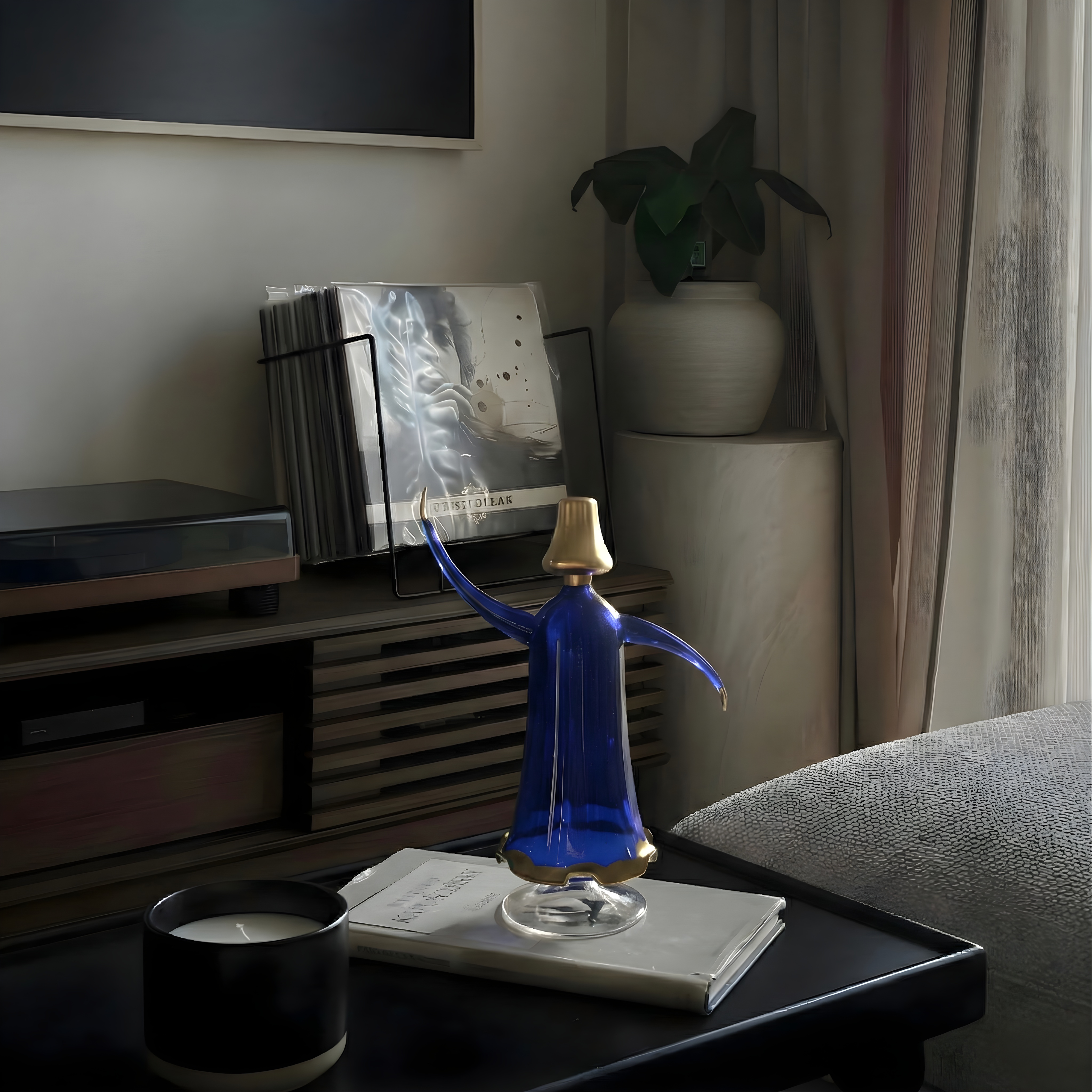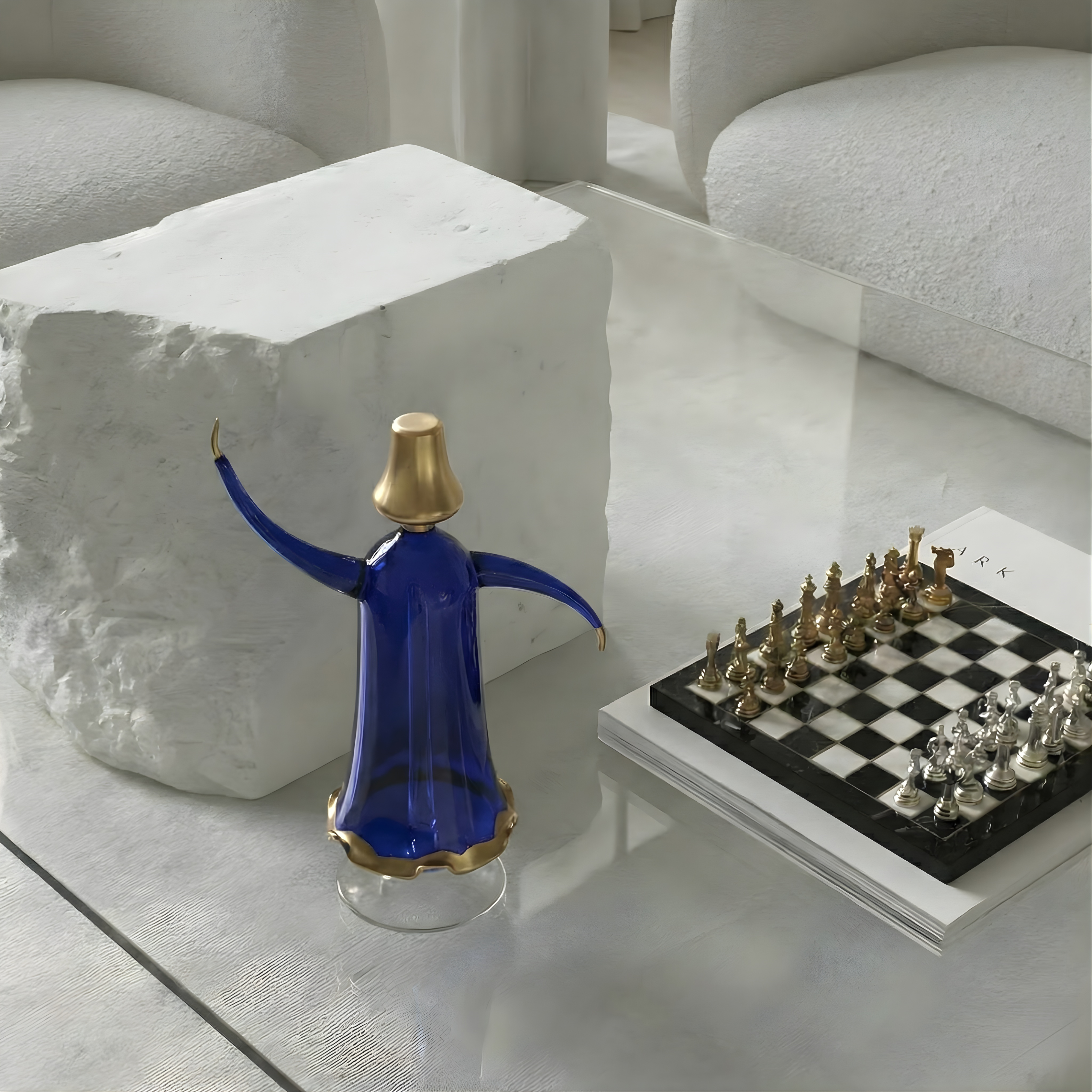 Designed as sculptural decorative figures, these glass Tanoura pieces capture motion through fluid form and balanced proportions. The colored glass bodies add depth and light interaction, while the extended arms create a sense of rotation and visual rhythm. Finished with subtle metallic accents, each piece functions as a refined object that brings character without visual noise.