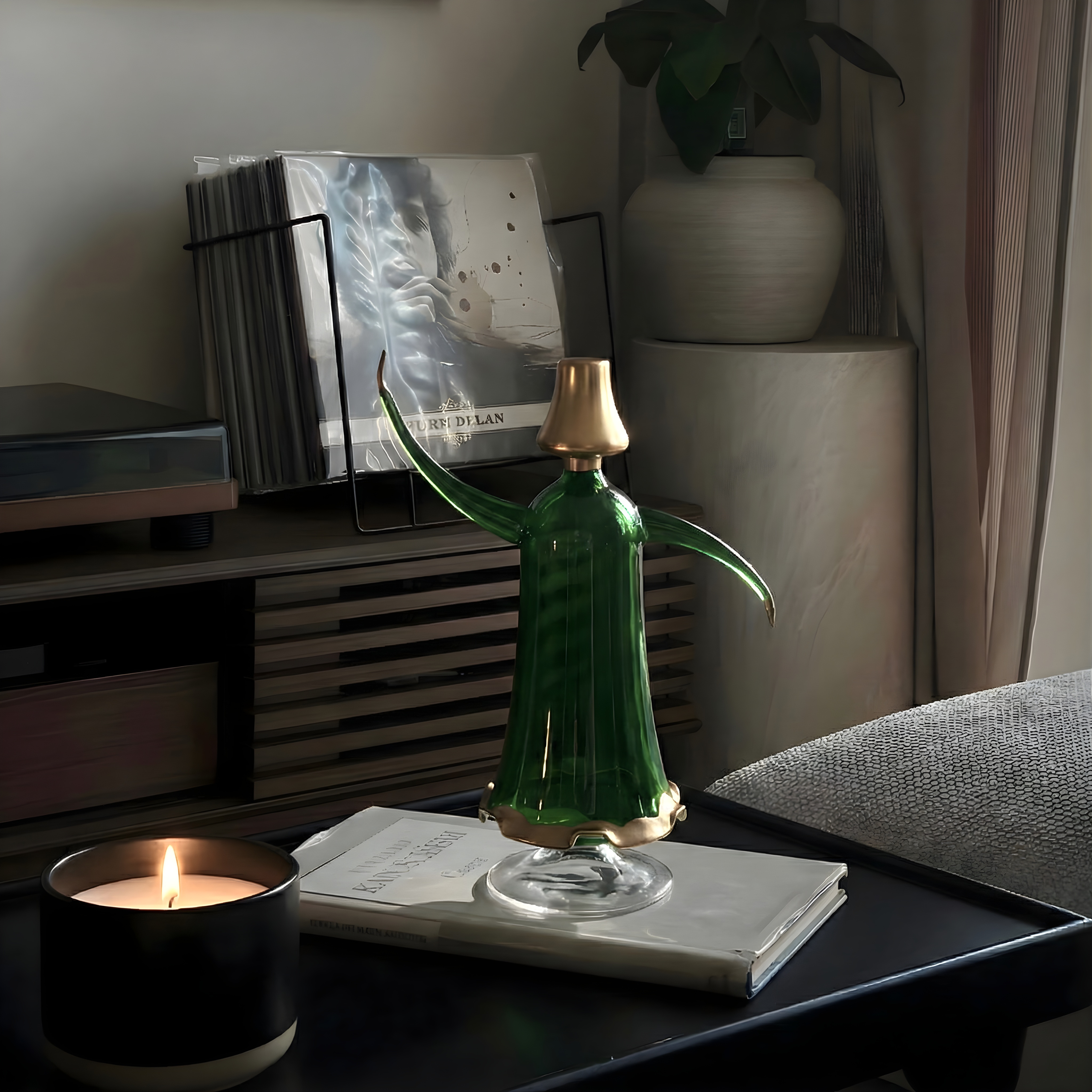 Designed as sculptural decorative figures, these glass Tanoura pieces capture motion through fluid form and balanced proportions. The colored glass bodies add depth and light interaction, while the extended arms create a sense of rotation and visual rhythm. Finished with subtle metallic accents, each piece functions as a refined object that brings character without visual noise.