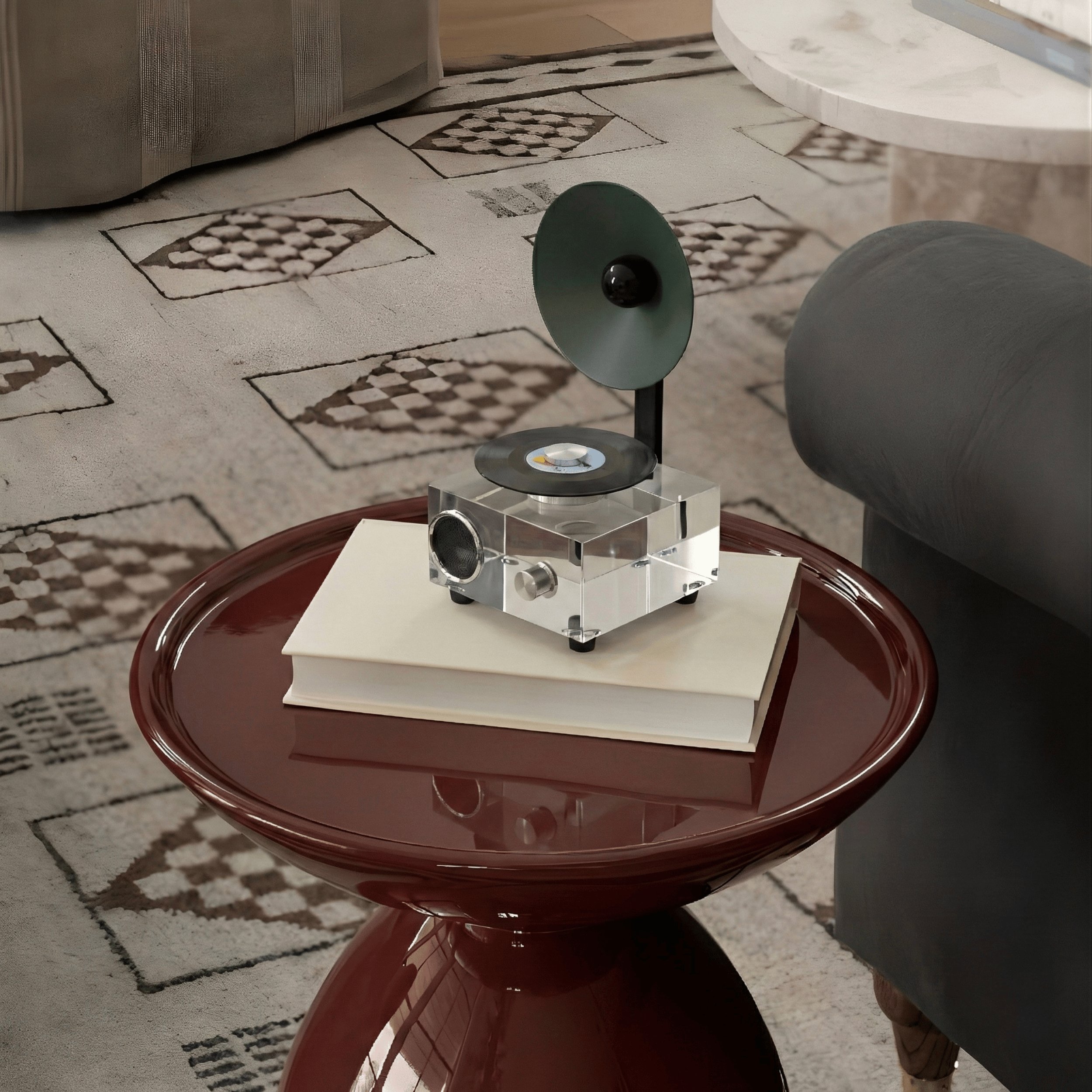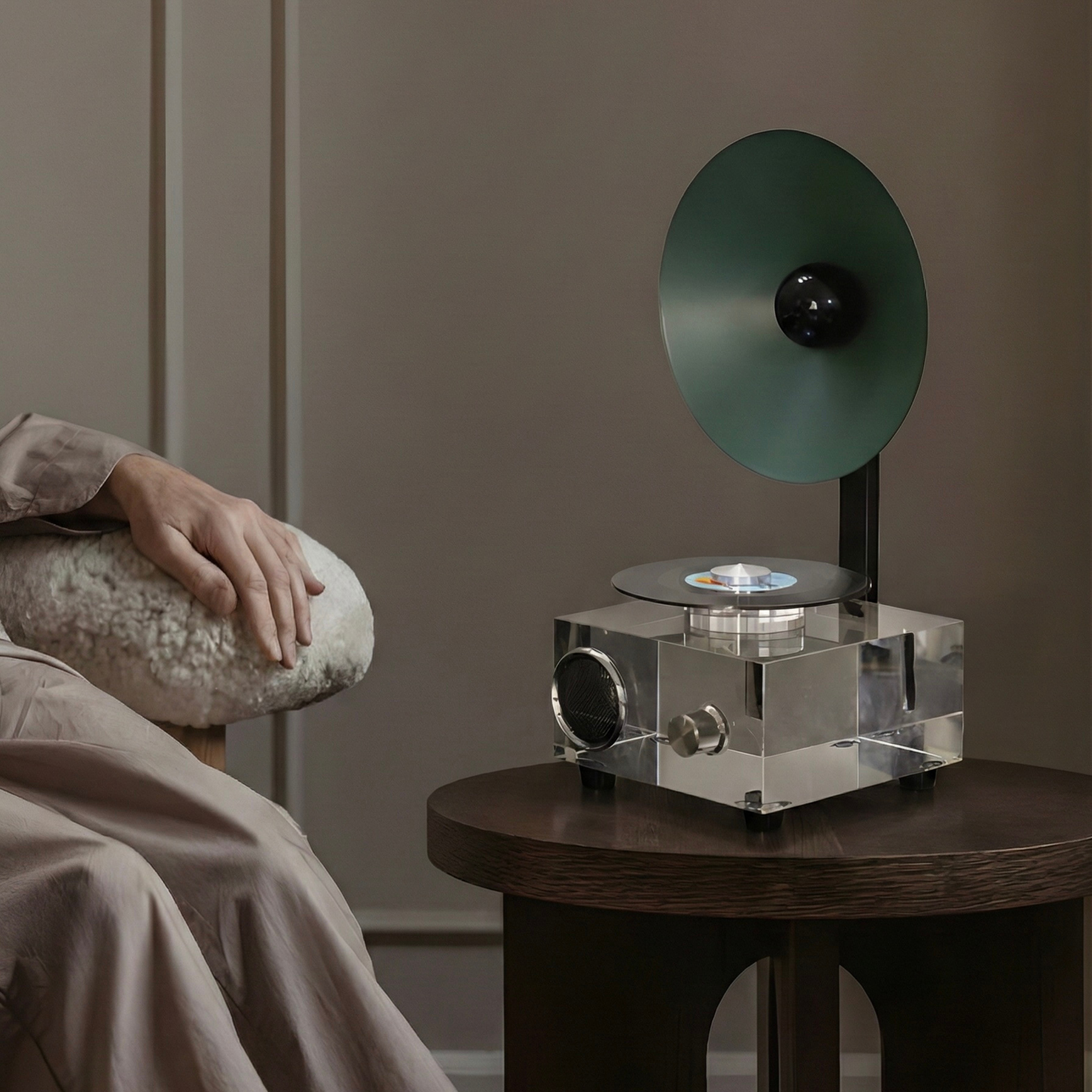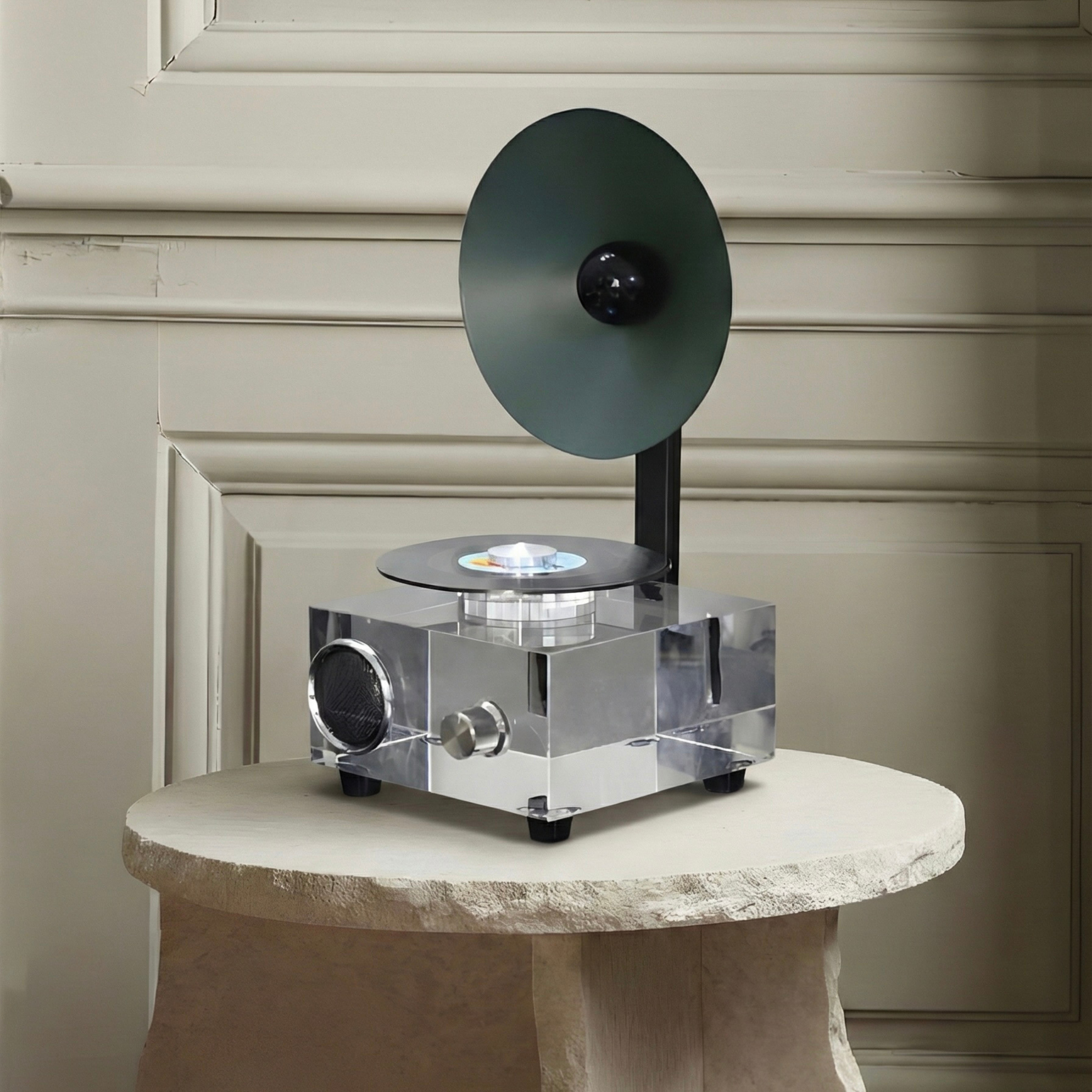 A sculptural reinterpretation of the classic vinyl player, blending nostalgia with contemporary minimalism. The transparent acrylic body creates a floating visual effect, while the circular horn detail adds a bold retro accent. A compact yet expressive piece designed to elevate both sound and space.