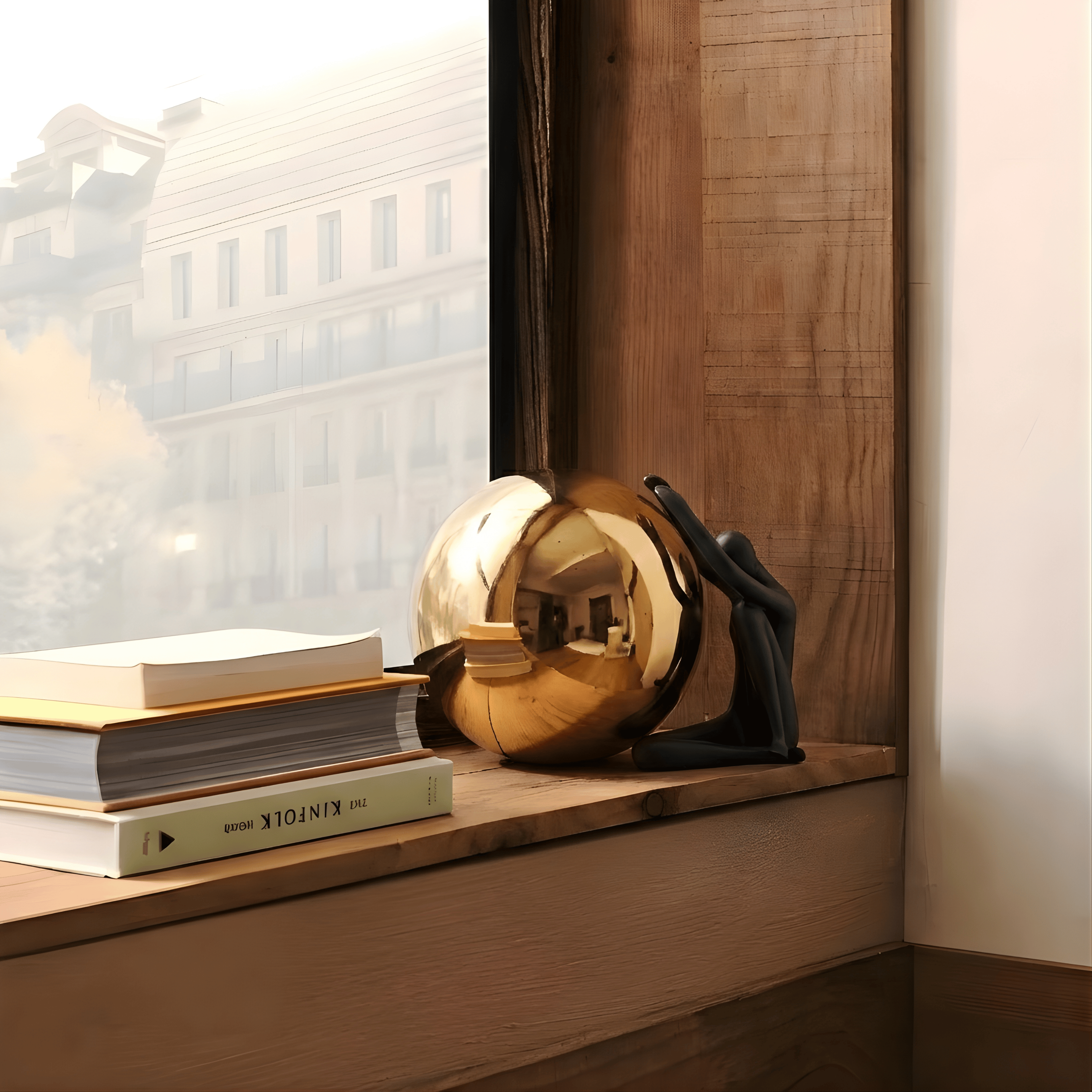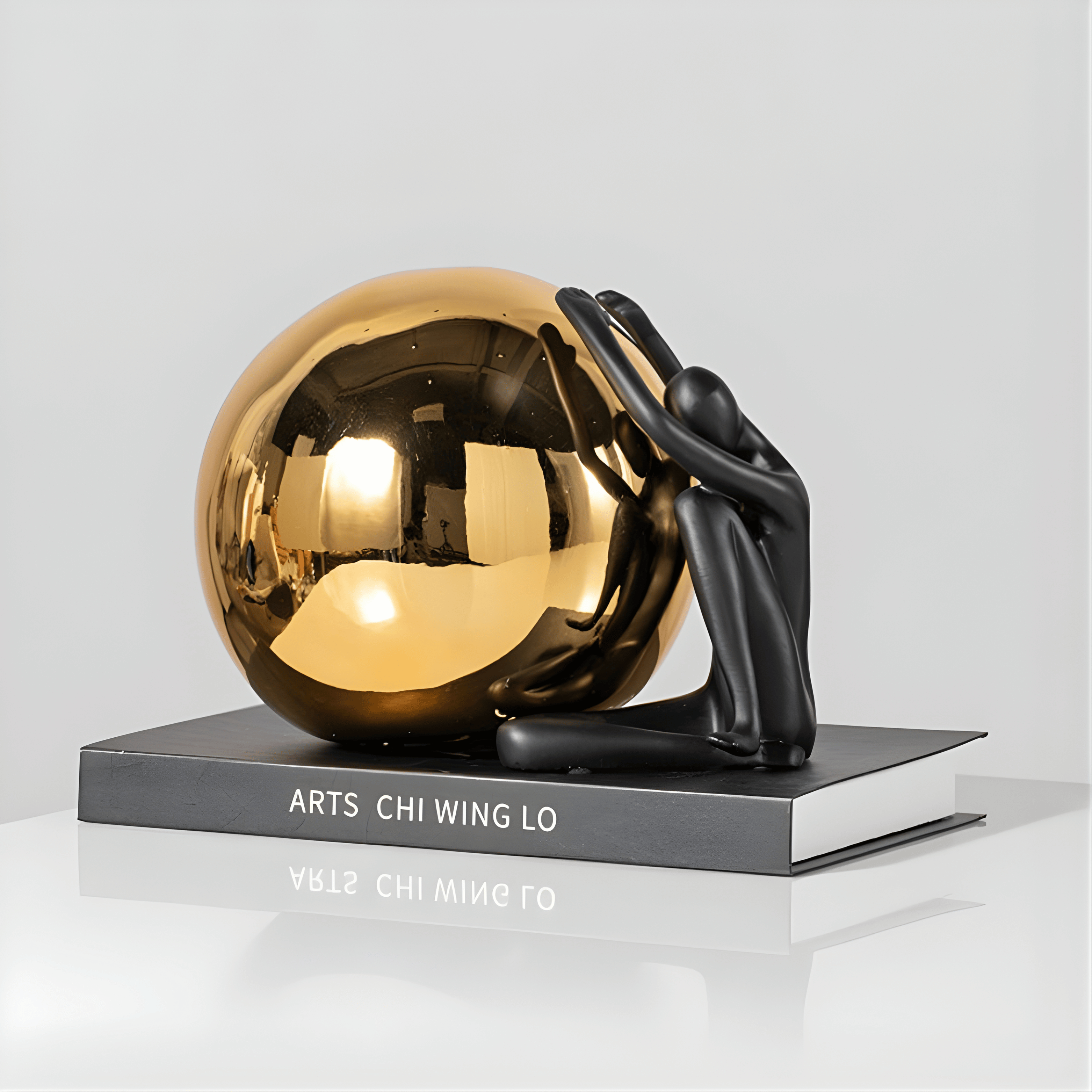 A powerful sculptural dialogue between strength and reflection. The matte black human figure contrasts beautifully with the mirror-polished golden sphere, symbolizing ambition, resilience, and the weight of aspiration. The composition captures a moment of tension and balance, transforming emotion into modern art.