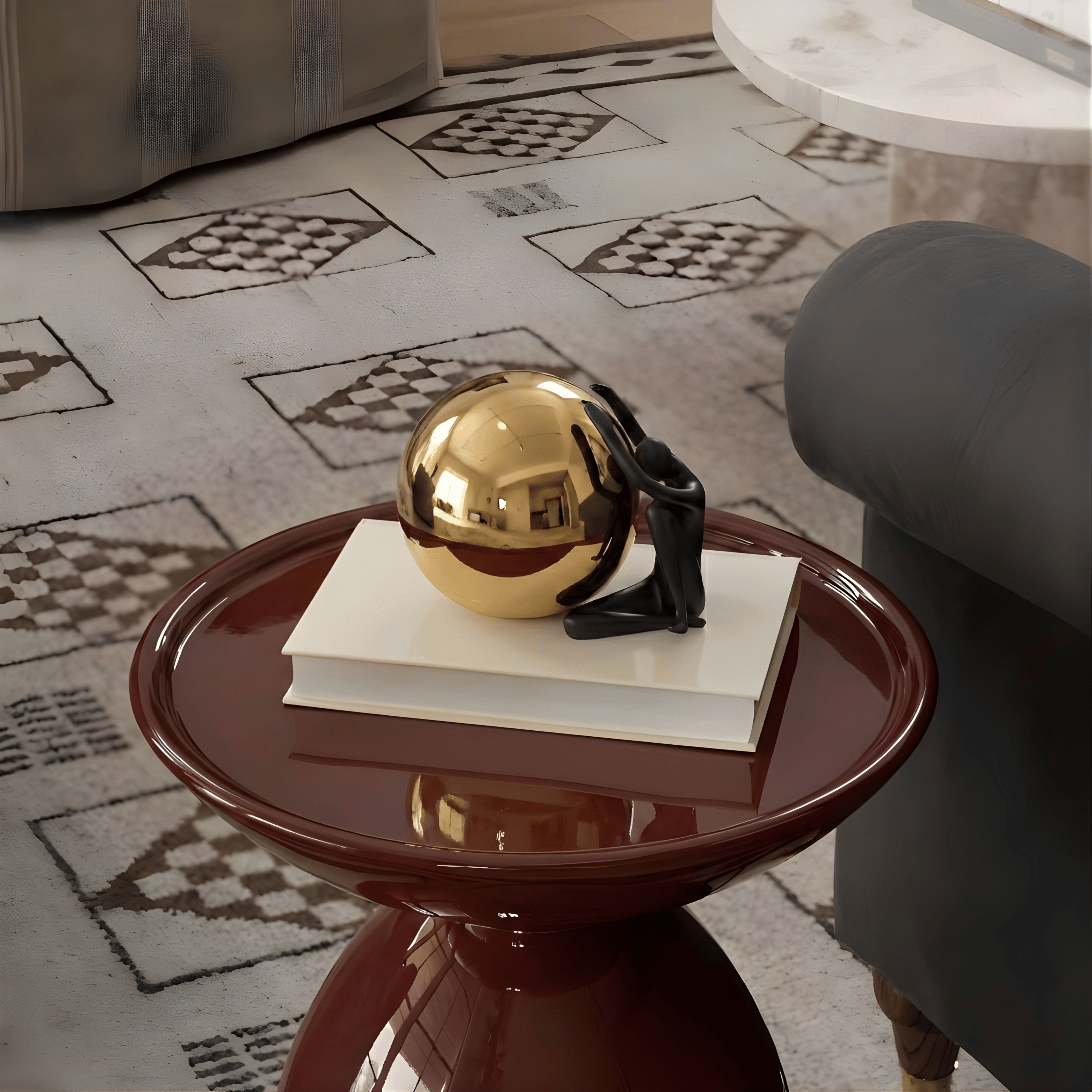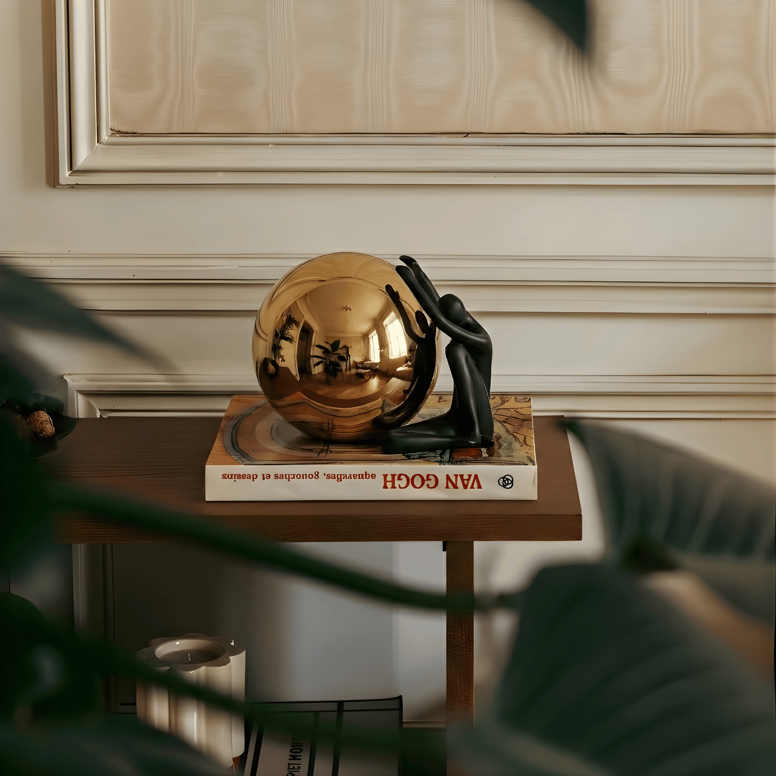 Crafted from high-quality resin with a smooth matte coating, paired with a mirror-finished metallic gold sphere. The materials ensure durability and structural stability, while the polished surface enhances depth, reflection, and visual impact.