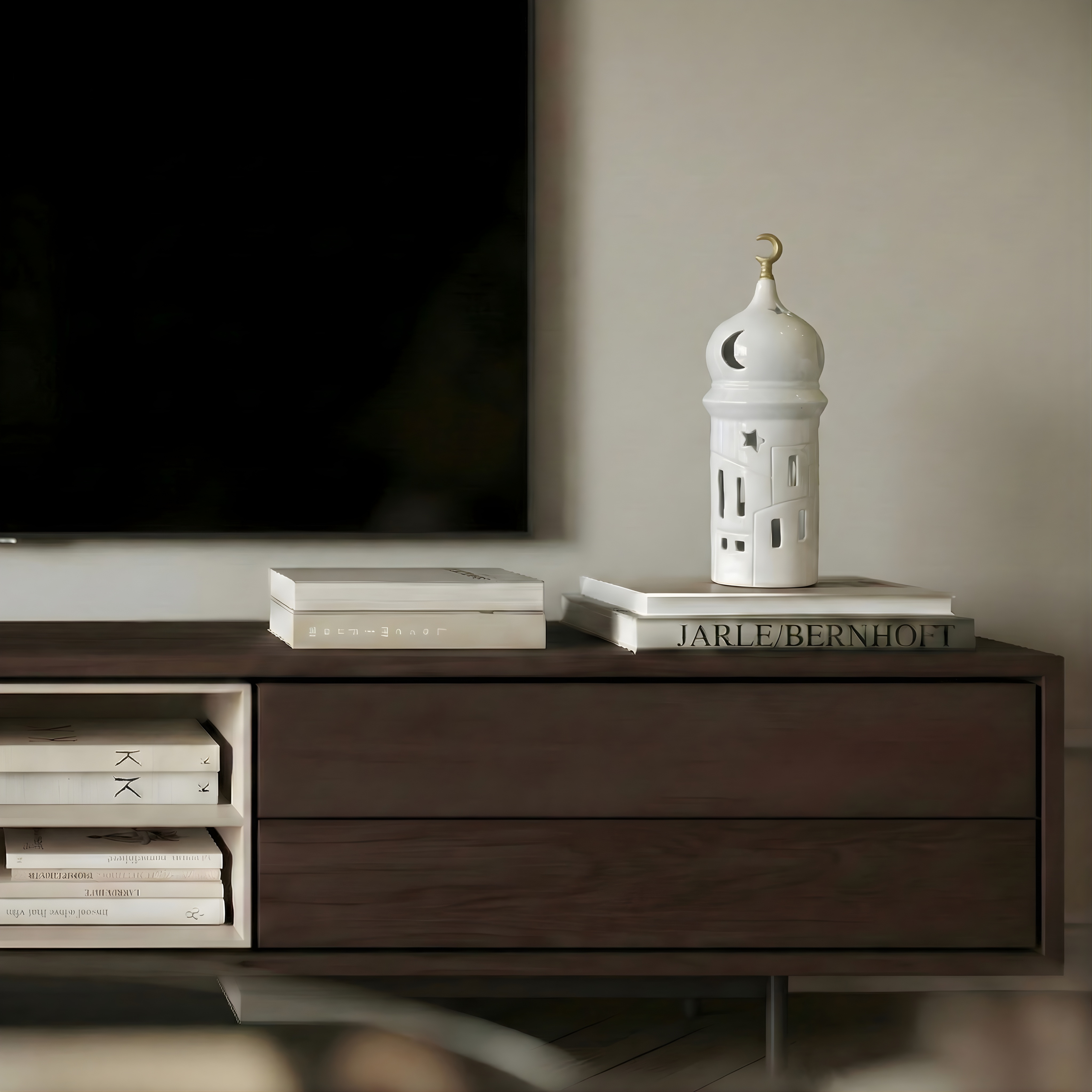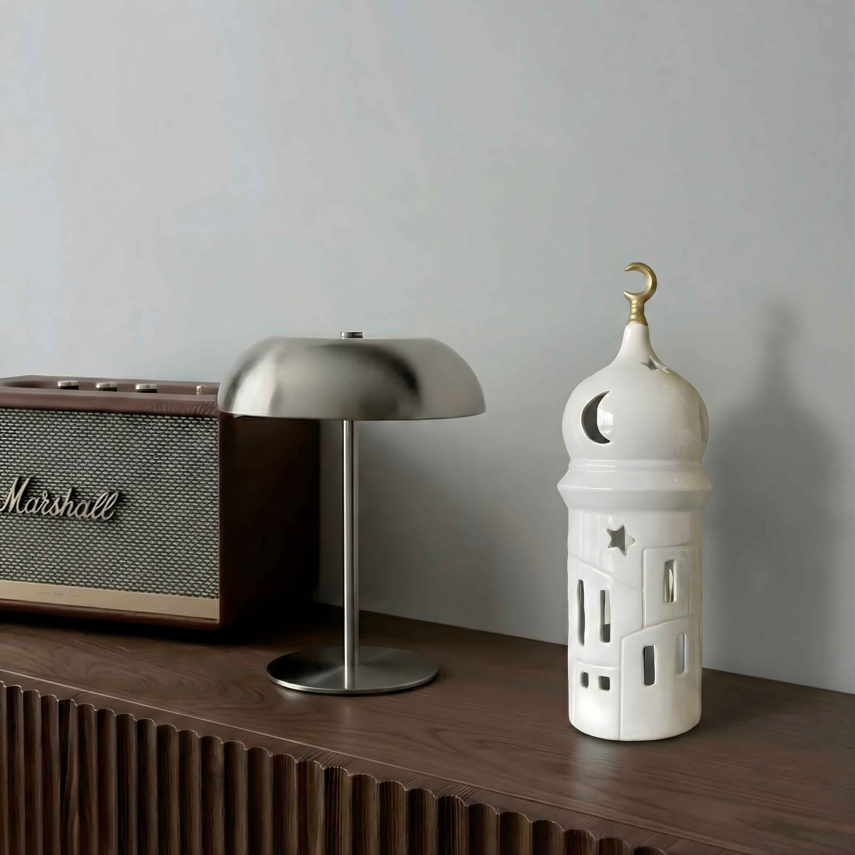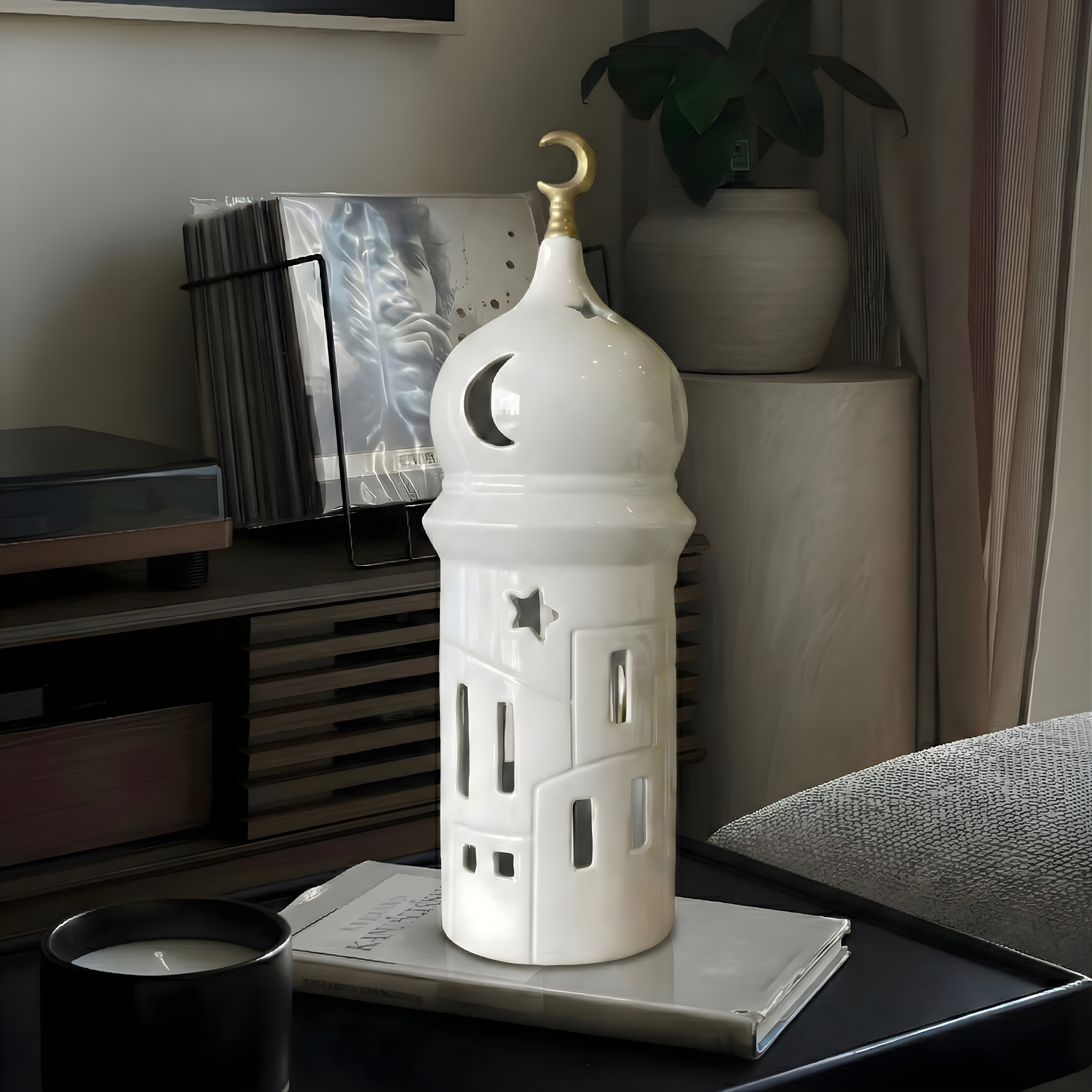 Soft ceramic curves paired with a subtle crescent, creating a calm Ramadan accent that fits effortlessly into any space.
