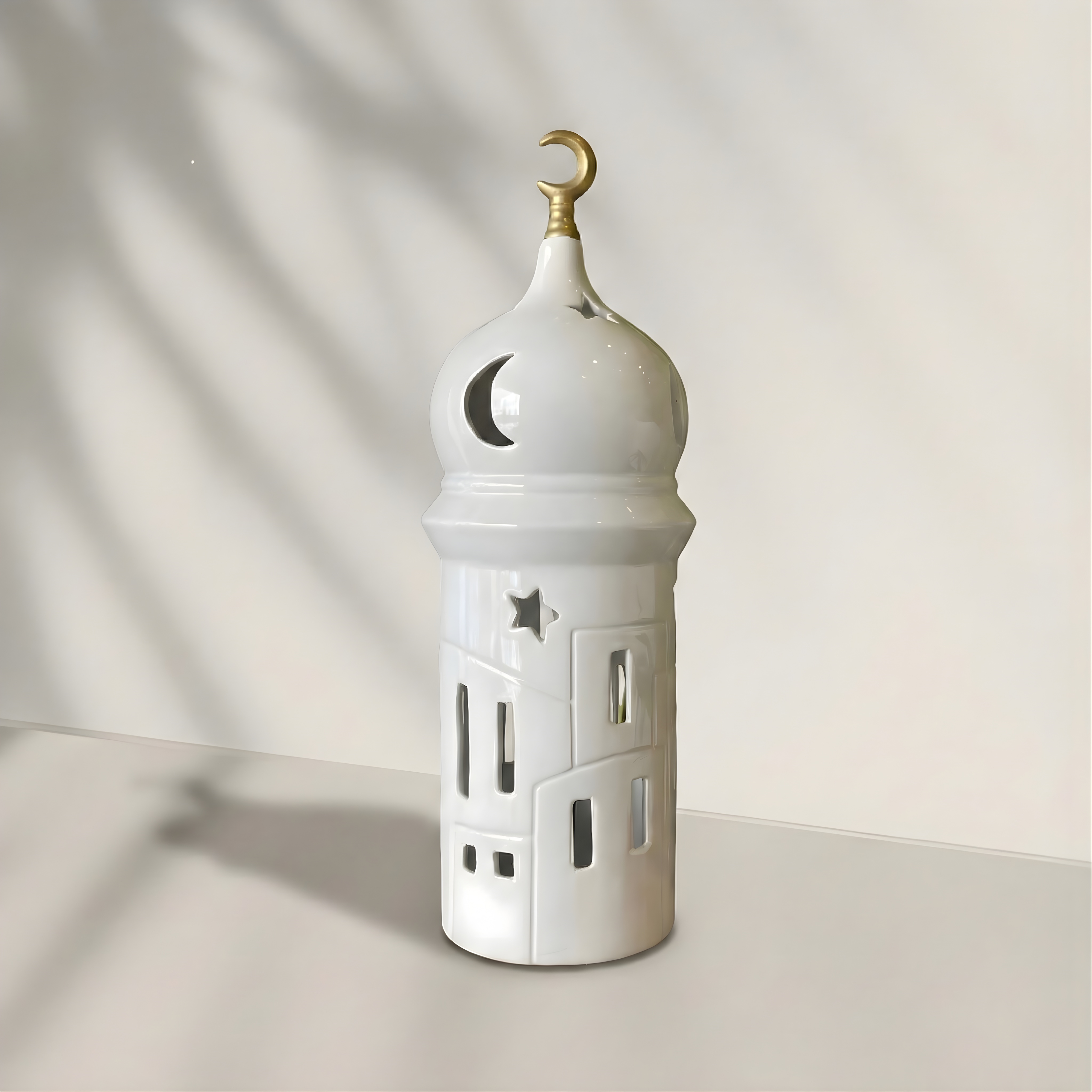 Inspired by architectural forms, this ceramic lantern combines a domed silhouette with subtle faΓ§ade-like details. The smooth white body is punctuated with small openings that create depth and rhythm, while the golden crescent crowns the piece with a restrained symbolic touch. The result is a balanced object that feels calm, refined, and timeless.
