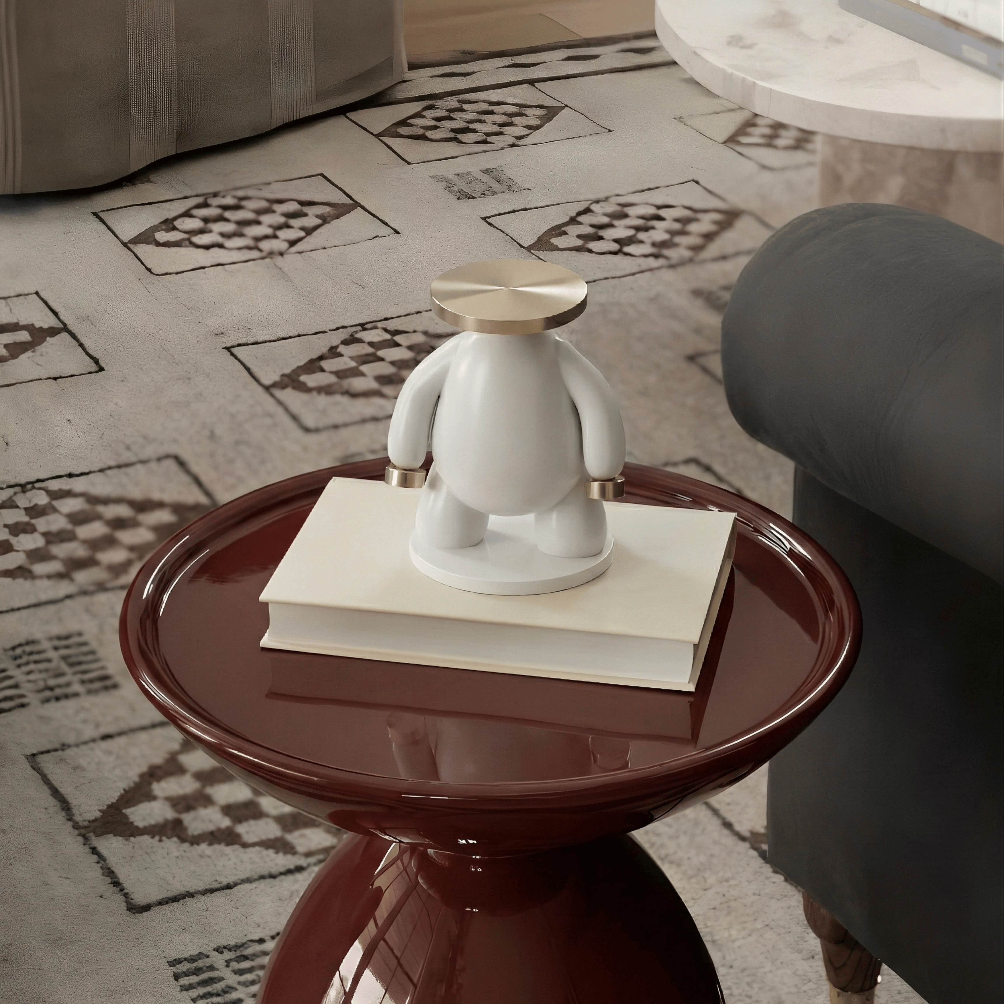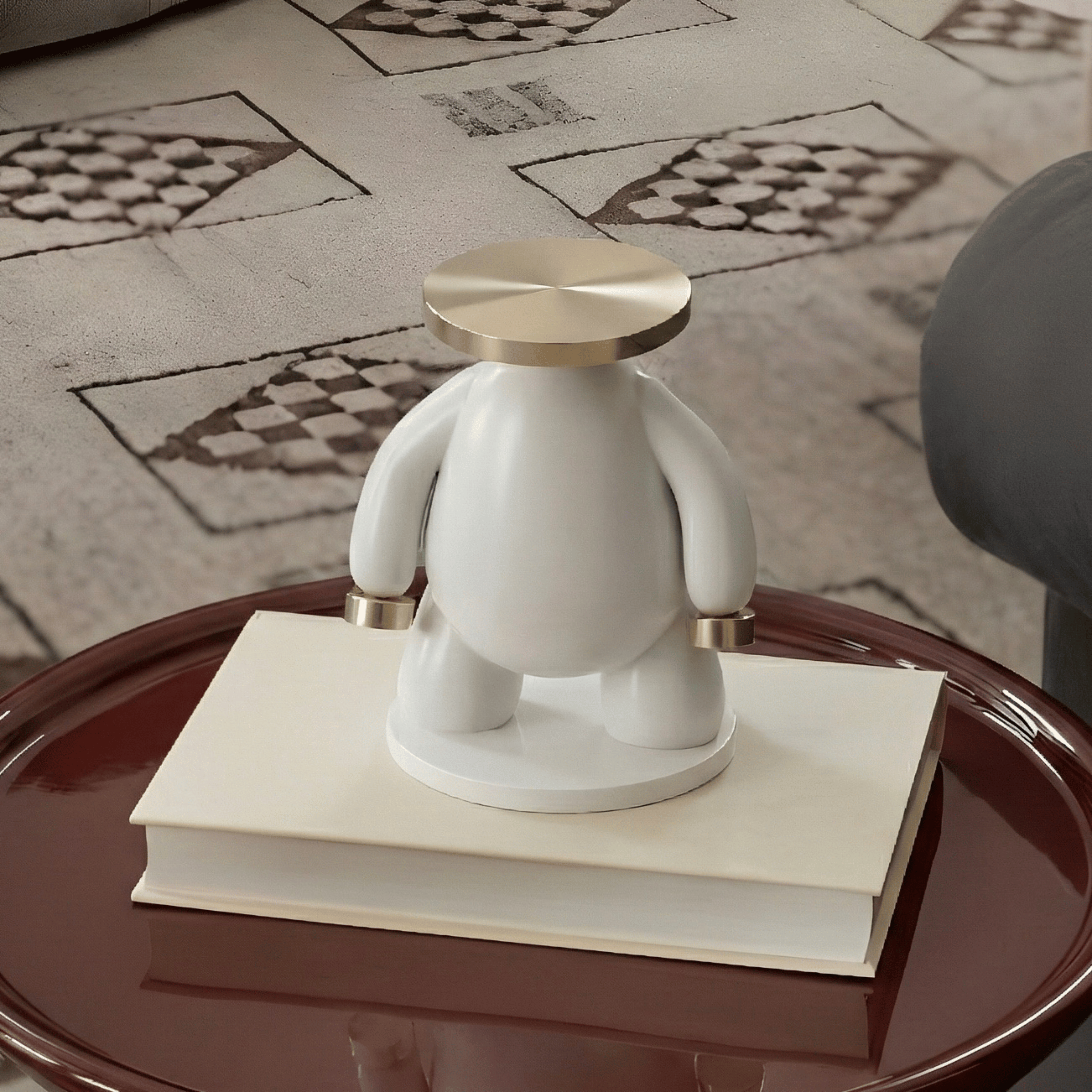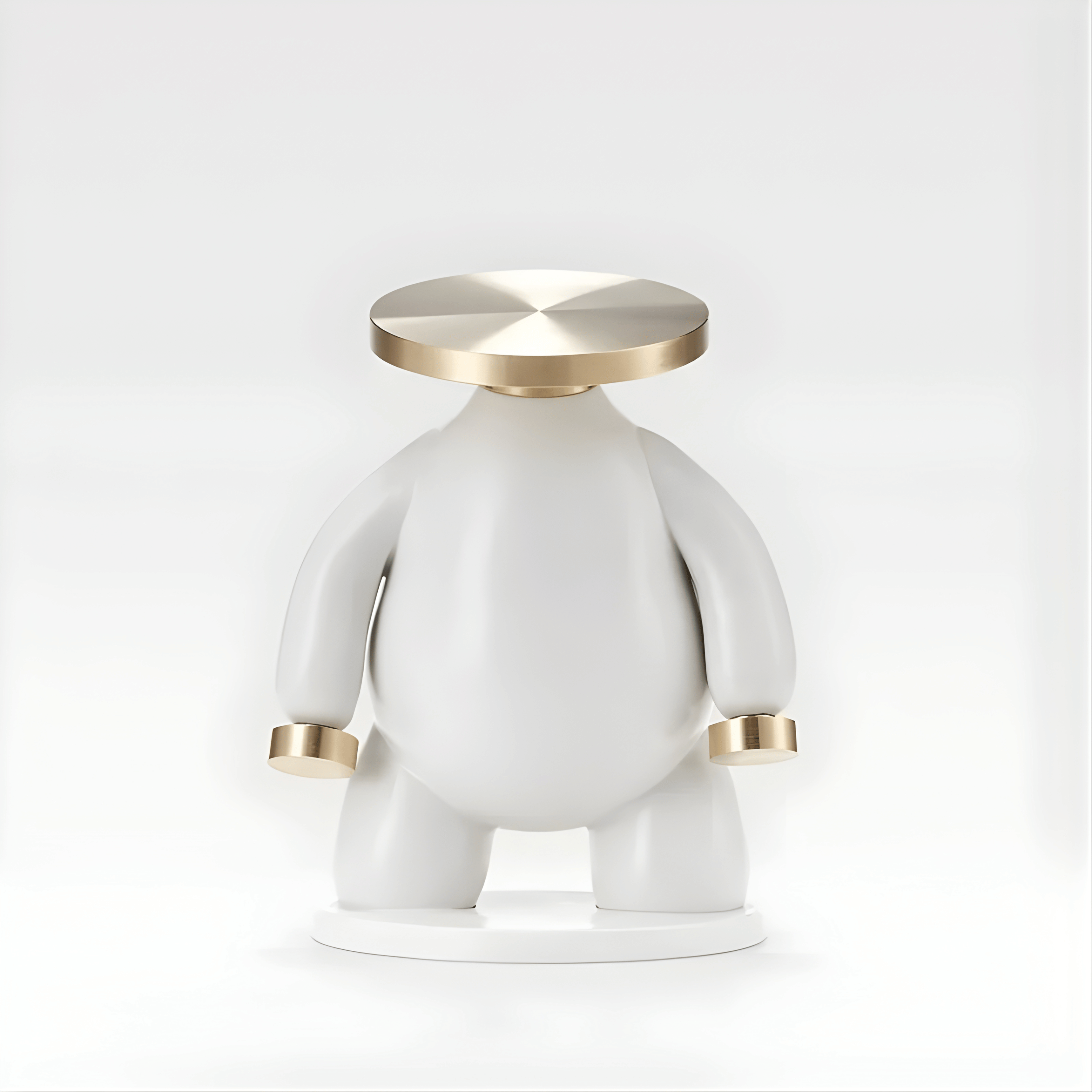 A minimalist sculptural piece defined by balance, symmetry, and refined contrast. The soft matte white body creates a calm, contemporary silhouette, while the brushed gold circular top introduces a bold architectural element. The proportions are intentionally simplified — rounded forms, clean lines, and a grounded stance — giving the piece a modern art-gallery presence.