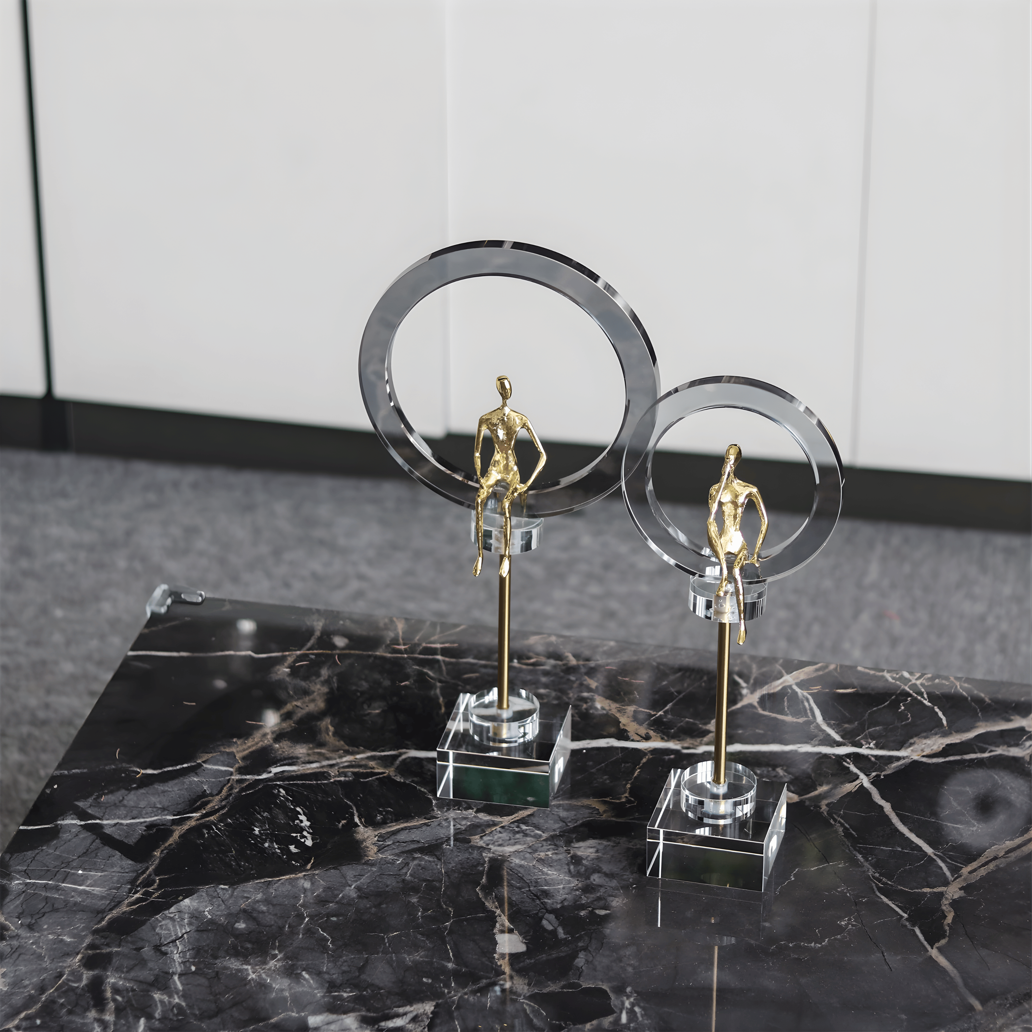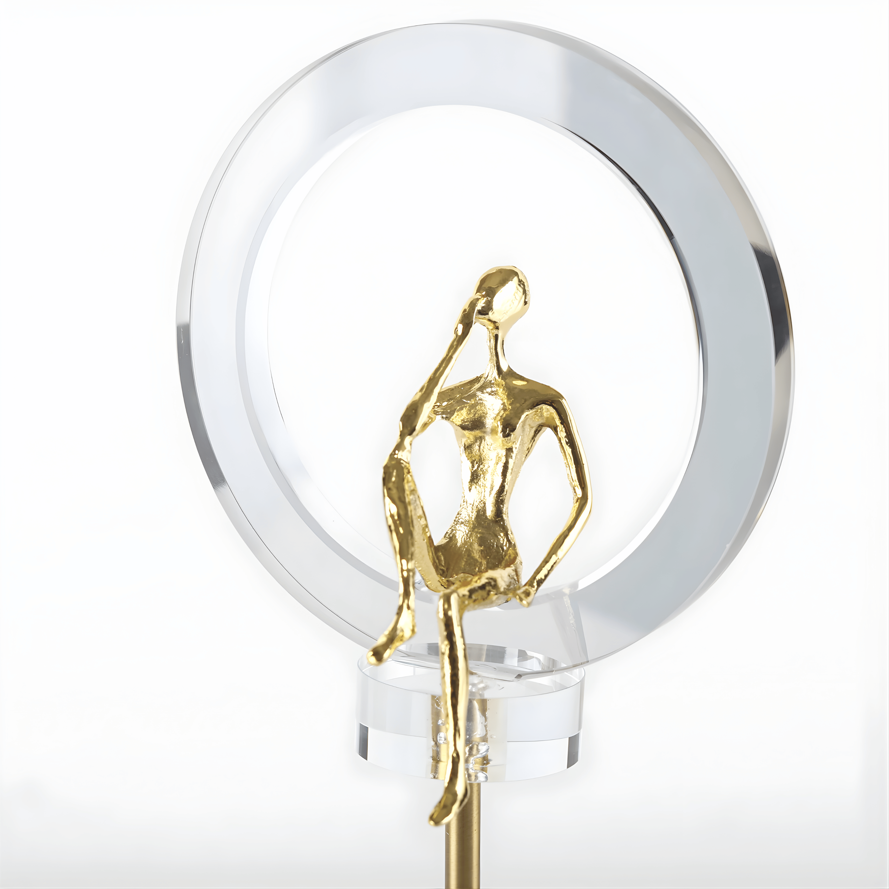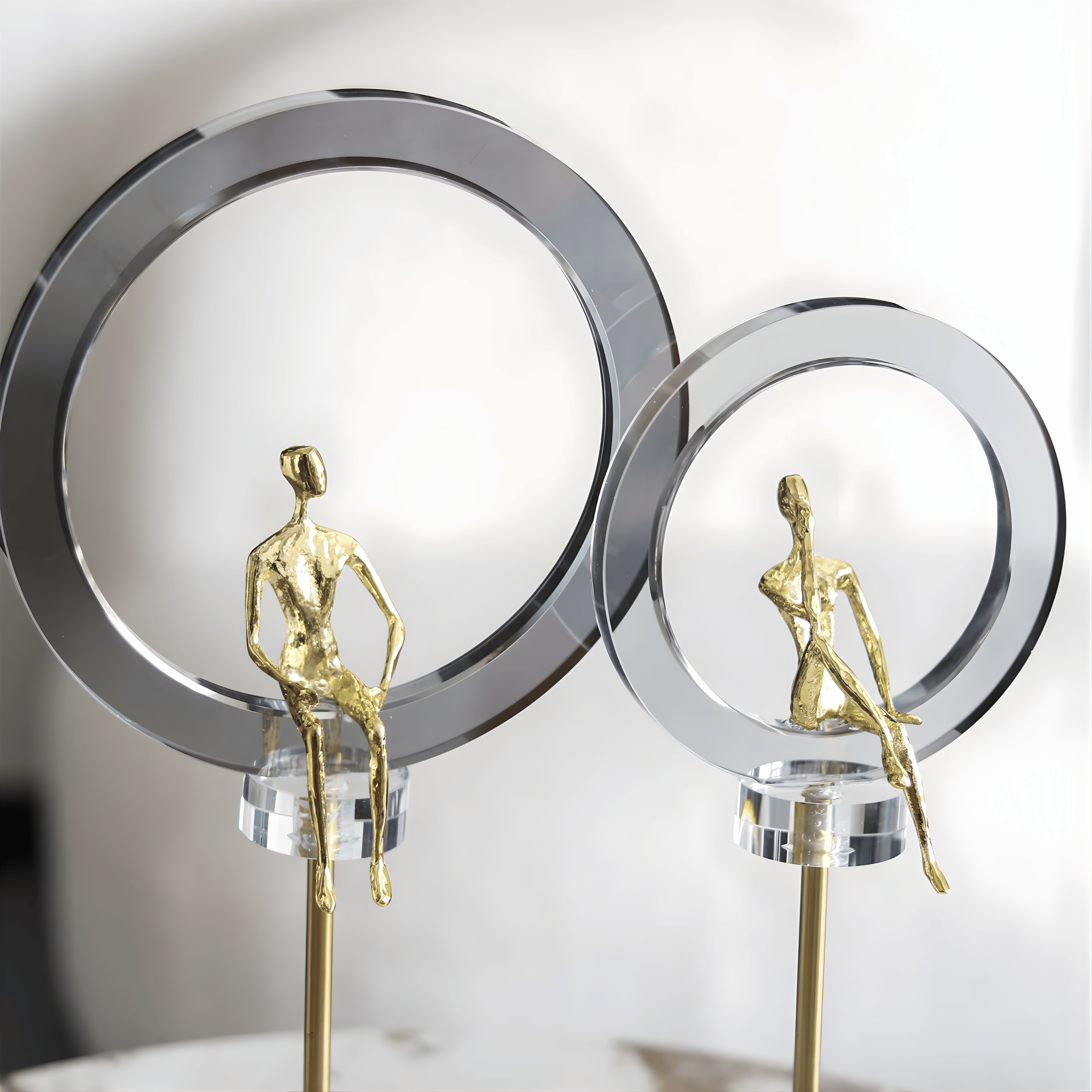 A refined sculptural composition where geometry meets human form. The transparent circular frames symbolize continuity and perspective, while the delicate golden figures introduce warmth and narrative depth. Elevated on a slim metallic stem and crystal-clear base, the piece balances lightness with architectural presence.